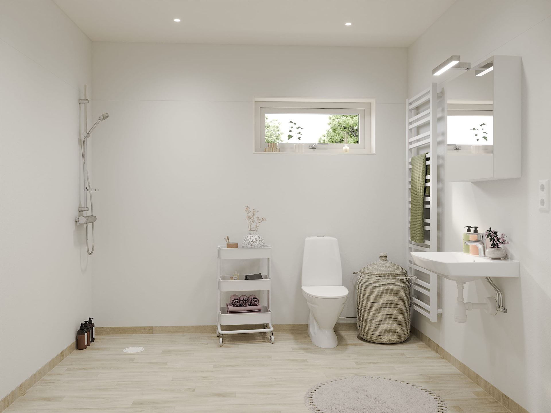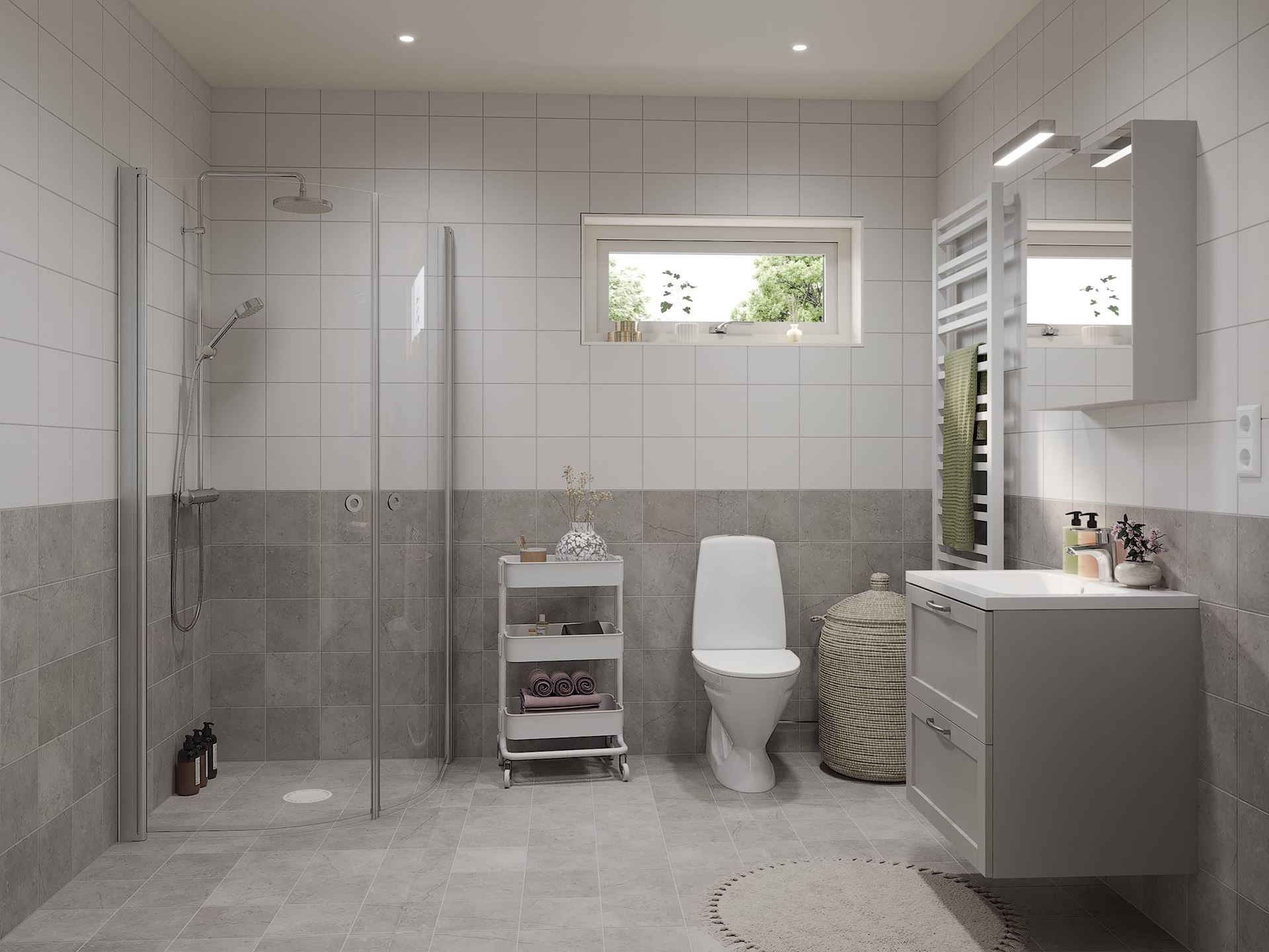 Från start ingår våtrumsgolv och våtrumsväggmattor från Tarkett, du får själv välja stilen du önskar. Spegelskåp med belysning, duschset, toalett och tvättställ ingår också – liksom en härlig handukstork.