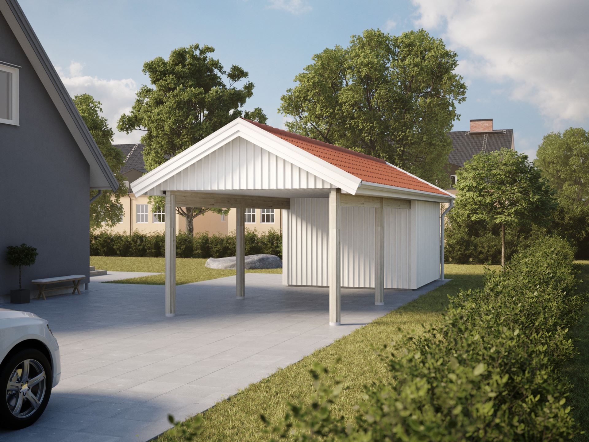 För dig som gillar att hålla det enkelt: en öppen carport med ett rymligt förråd på 10,6 m². Förrådet har förstås en egen dörr och om du vill ha lite mer ljusinsläpp finns även möjlighet att få ett fönster på baksidan. Här kan du välja mellan stående och liggande panel för att matcha huset på bästa sätt.