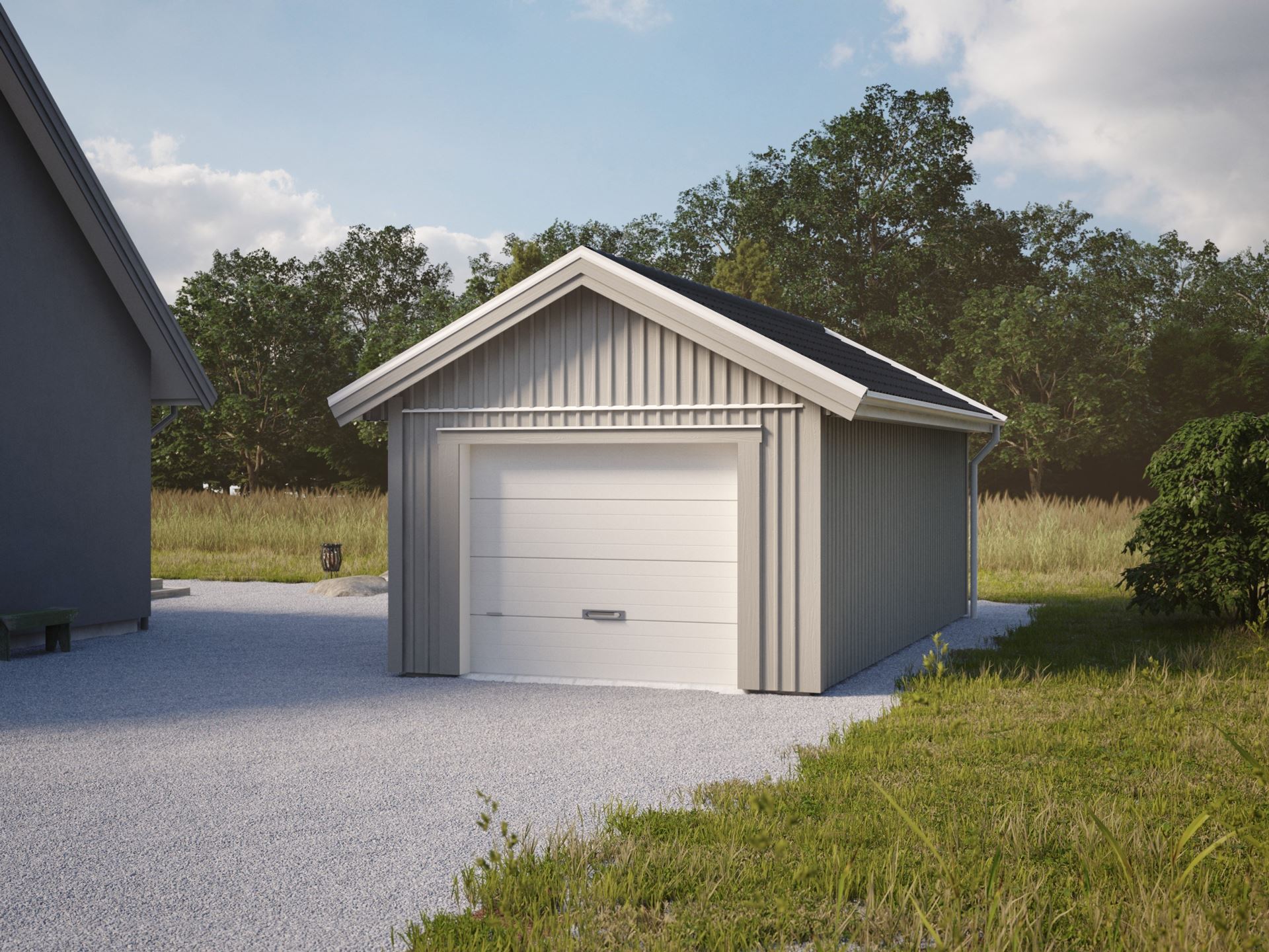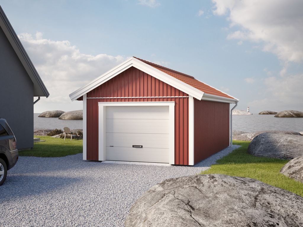 Säg hej till ett enkelgarage i smidigt format där bilen får strax över 24 m² att trivas på. Komplett med garageport och sidodörr – här finns även möjlighet att få ett fönster på baksidan. Du väljer själv om du vill ha stående eller liggande panel på ditt garage.