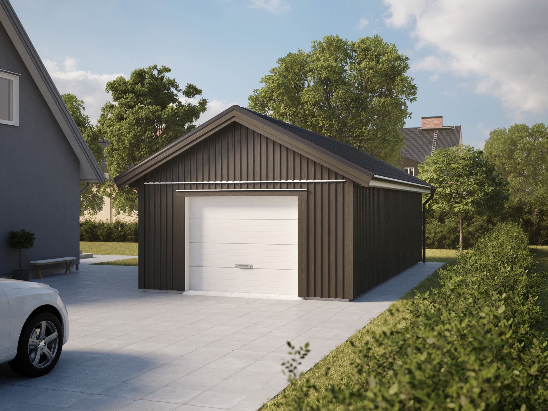Ett garage för dig som vill ha det lilla extra. Låt oss presentera ett rejält enkelgarage med möjlighet att fixa en stor förrådsdel längst in. Den totala ytan invändigt är hela 44 m². Garageport och sidodörr ingår, och det finns möjlighet att sätta in ett fönster på baksidan. Stående eller liggande panel – det väljer du.