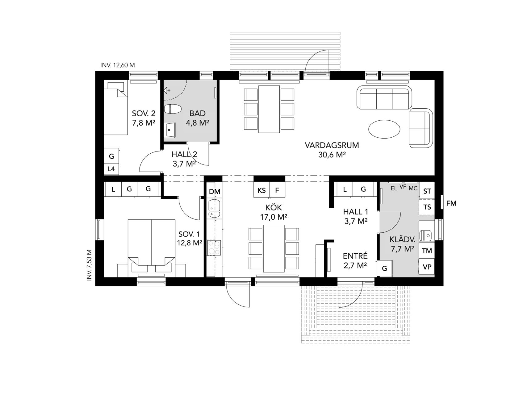 Mittskeppet i huset utgör samvaroytor, den avskärmade men öppna entrén ger ett härligt välkomnande och möjlighet till en extra förvaring i nischen.