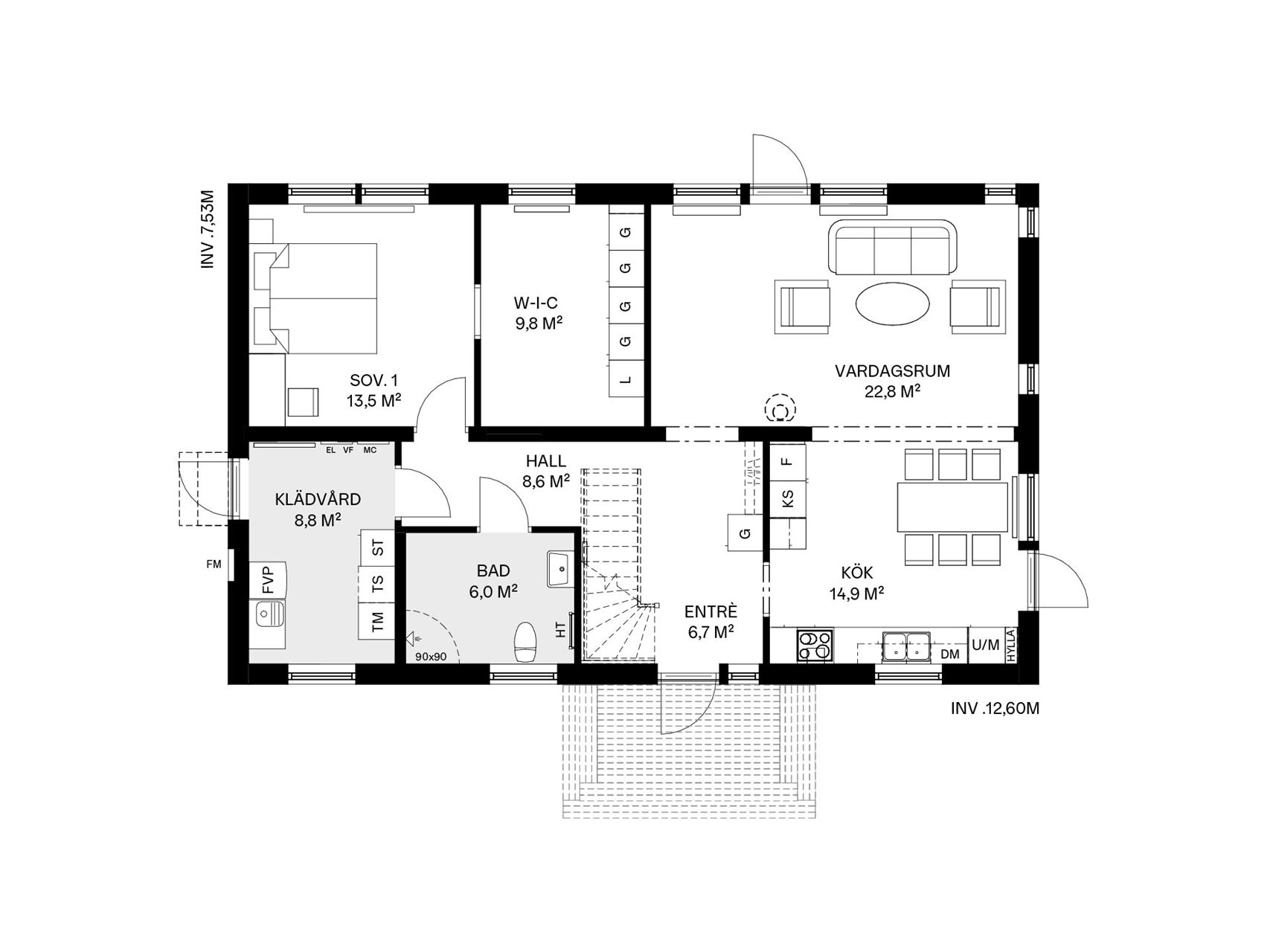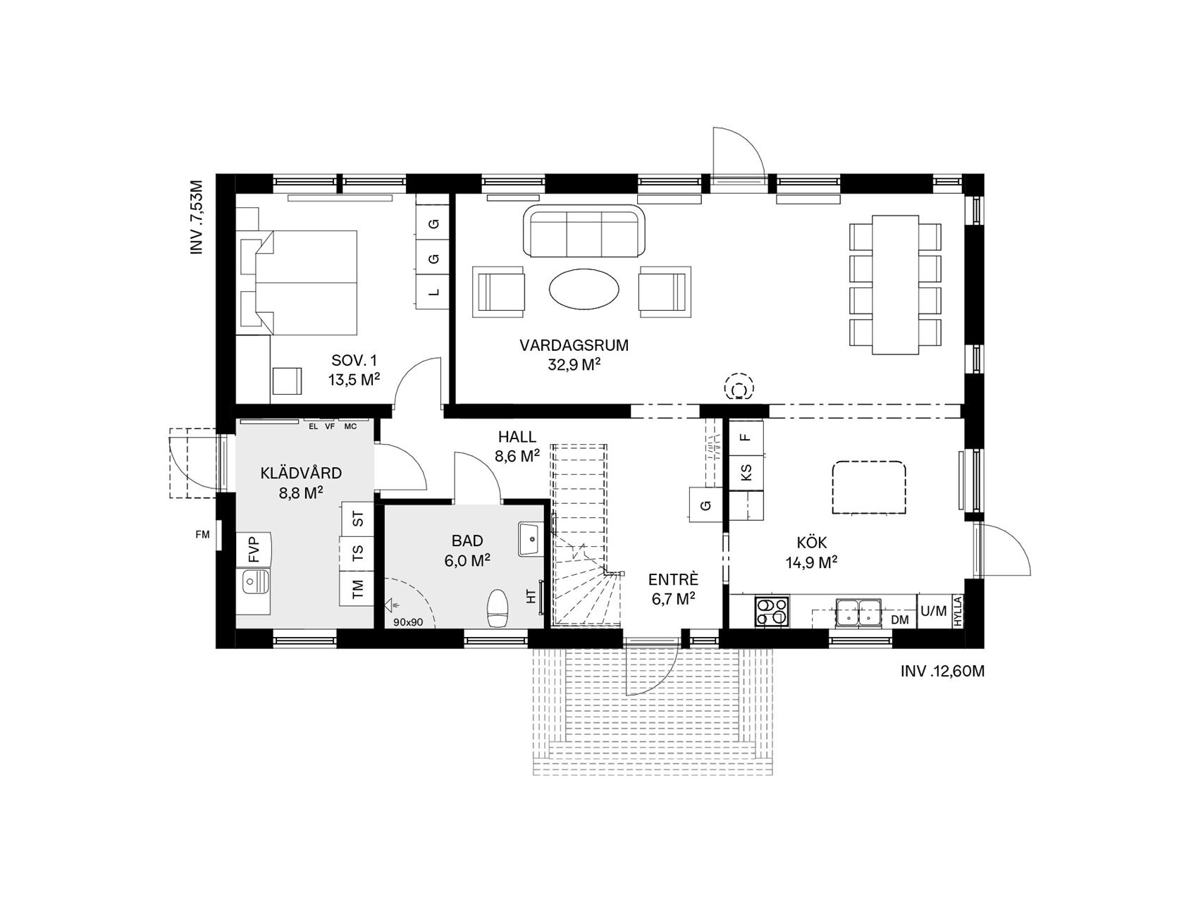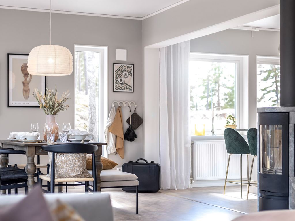 Direkt i entrén möts du av ljuset och en fin genomsikt till andra sidan av huset. Fortsätter vi rakt fram hamnar vi i den ljusa, härliga vardagsrumsdelen. Tar vi till vänster kommer vi istället köksvägen in i den sociala härligheten. Både kök och vardagsrum har varsin utgång till trädgården, eller kanske till din blivande altan?