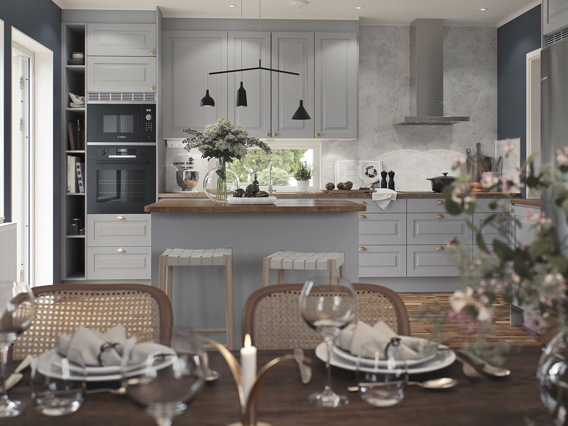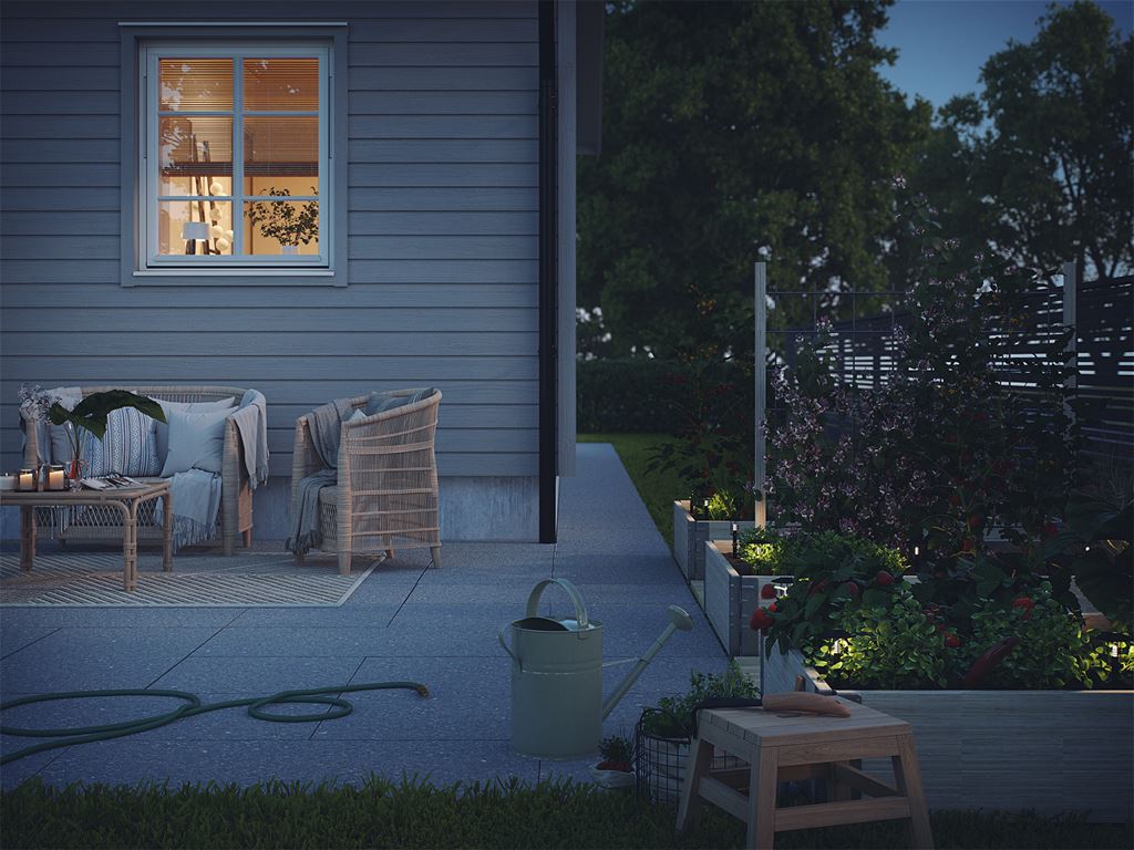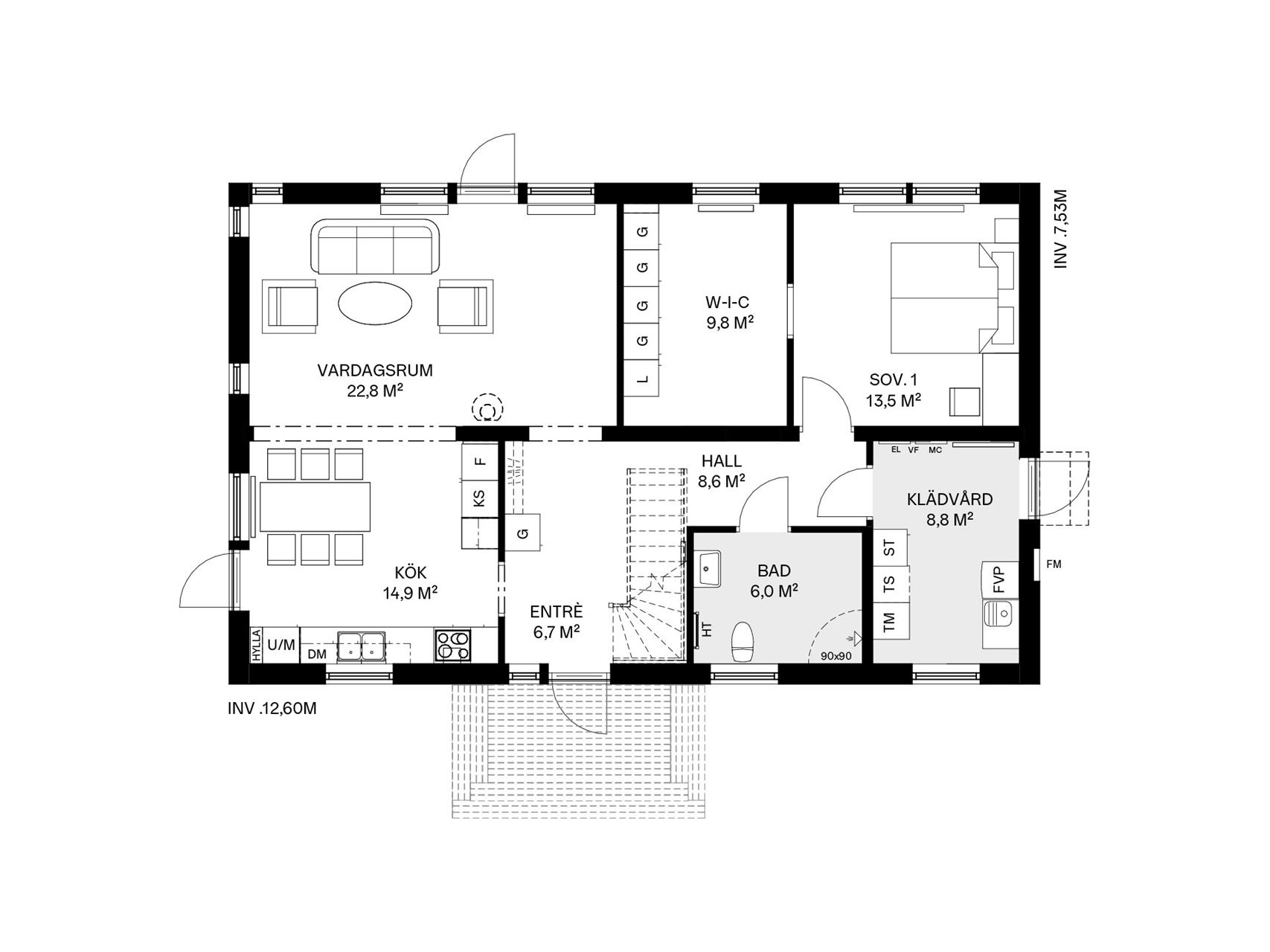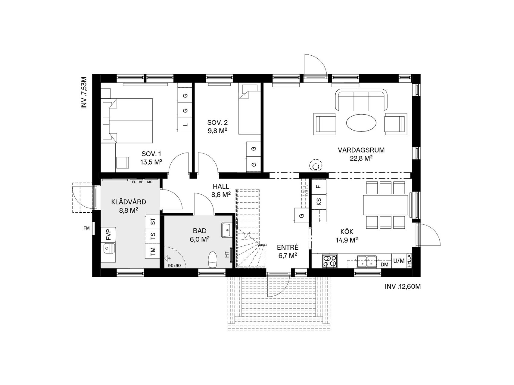 Direkt i entrén möts du av ljuset och en fin genomsikt till andra sidan av huset. Fortsätter vi rakt fram hamnar vi i den ljusa, härliga vardagsrumsdelen. Tar vi till vänster kommer vi istället köksvägen in i den sociala härligheten. Både kök och vardagsrum har varsin utgång till trädgården, eller kanske till din blivande altan?