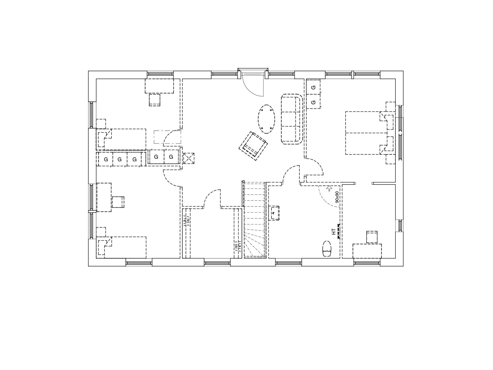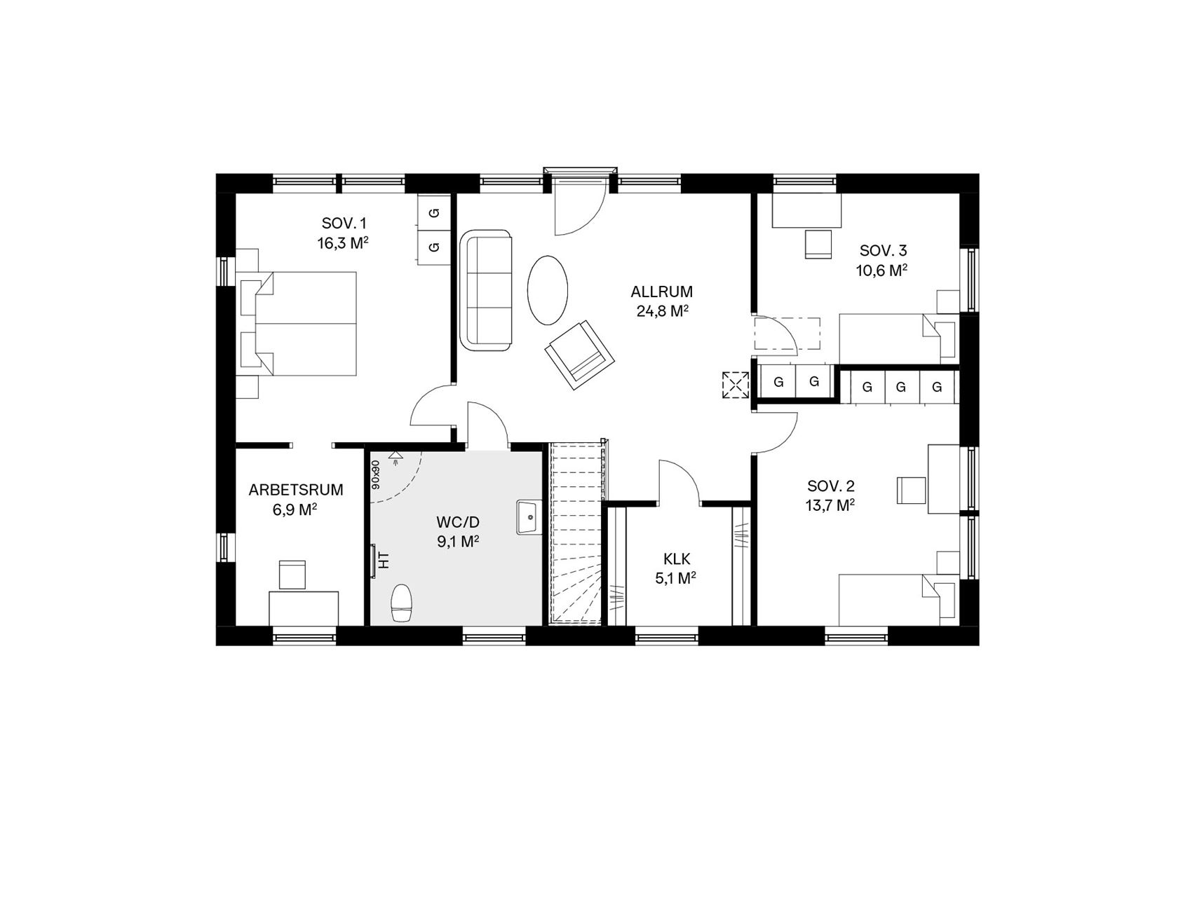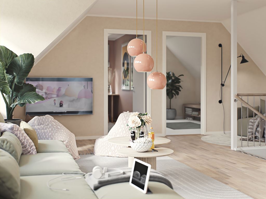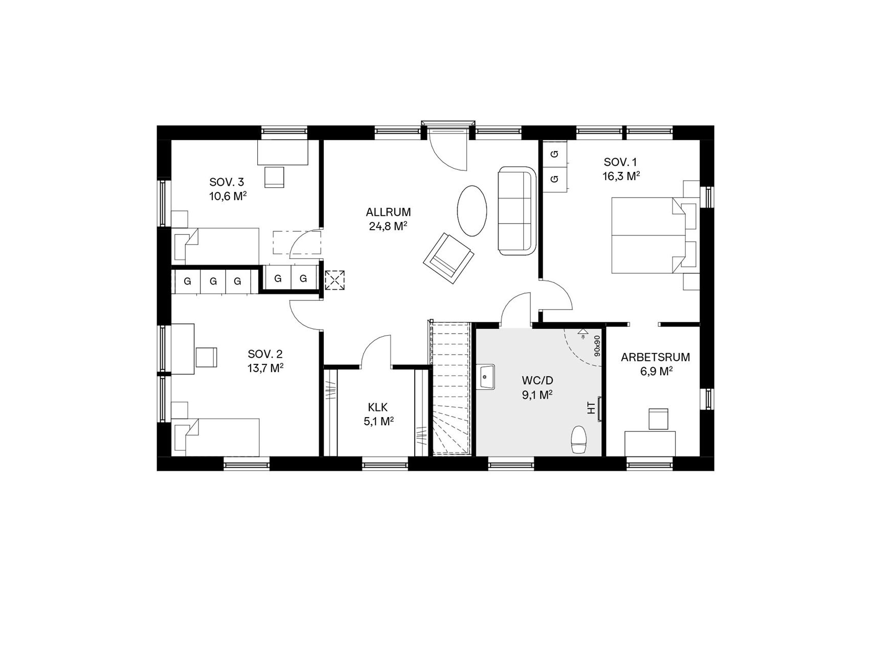 Andra halvan av Villa Huskvarna innehåller som standard två sovrum, badrum och ett generöst klädvådsrum med egen entré. Men här finns också fina planlösningsalternativ att välja mellan. Till exempel att ta bort det mindre sovrummet i utbyte mot ett ännu större vardagsrum – eller att göra om det till en riktigt lyxig walk-in-closet. Sedan fortsätter möjligheterna en trappa upp. När du inreder övervåningen dubblar du boytan till hela 190 m2 – och kan du få plats med till exempel ytterligare tre sovrum, badrum och allrum med plats för arbetsplats. Eller vad du nu önskar dig. Som standard inreder du övervåningen när du vill, och som du vill. Som tillval kan du få den inredd från start.
