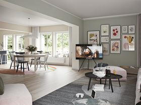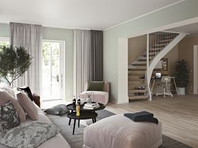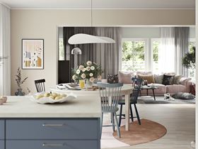 I Villa Lekeryd finns gott om rum för det ljuva familjelivet. Du välkomnas av en stor entré med utsikt rakt genom huset och plats för både kläder, barnvagn och varma vantar. Som standard ligger barnrummet mitt i huset. Här är det både nära till att smita in till föräldrarnas sovrum – och till att leka tafatt i den öppna planlösningen för kök, vardagsrum och matplats som sträcker sig ut i husets fina vinkeldel.