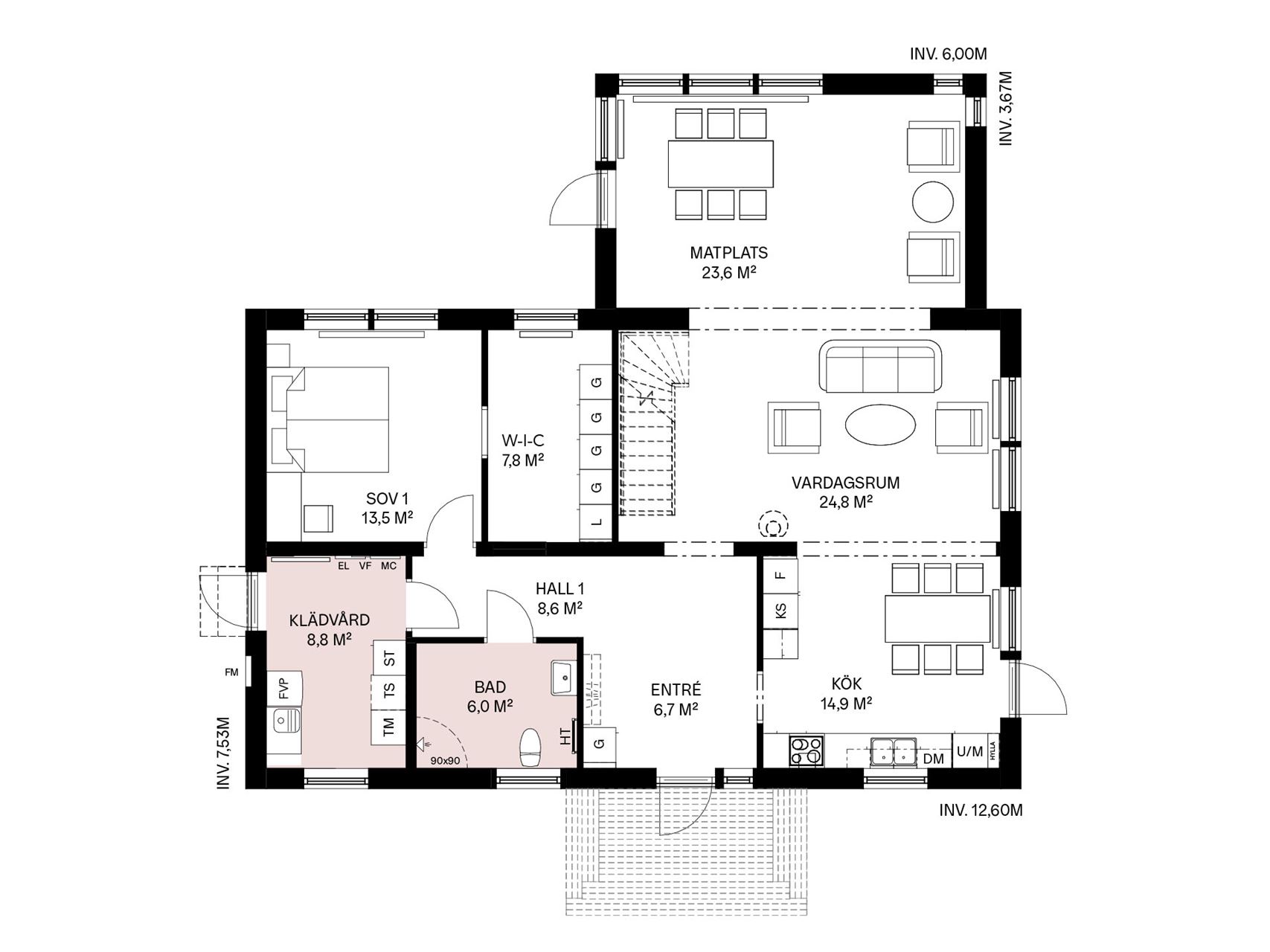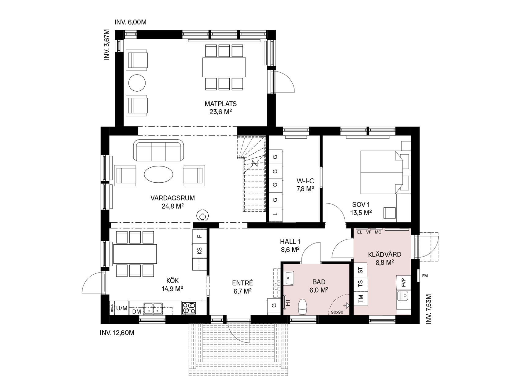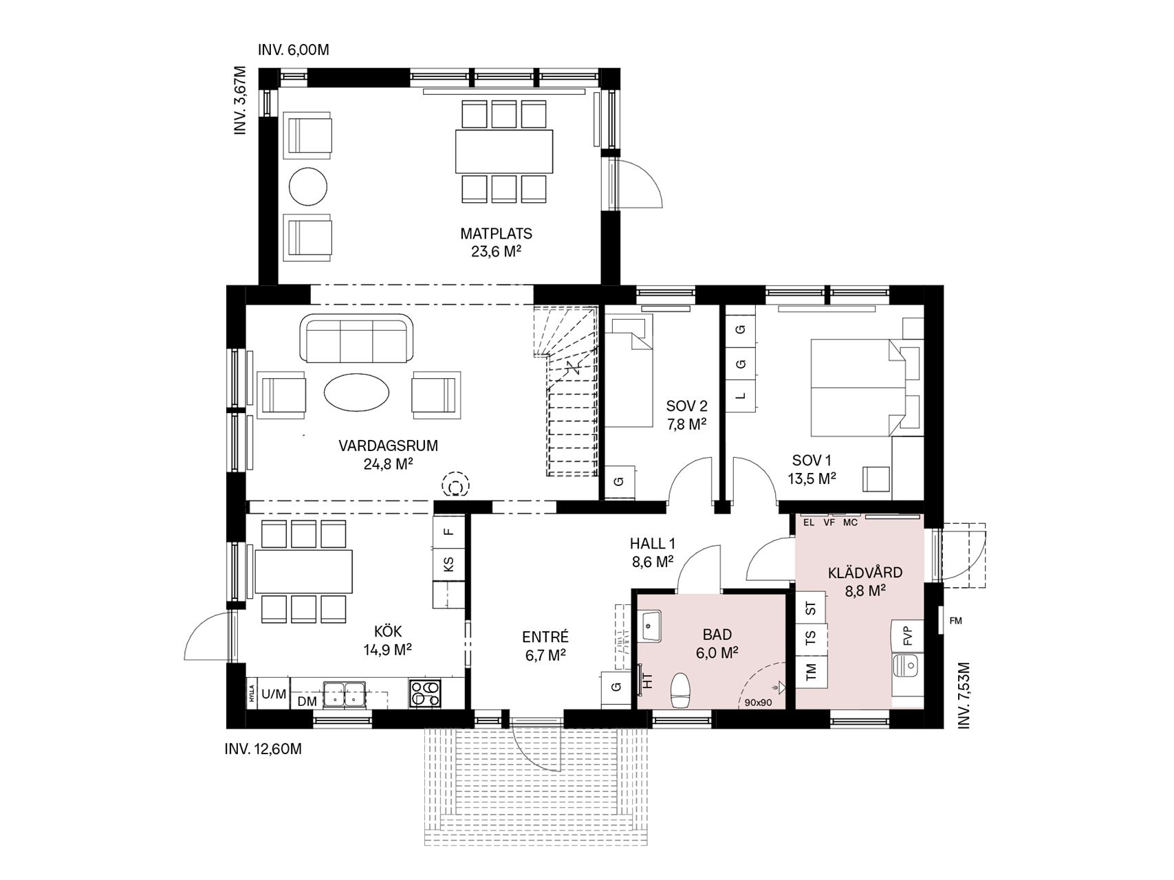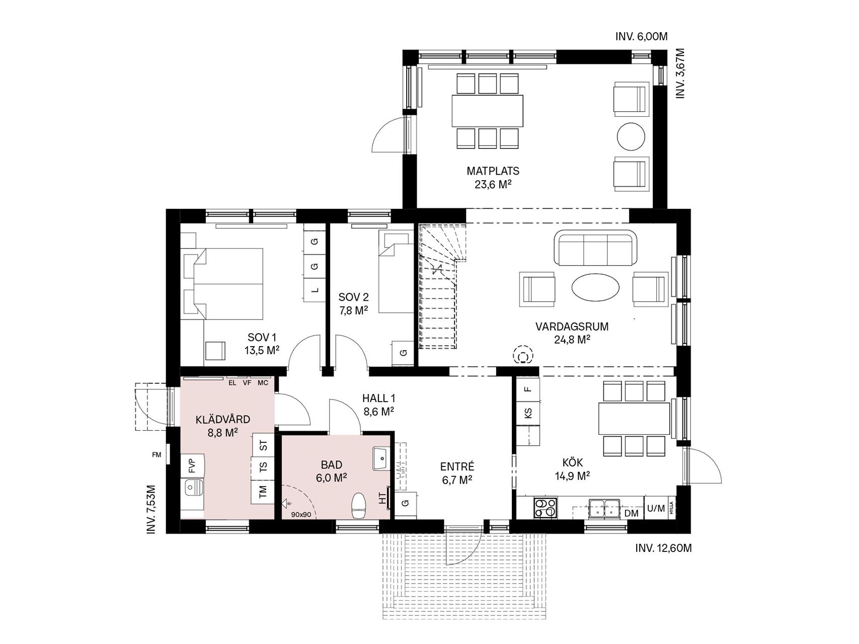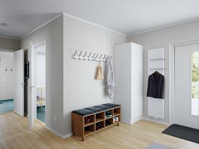 Naturligtvis har Villa Lekeryd även rum för det praktiska i tillvaron, som badrum och ett kanonfint klädvårdsrum med egen entré. Villa Lekeryd bjuder på flera fina planlösningsalternativ redan på entrévåningen, i vinkeln kan du till exempel skapa ett tredje sovrum. Och sedan, när du inreder din övervåning, kan något riktigt magiskt hända. Då ökar du din boyta till 195 m² – och simsalabim: ditt 1,5-planshus kan plötsligt rymma hela 10 rum och kök.