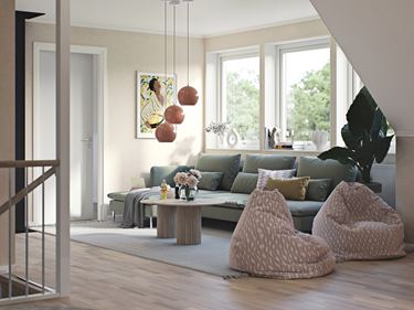Vid sidan av husets sociala nav erbjuder entrévåningen ett lugnt och luftigt sovrum med gott om garderober, ett badrum och ett fint klädvårdsrum med praktisk groventré. Och när du sedan vill ha mer av allt det goda är det bara att hugga in på att inreda övervåningen. Här kan du till exempel får plats med tre sovrum, ytterligare ett badrum och ett redigt allrum – eller vad du nu önskar dig.