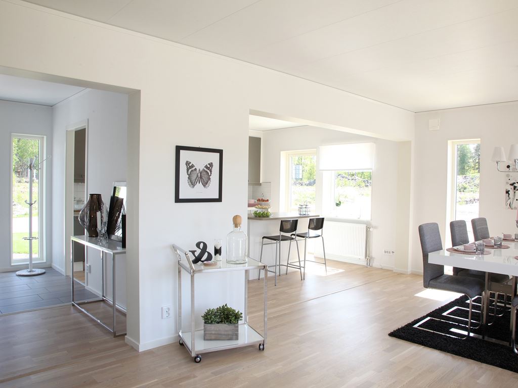 Villa Tingsryd är ett av våra större 1-planshus med gott om plats för ordning och reda! 47 härliga kvadratmeter öppnar upp sig i ett fantastiskt samband mellan kök, vardagsrum och matplats. Här ryms både köksbord, soffa och matgrupp.