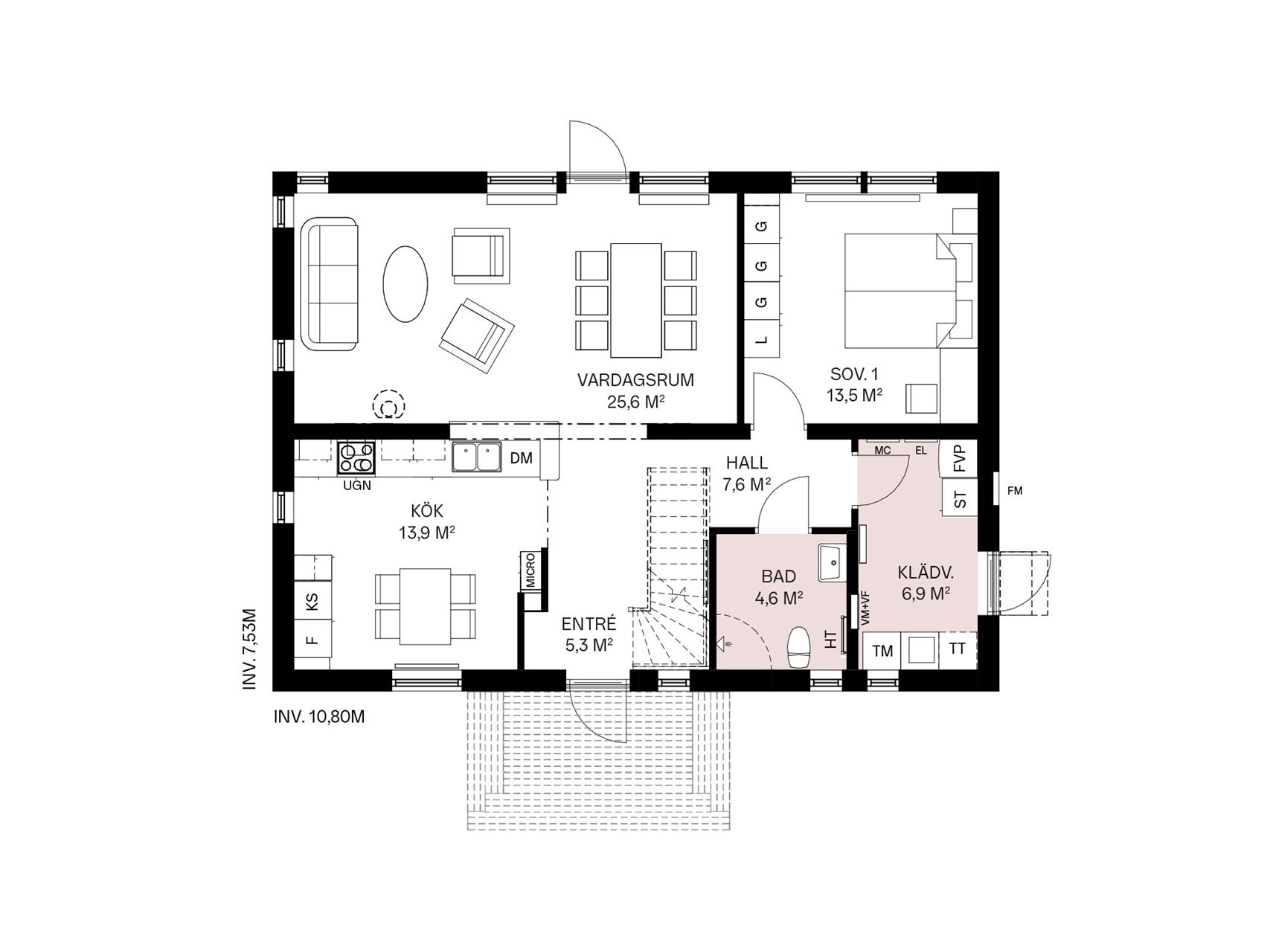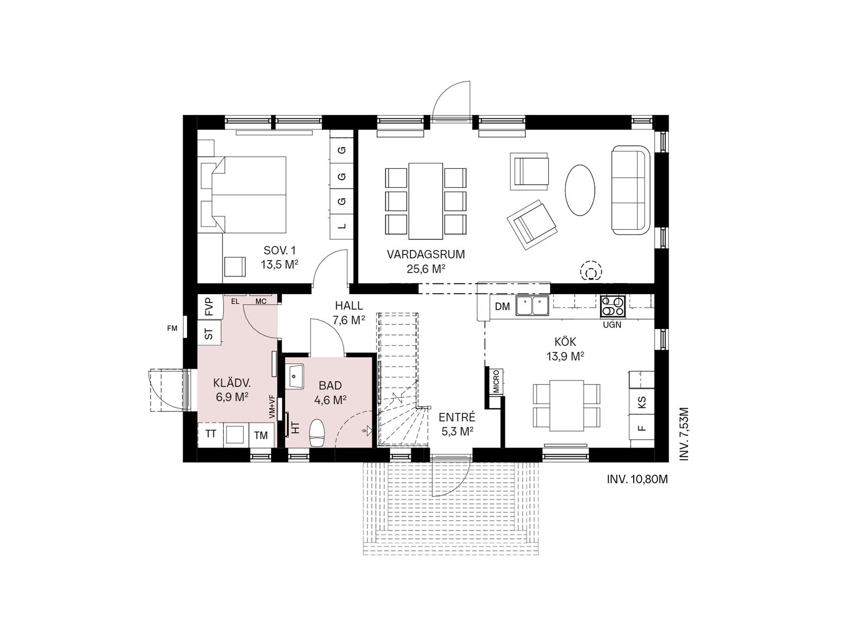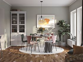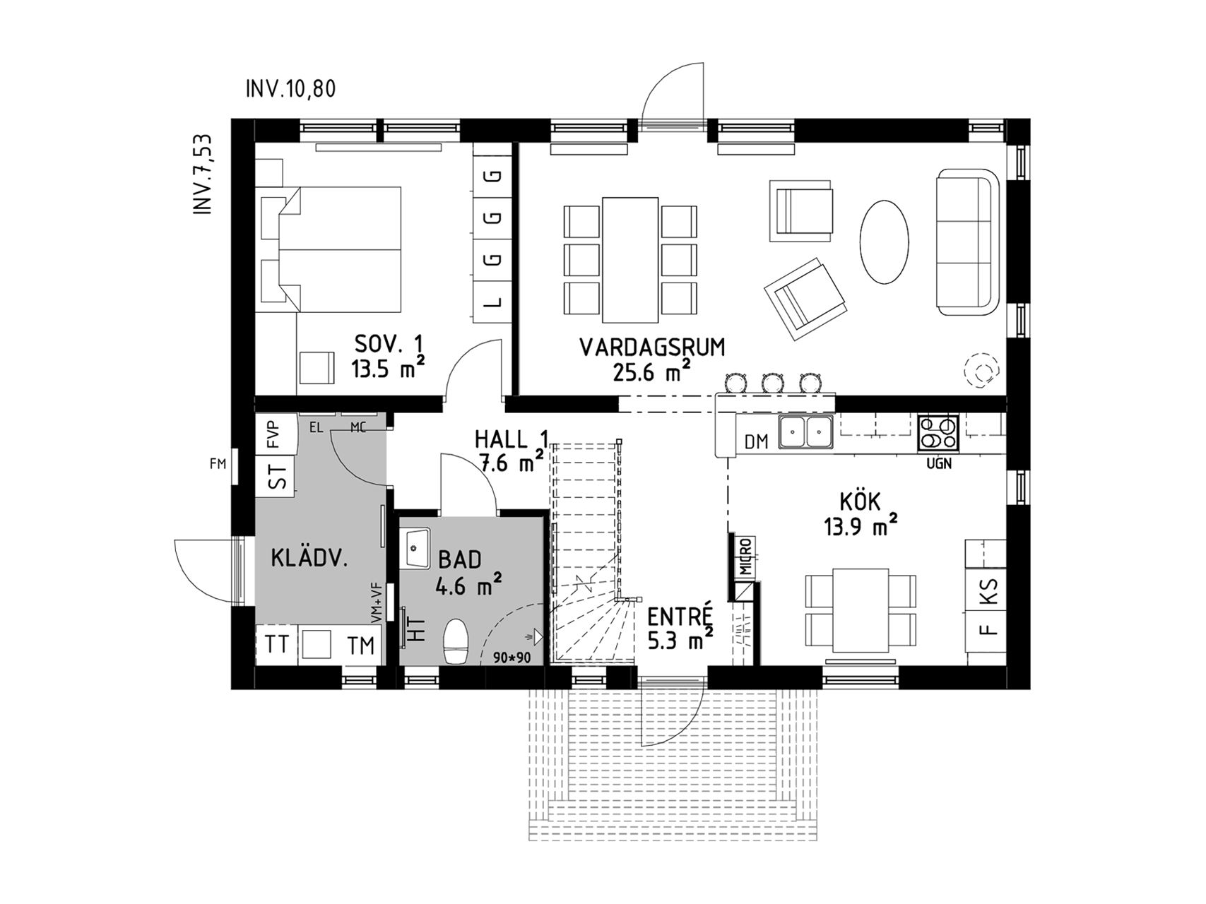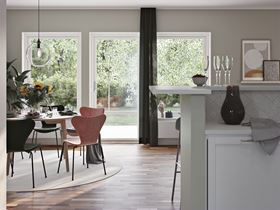 Letar du efter en kalasbra planlösning? Entré, kök och vardagsrum flyter samman och bildar en social yta för familj och vänner. Perfekt för att umgås!