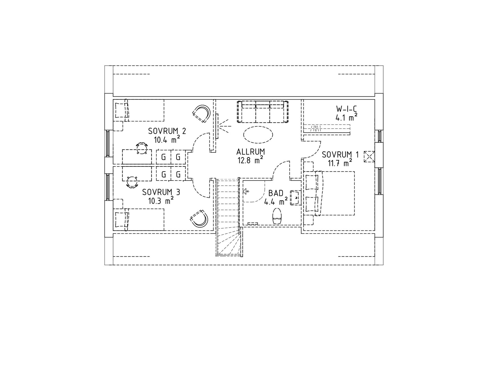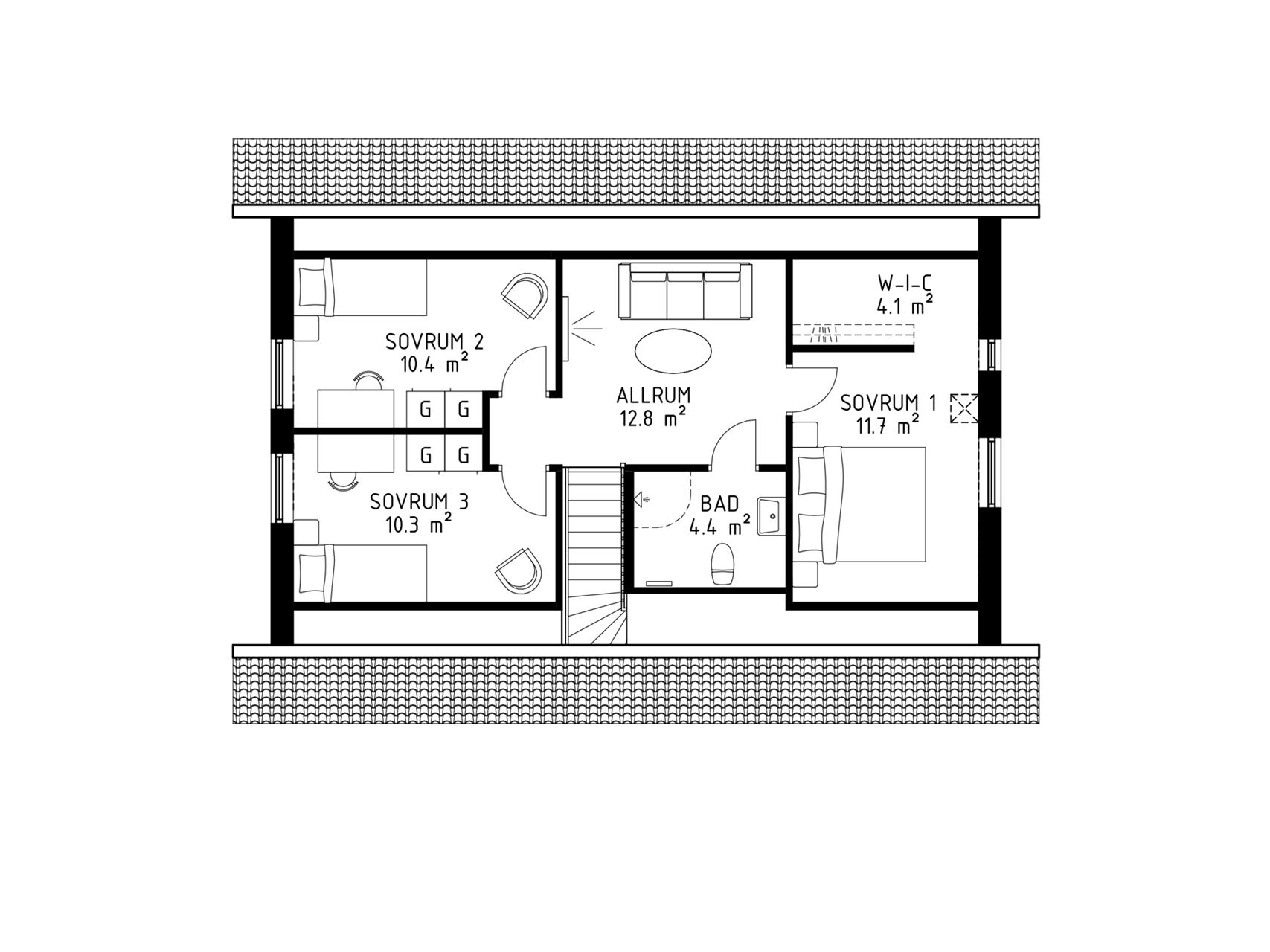Som standard får du själv inreda din övervåning, när och hur du vill. Gillar du vårt förslag? Då kan du välja det som tillval, se nästa bild.
