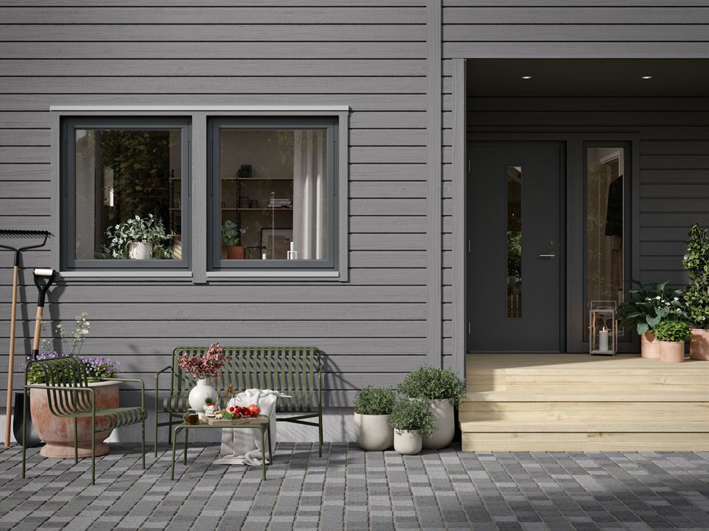 Om du drömmer om ett hus med modern och stilren känsla väljer du fönster utan spröjs, och siktar på att matcha fasaden – alltså att välja färg som jobbar ton-i-ton eller kanske rent utav helt monokromt. Här är grå nyanser på fönster ett populärt val, de smälter så fint samman med fasader i grått – liksom med andra jordnära fasadkulörer vi gillar så mycket just nu. För att ytterligare förstärka det rena uttrycket: låt gärna fönstrens foder få samma kulör som fasaden.