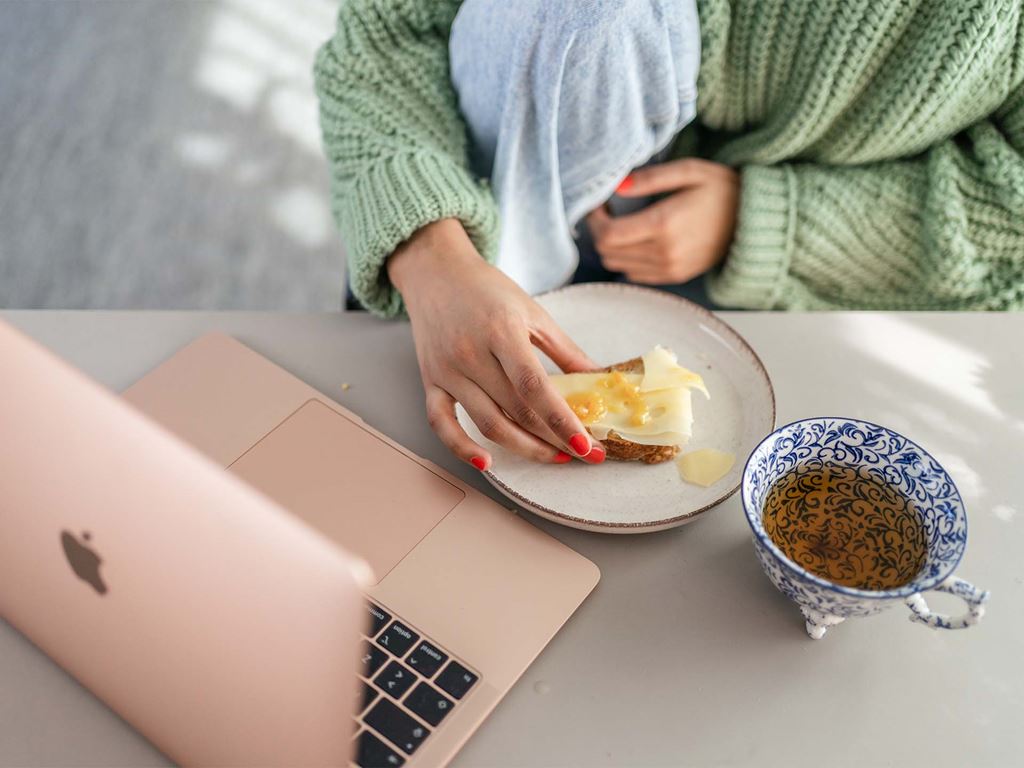Kvinna funderar på att stycka av tomr när hon äter frukost