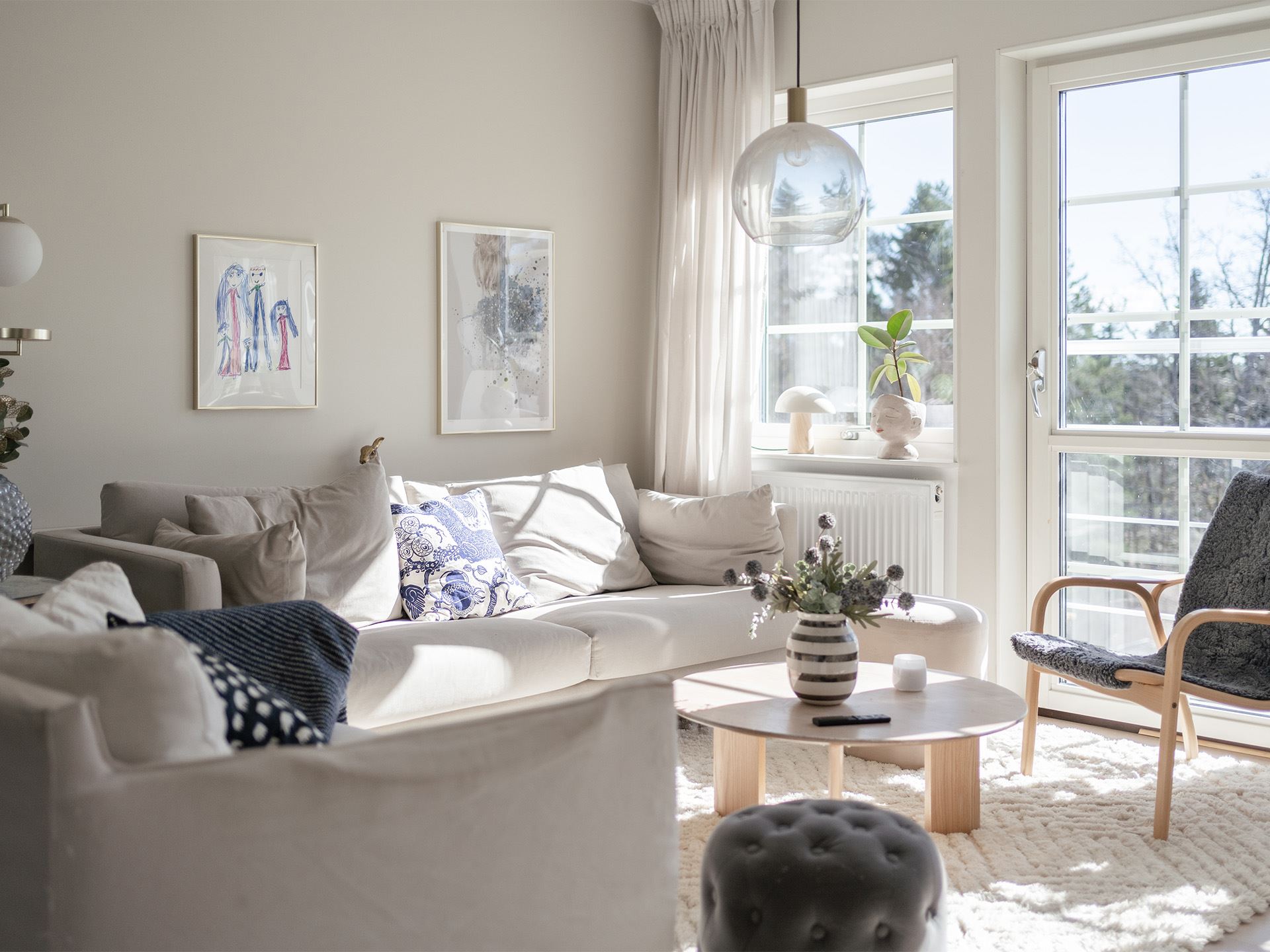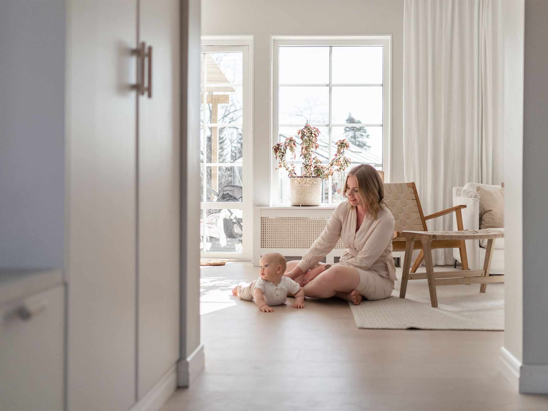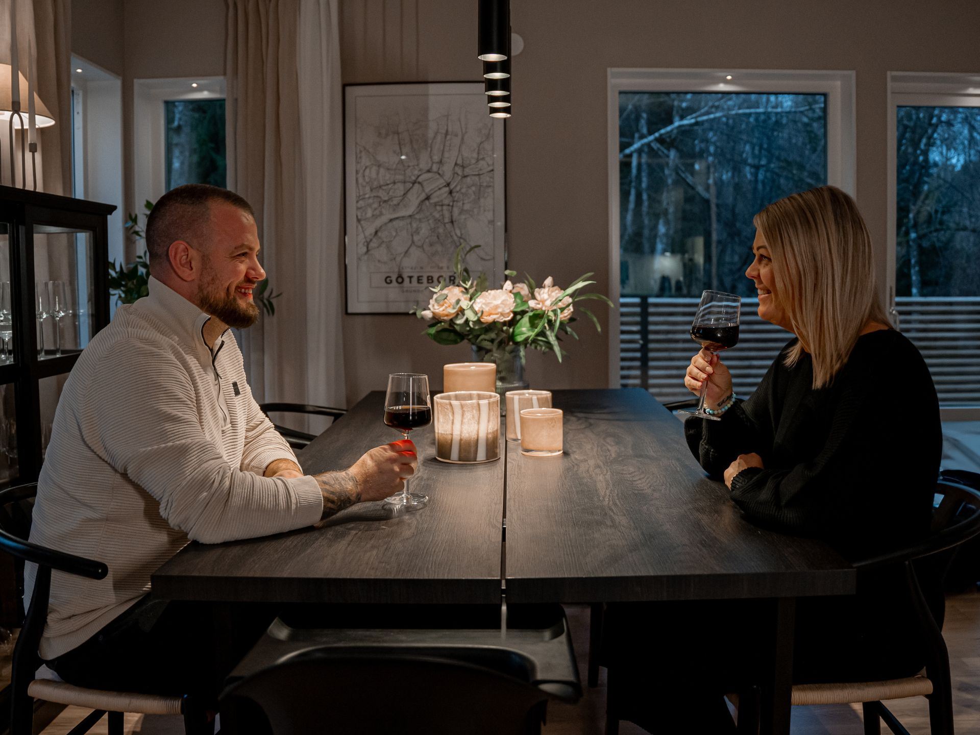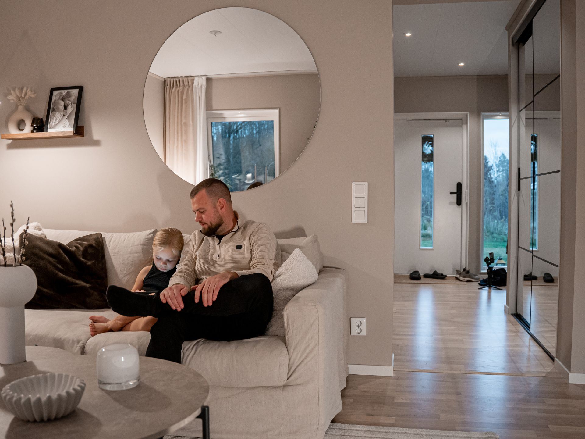 My och Lukas: Vi ville flytta ifrån innerstaden då vi väntade barn nummer två – vi ville komma ut lite mer på landet. Tanken var att köpa ett hus men när vår säljare tog fram en kalkyl för ett Villa Kalmar på tomten i området vi ville flytta till så var det ingen större prisskillnad att bygga nytt kontra att köpa ett begagnat hus.