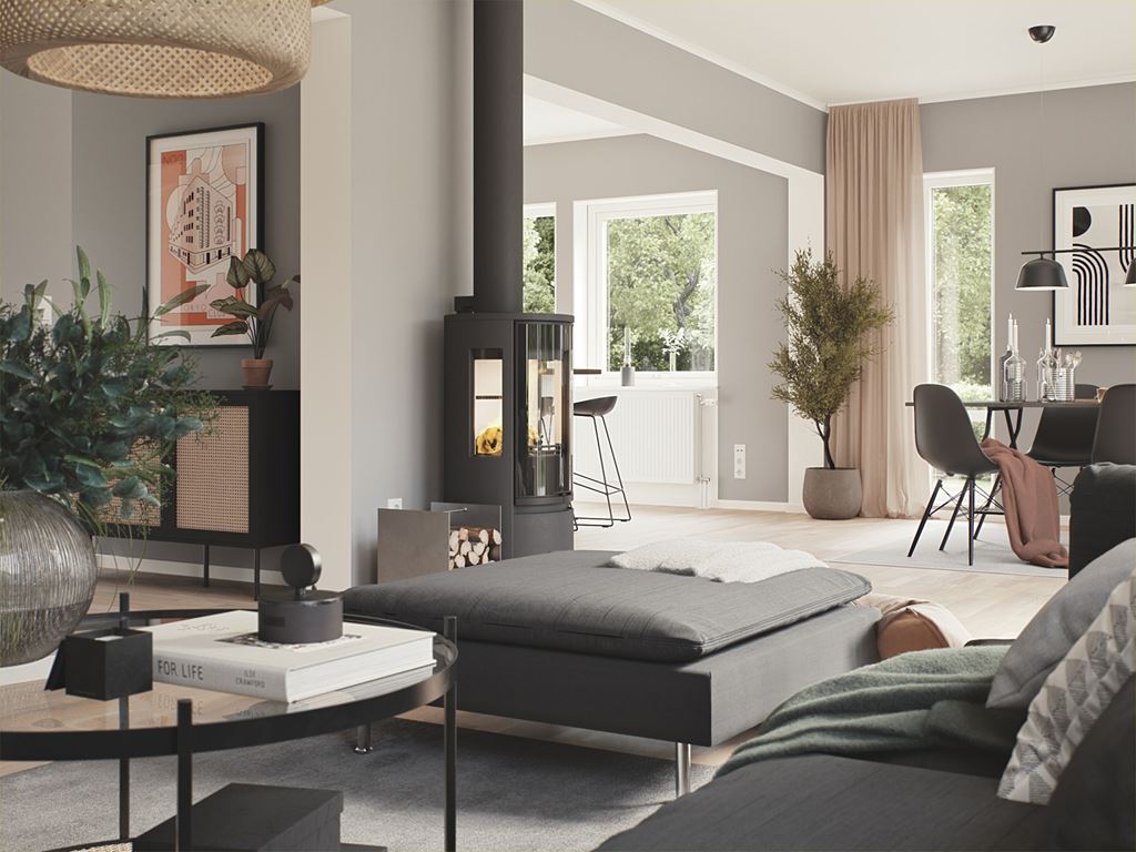 Vi gillar vardagsrum med öppna ytor där hela familjen kan inspireras i olika aktiviteter.