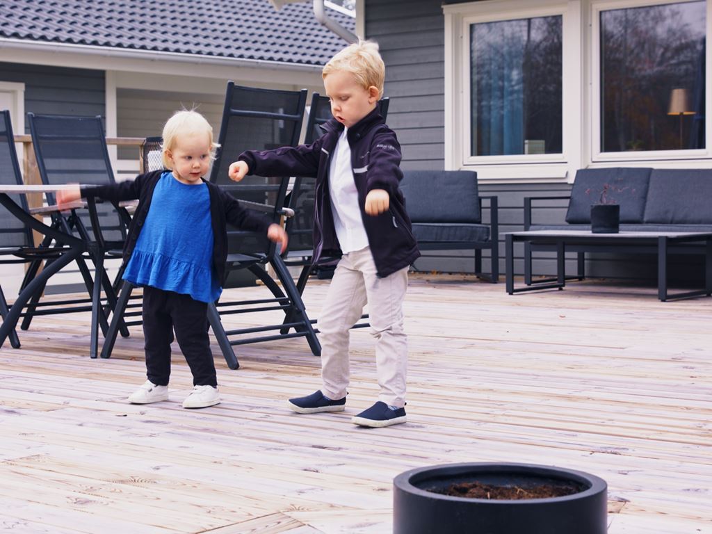 – Vi valde den största tomten på 1410 m2, beläget ner mot bäcken och de vackra omgivningarna vid Mela Kvarn, fortsätter Ida. Vi visste båda två att vi ville ha en stor och fri tomt, där man kan leka med barnen, så det kändes helt rätt.