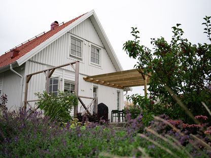 – Tidigare var det här en vildvuxen ängsmark, så det känns inte rätt att bara ha hårdgjorda ytor och en kortklippt gräsmatta. Vi har ju tagit tomten från naturen. Därför har varje växt vi väljer en funktion, eller flera. Den kan vara fin att se på, eller ge skugga, minska insyn eller ge vindskydd – det är ju något vi behöver här i blåshålet. Men vi vill också skapa en plats där även fåglar och djur ska trivas.