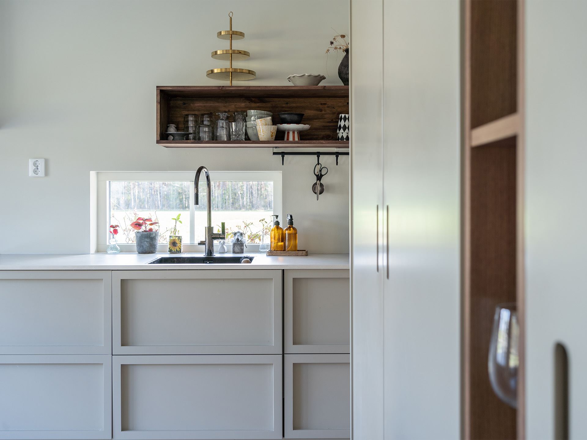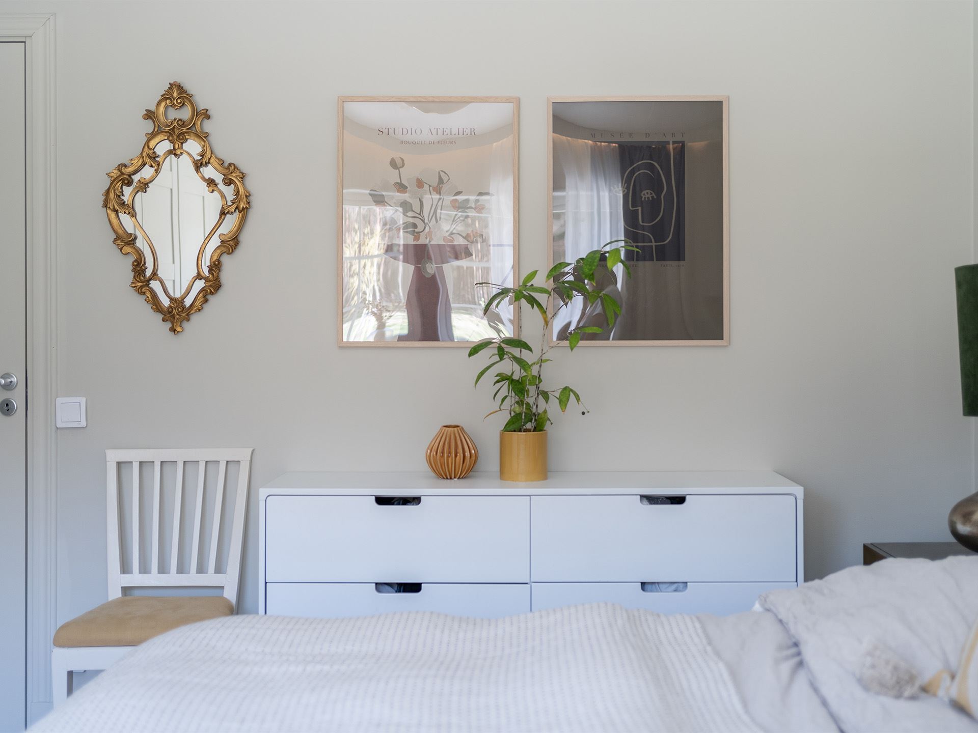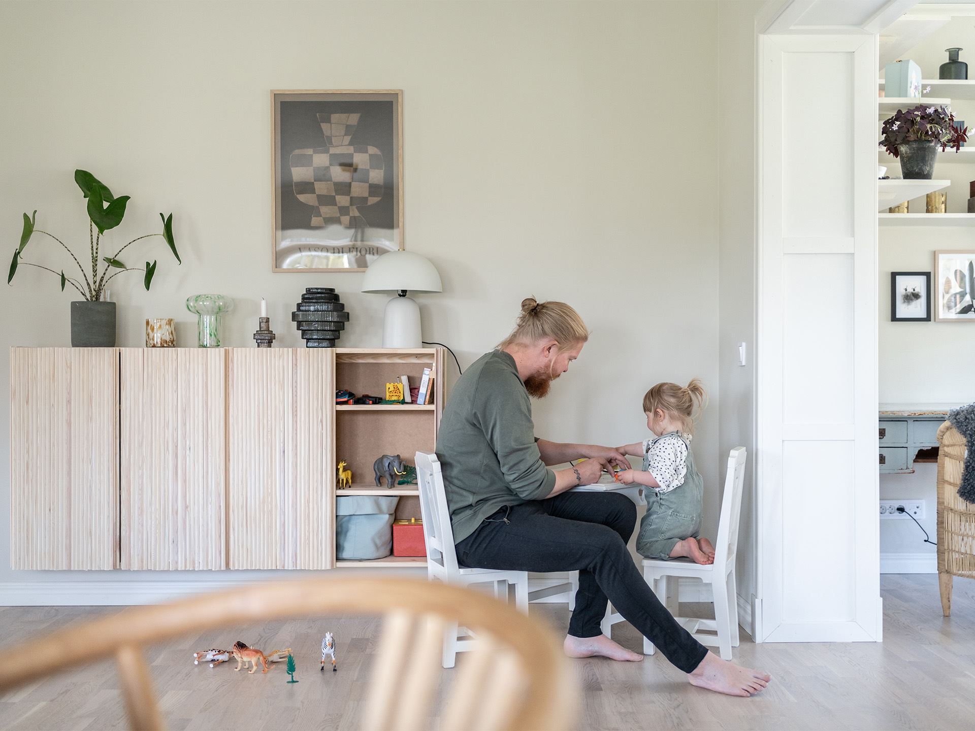 Och visst har det blivit en del idéer, några timmars sågande och målande. Redan i hallen hittar man garderoberna som byggts in och målats i samma färg som väggfärgen. Inne i köket har de tagit ner överskåpen och byggt ihop en hylla i vackert mörkt trä. Både hallen och vardagsrummet har fått sig en bänk med ribbliknande luckor och i parets sovrum har de gjort egna nattduksbord.