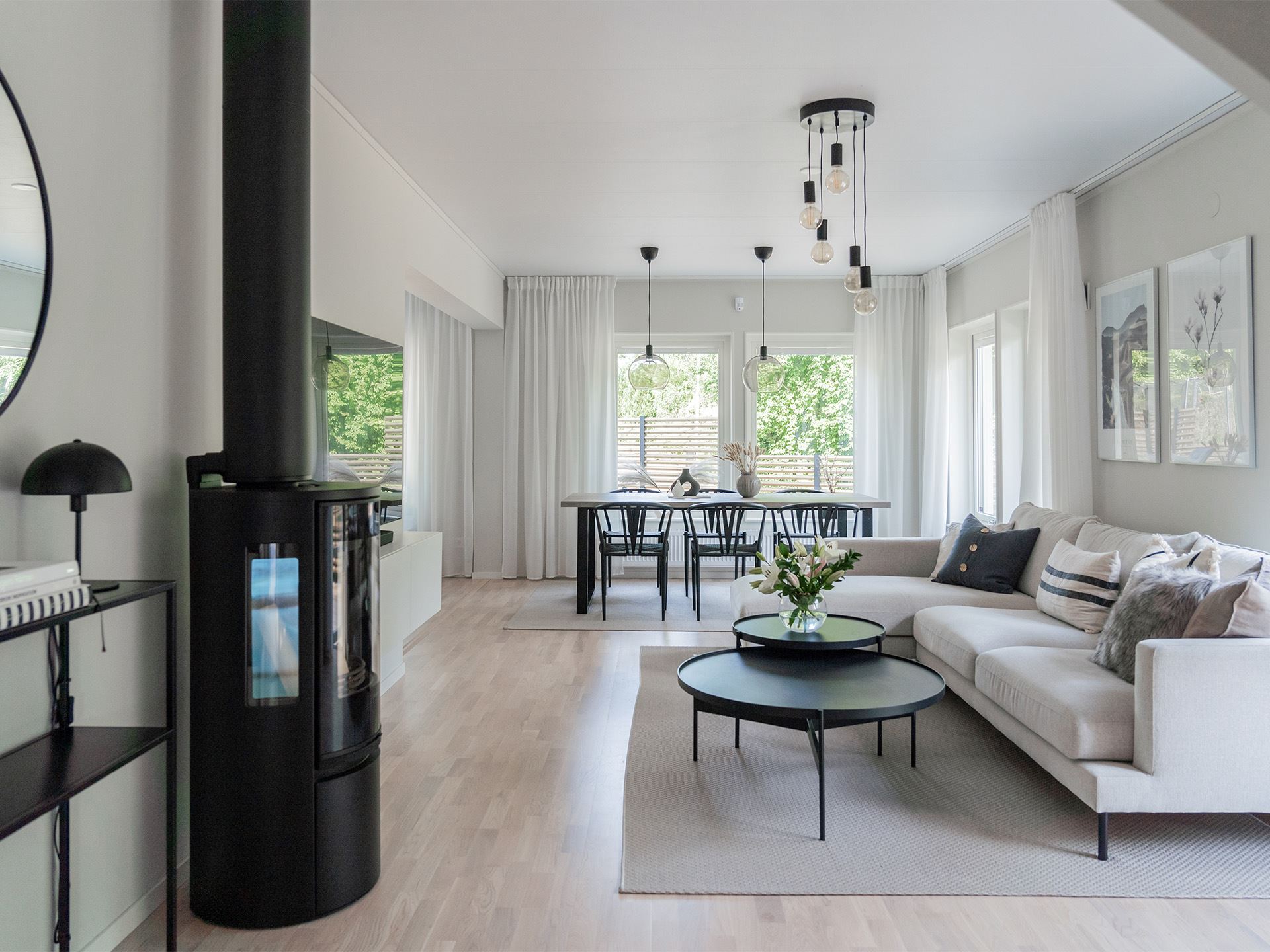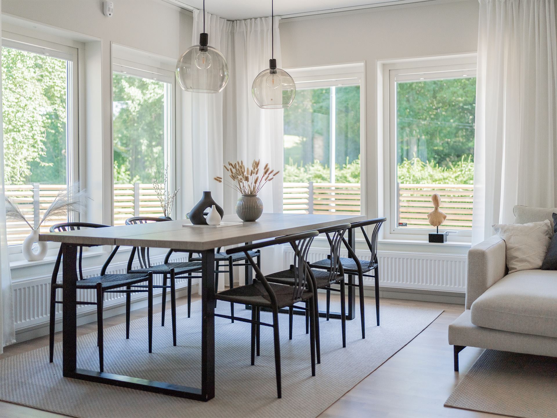 Familjen har byggt ett Villa Komstad och när man kommer in i huset möts man av en stor öppen planlösning i vinkel med stora fönster som ger ljus åt hemmet som går i neutrala toner med svarta detaljer. Med tanke på tomtläget fick de rekommenderat det gavelställda huset Villa Komstad.