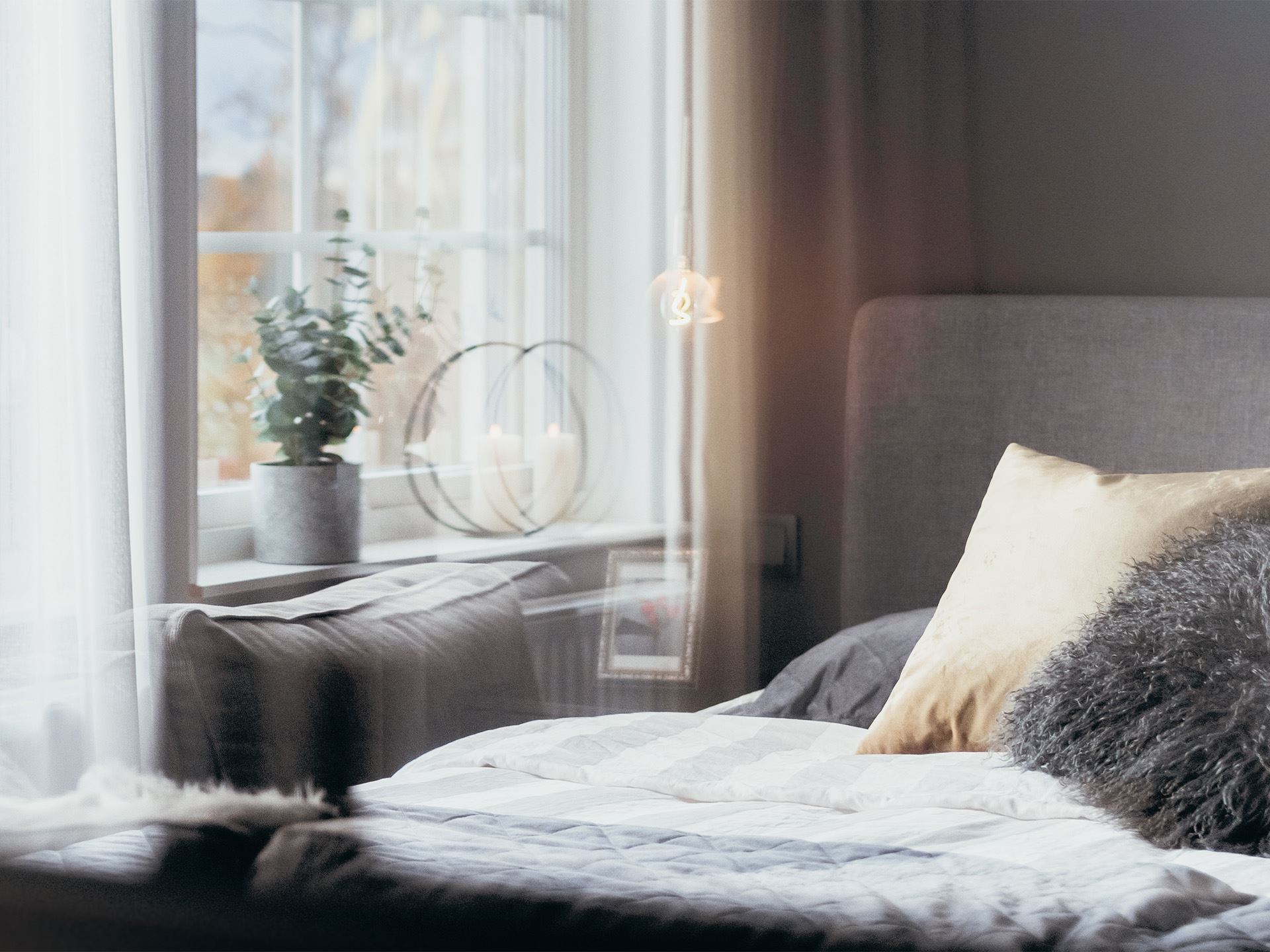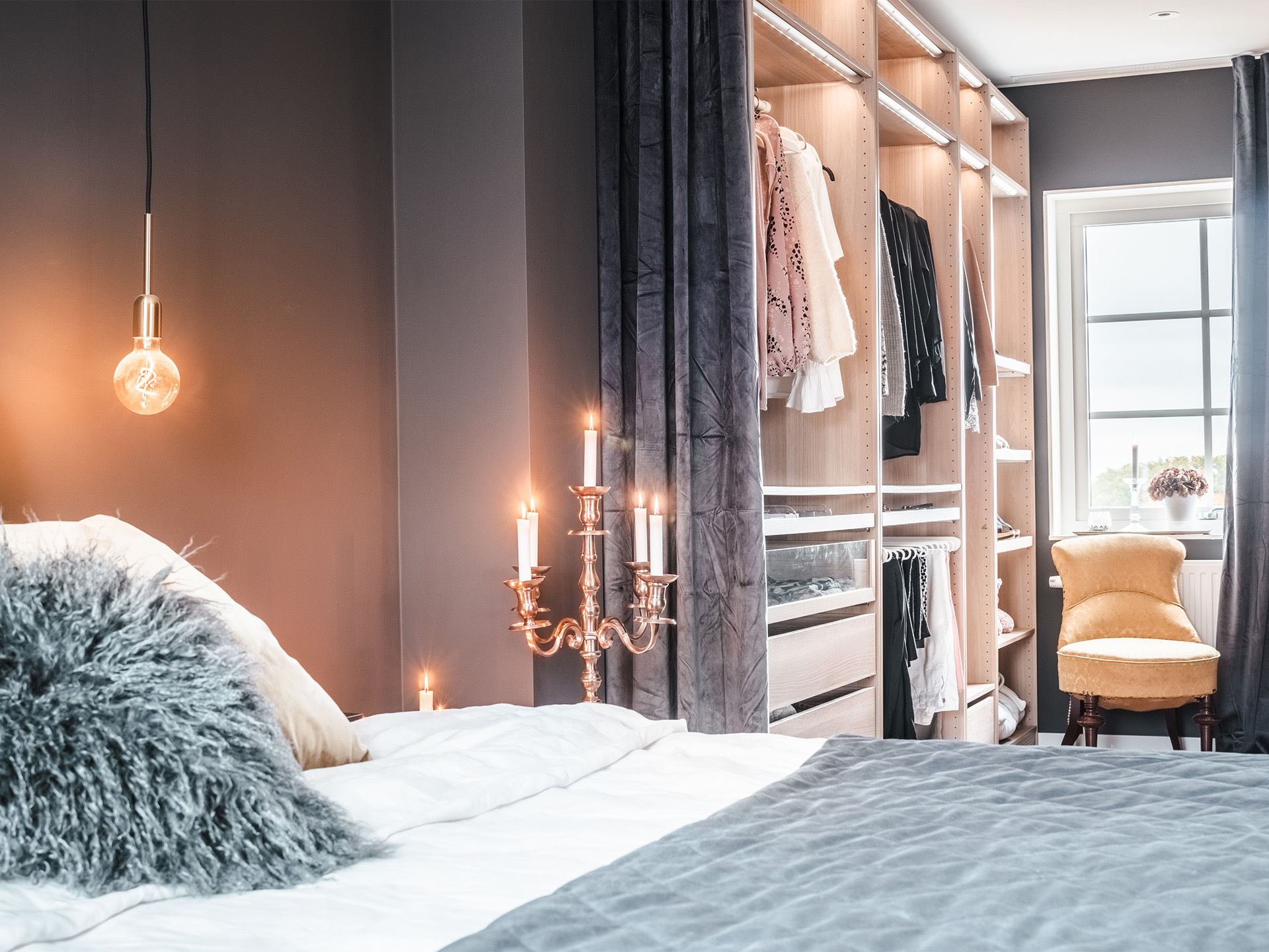 Redan på väg upp till övervåningen förstår man Zandras tanke om ett personligt hem som dessutom känns öppet och luftigt. Från hallen har de öppnat upp taket upp mot övre plan och istället för stängda dörrar in till övervåningens stora sovrum har de valt att sätta upp en industrivägg. Det öppna flödet från hallen genom vardagsrummet och sovrummet fortsätter dessutom in till sovrummets walk in closet.