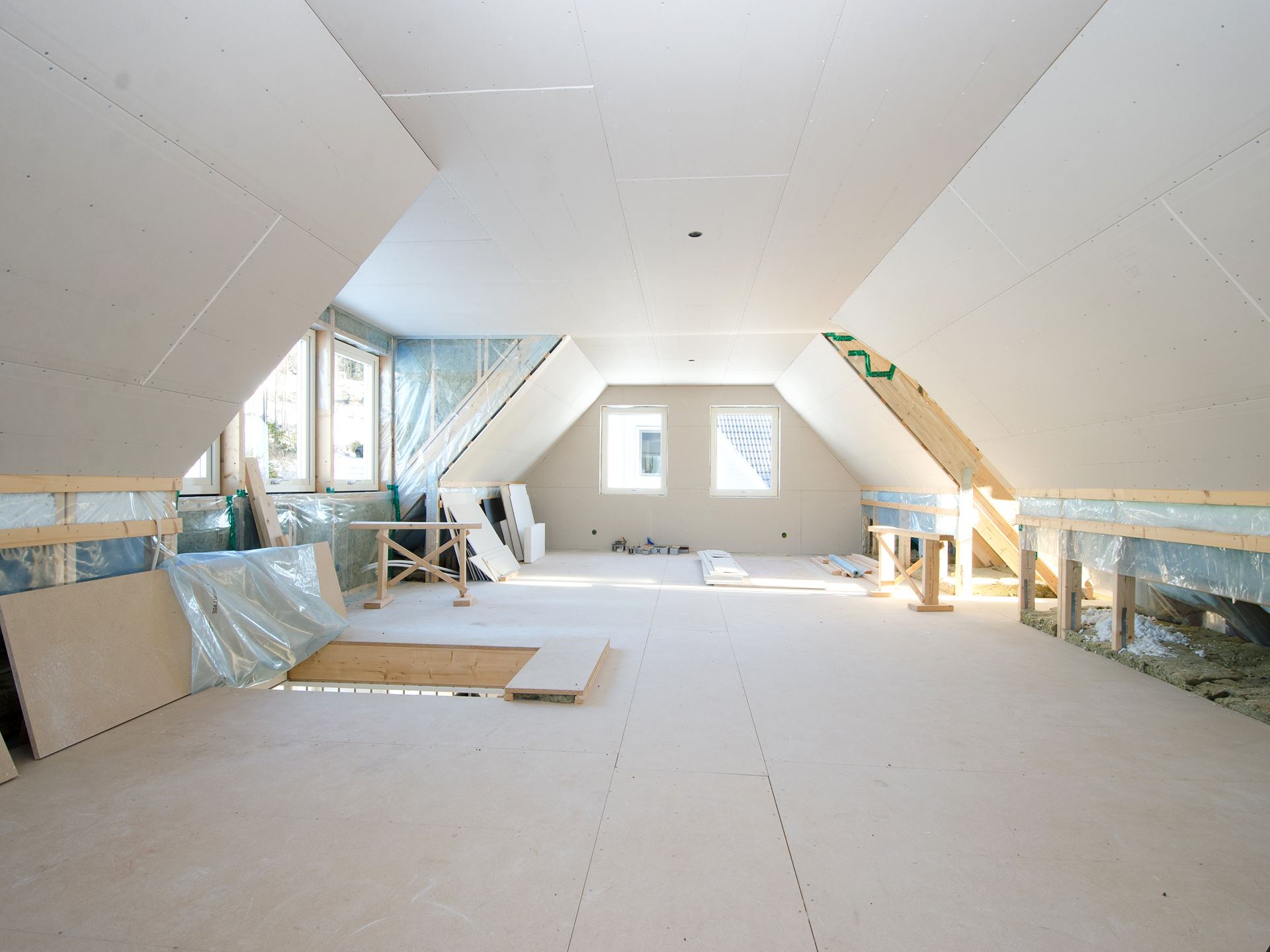 På 2-planshusen är ytterväggarna färdigisolerade med invändig skivbeklädnad, här återstår att färdigställa vindsbjälklaget med isolering och undertak.