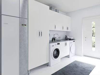 Att nybyggda hus får en bättre energiklass beror på en rad olika saker. Till exempel att de byggs mer energieffektivt, med väl beprövade lösningar som ger en hög lufttäthet. Den ligger faktiskt klart under de normala värdena, vilket är viktigt eftersom det är en av de avgörande faktorerna för att få låg elförbrukning. Även husens uppvärmning spelar stor roll. Här använder vi marknadens mest effektiva frånluftsvärmepump, Nibe F-730, vilket både gör att du får ett härligt inomhusklimat och pengar över till annat.
