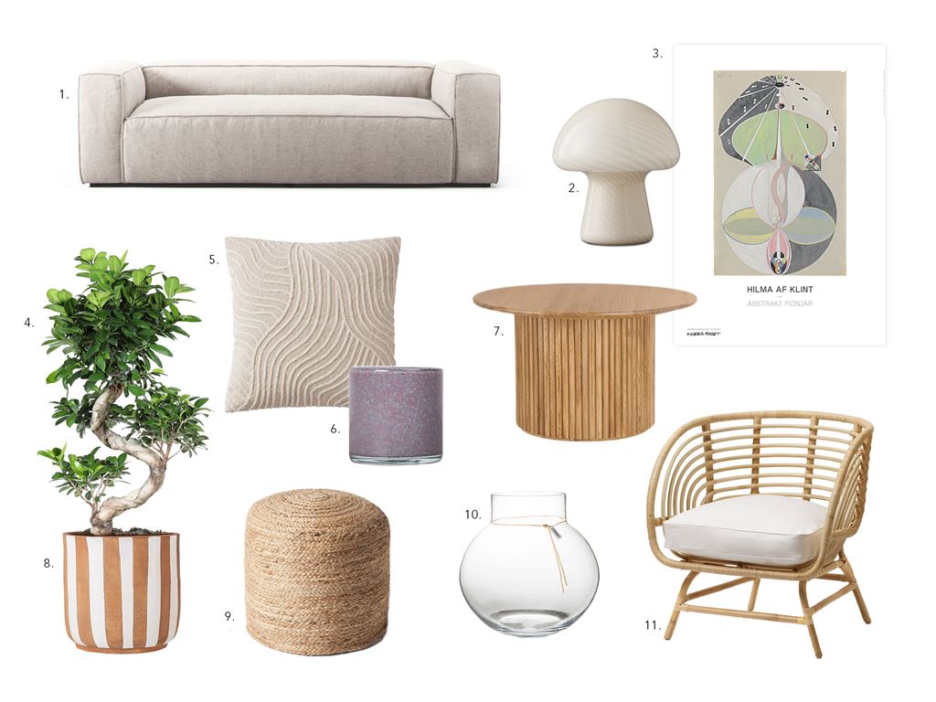 1. Grand Soffa, Sandshell Beige 2. Bordslampa BOB, Mio 3. Poster, Hilma af Klint, Kunskapens träd, Nr 5, modernamuseet.se 4. Citrusfikus, Plantagen 5. COLE Kuddfodral, Jotex 6. Calore Ljushållare, Byon 7. Soffbord Janina, Ellos.se 8. Joni Dekorativ Kruka Terrakotta, Bloomingville 9. Sittpuff JUTE, Åhlens 10. Ernst Glasvas, ERNST 11. Fåtölj BUSKBO, IKEA