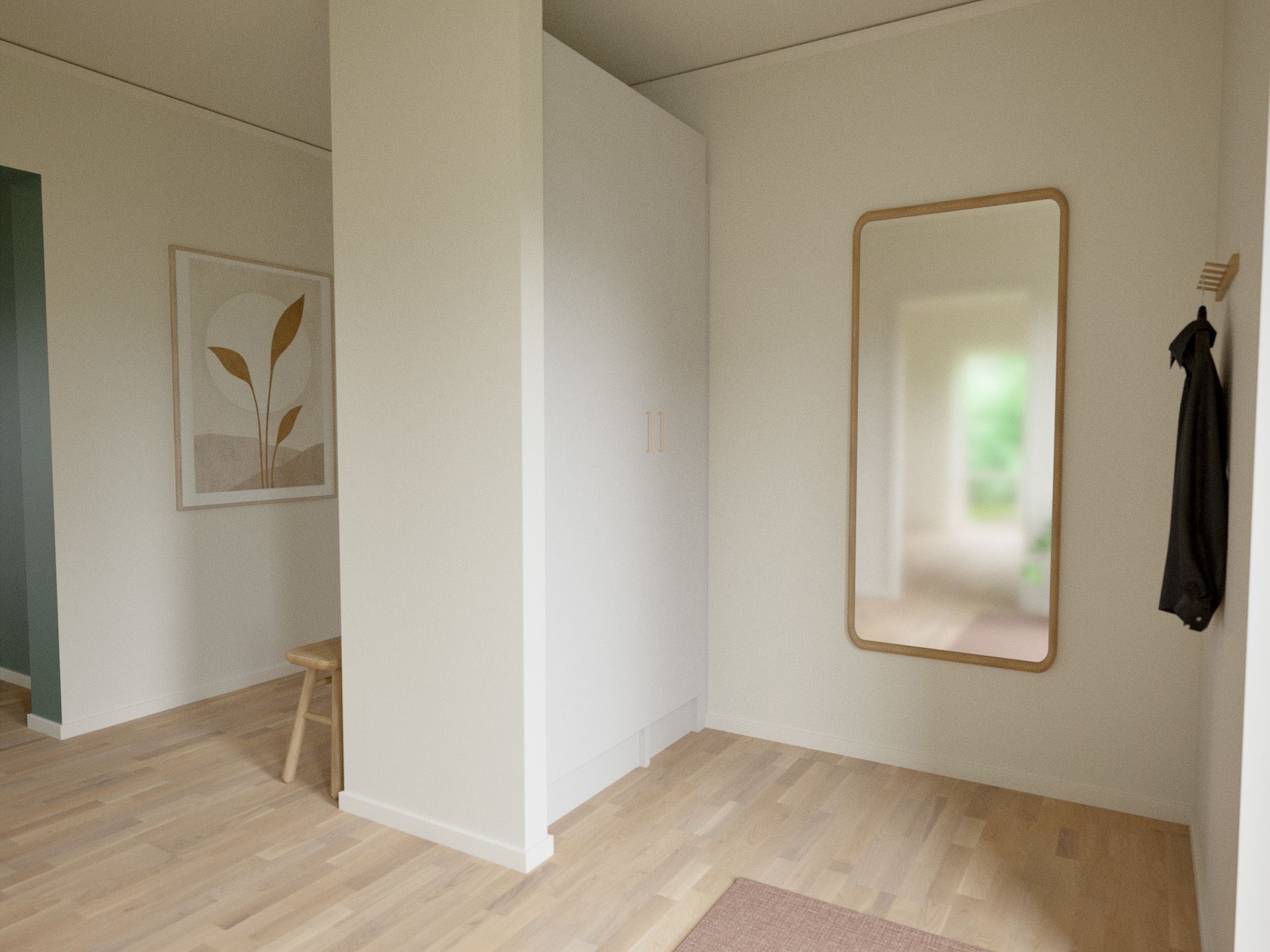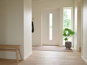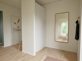 Entrén är välkomnande och praktisk, med goda förvaringsmöjligheter som gör det enkelt att hålla ordning. Därifrån kliver du rakt in i hemmets ljusa samlingspunkt eller tar vägen via köket. Husets vinkel skapar en naturlig öppenhet och flera utgångar mot trädgården – eller kanske en framtida altan som blir en förlängning av hemmet.