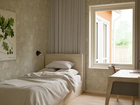 Den privata delen ligger lite vid sidan av och rymmer två sovrum, ett badrum och ett klädvårdsrum med groventré – en funktionell lösning som underlättar vardagen. Här finns också möjlighet att välja andra planlösningar, så att huset kan anpassas till mindre familjer, dig som vill leva enklare eller som ett genomtänkt fritidshus.