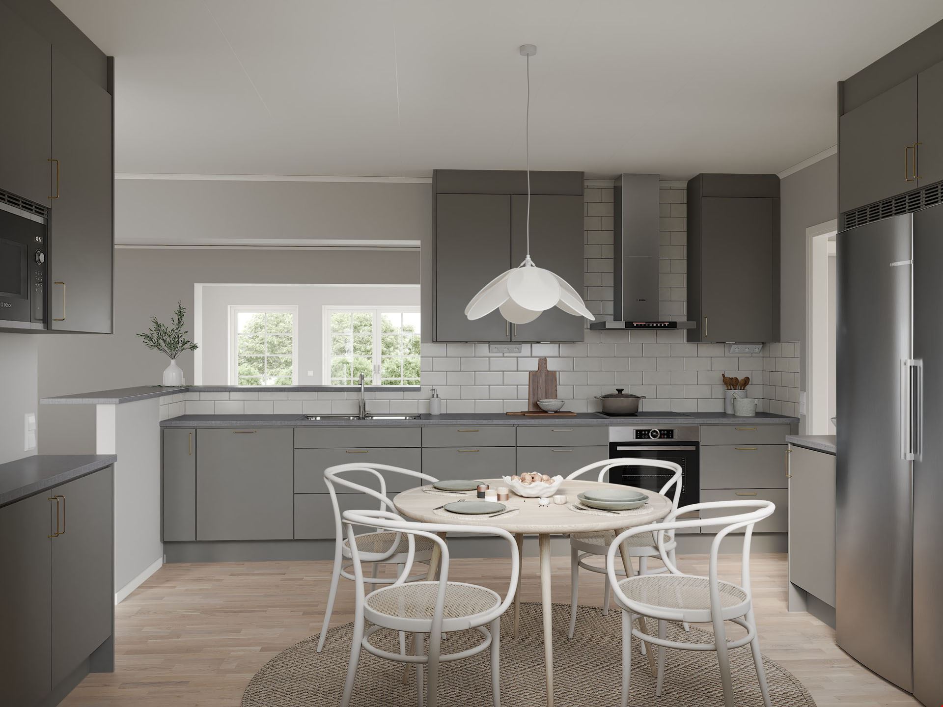 Här behöver du inte krångla med mängder av tillval. Det trevliga köket kommer från Vedum och är utrustat med höga överskåp, dämpade lådor, mjukstängande luckor, inbyggd ugn och mikro i högskåp, integrerad diskmaskin, rostfria vitvaror och matchande frihängande fläkt. Alla vitvaror kommer från Bosch. Badrummen bjuder på kakel och klinker med komfortgolvvärme, handdukstork, inredning från Vedum och en stilren duschhörna – och i tvättstugan väntar både tvättmaskin och torktumlare på att ta hand om din tvätt. Vi har även sett till att din bil har ett isolerat garage att husera i när den inte används.