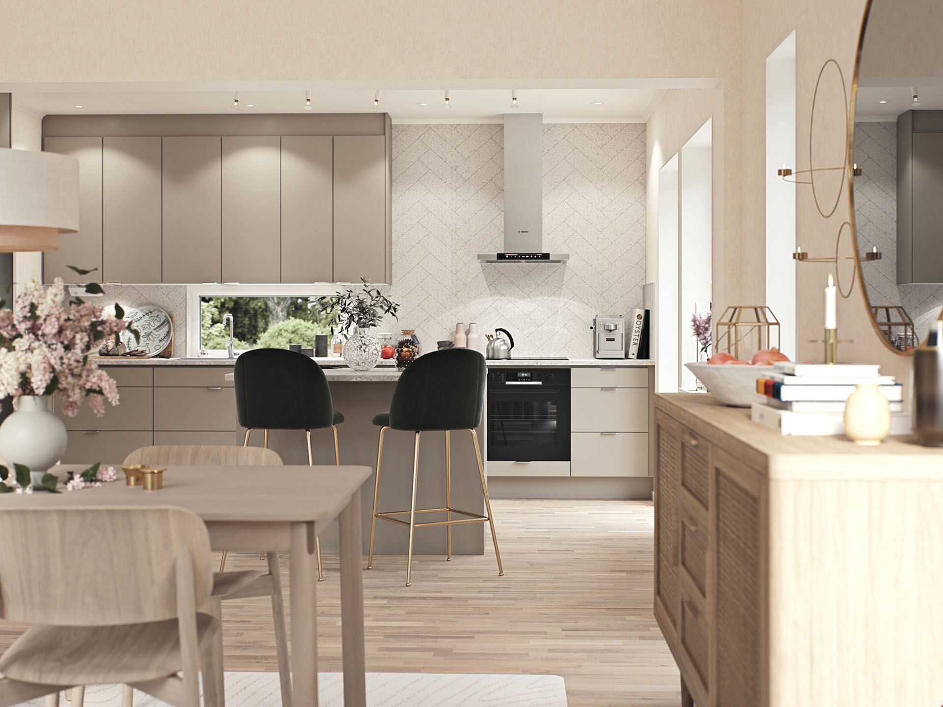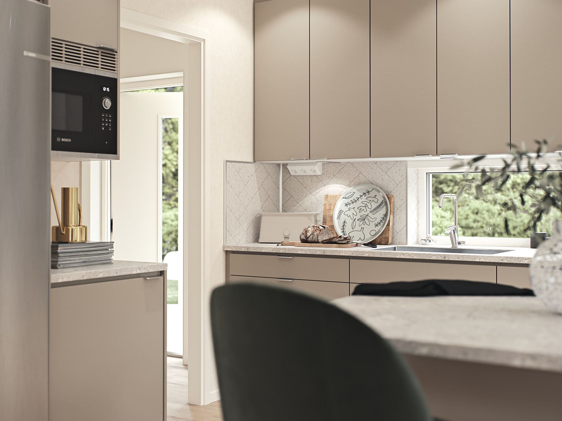 Villa Kalmar är en av våra mest omtyckta husmodeller bland 1,5-planshusen. Den ljusa, öppna planlösningen mellan vardagsrum och kök i husets ena planhalva brukar uppskattas lite extra. Inte konstigt alls, det är en härlig yta som ger en känsla av rymd och gör det lätt att umgås – både vid middagar och läxläsning.