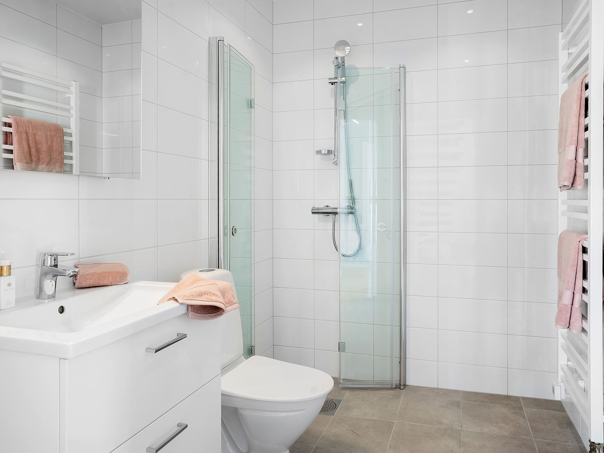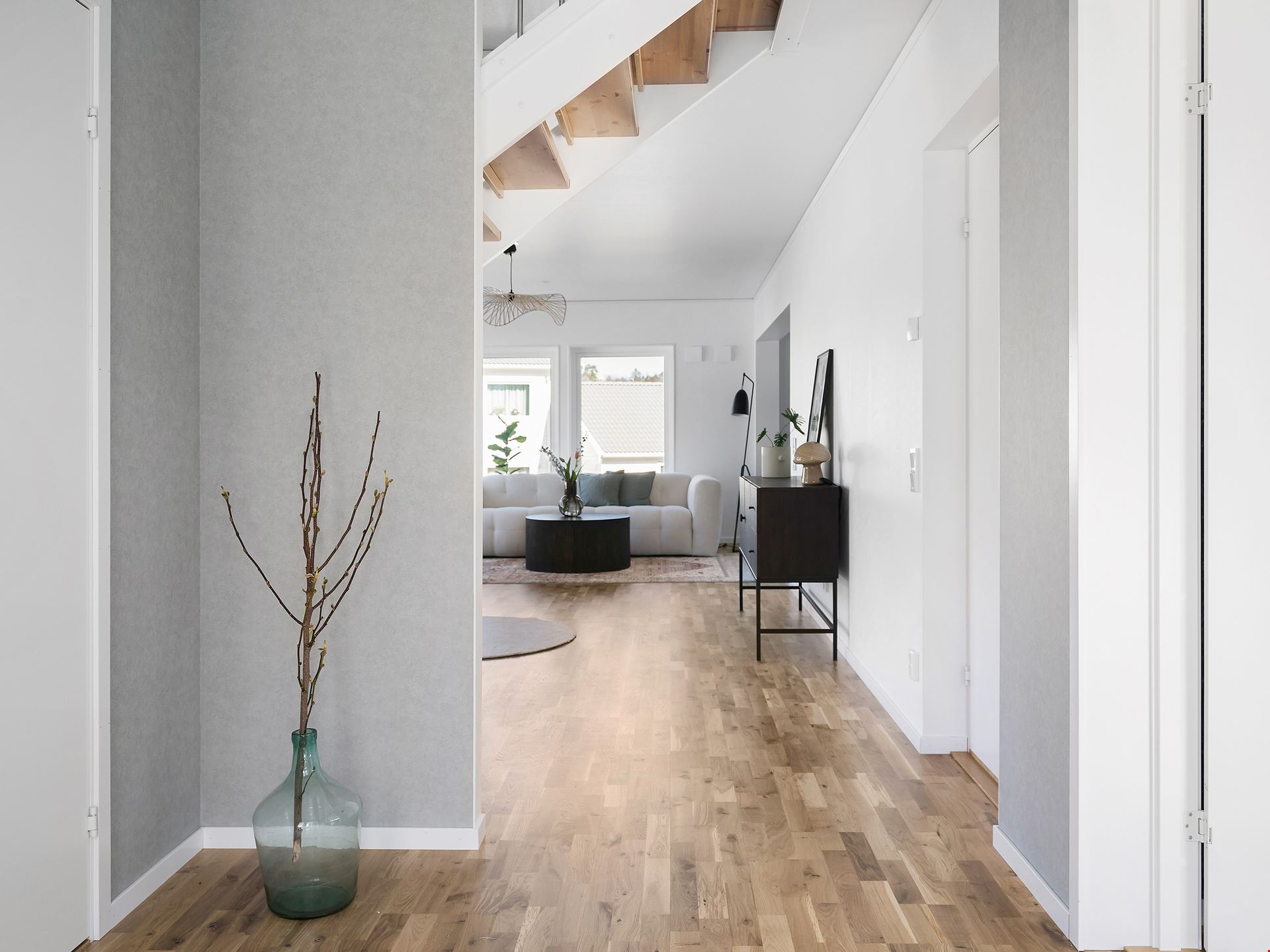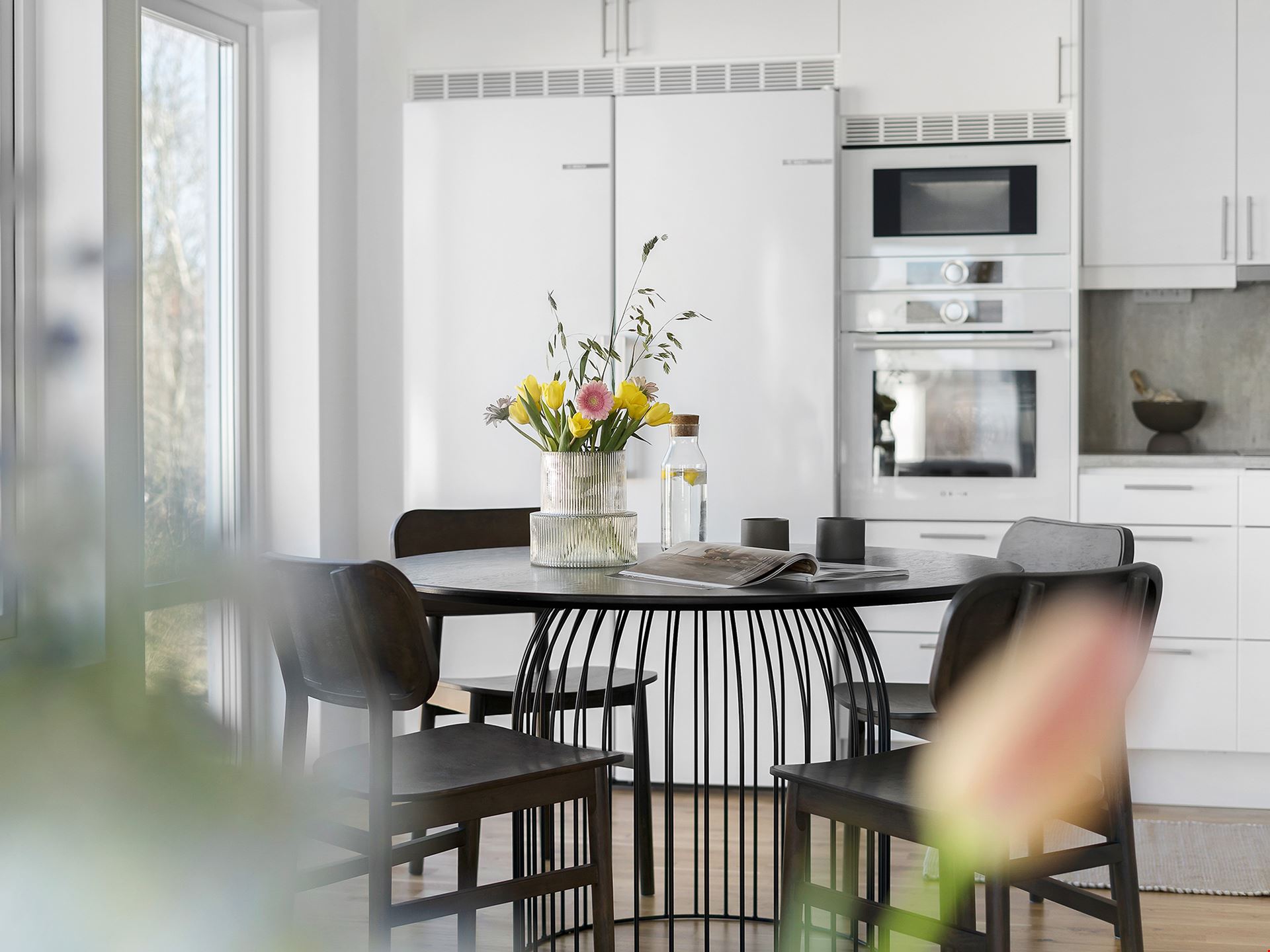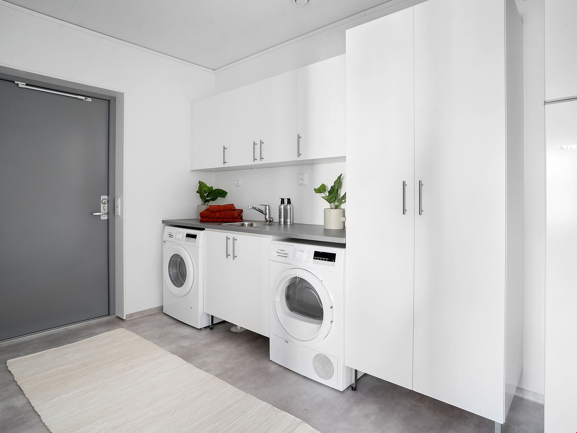 Köket kommer från Vedum och alla vitvaror kommer från Bosch. Här behöver du inte krångla med mängder av tillval. Badrummen bjuder på kakel och klinker med komfortgolvvärme, inredning från Vedum och en stilren duschhörna – och i tvättstugan väntar både tvättmaskin och torktumlare på att ta hand om din tvätt.