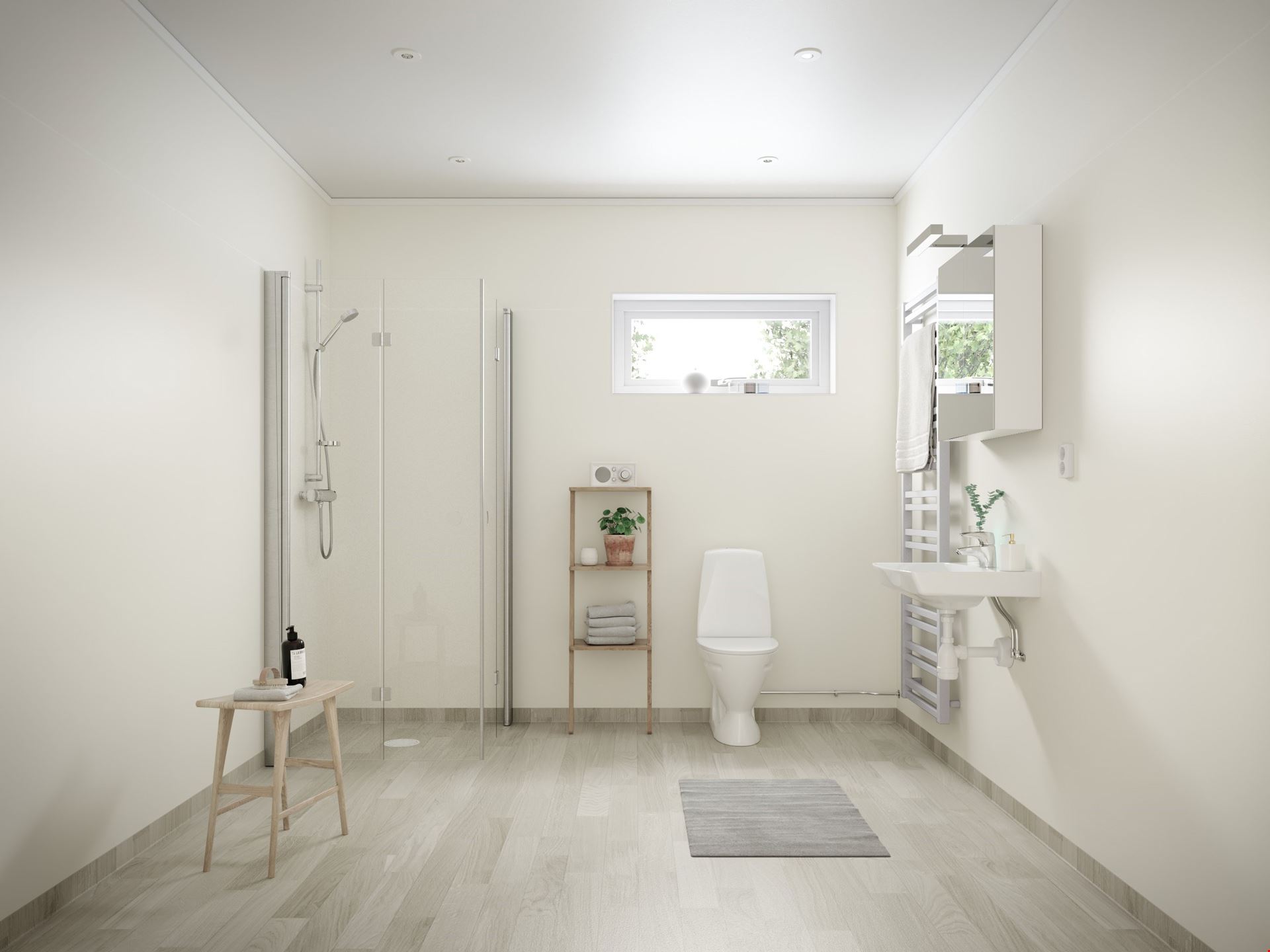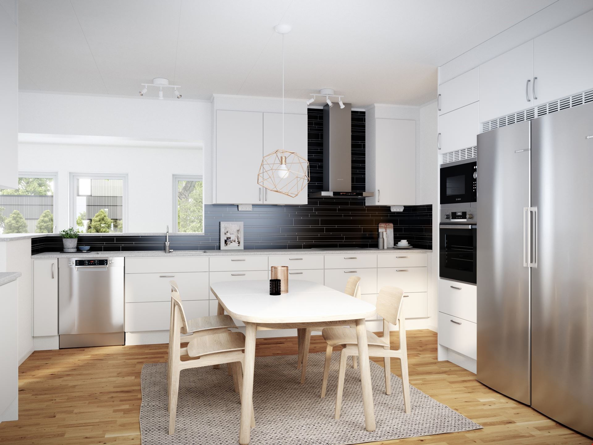 Här kommer vi in i en ljus och rymlig entré. Rakt framför oss väntar det härliga vardagsrummet. Gott om plats för trevliga stunder, helt enkelt. Åt höger har vi hemmets hjärta: köket. Här finns både bra arbetsytor och plats för matbord – och den inbjudande bardisken mot vardagsrummet förstärker den sociala känslan i huset. Från köket når vi husets stora sovrum, husets mindre badrum med WC och dusch samt en rejäl tvättstuga med praktisk groventré, perfekt för leriga stövlar eller tassar…
