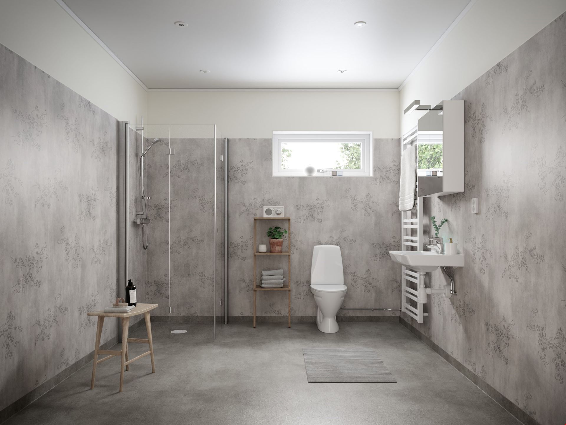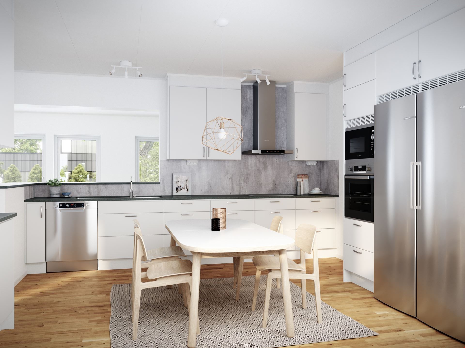 Här kommer vi in i en ljus och rymlig entré. Rakt framför oss väntar det härliga vardagsrummet. Gott om plats för trevliga stunder, helt enkelt. Åt höger har vi hemmets hjärta: köket. Här finns både bra arbetsytor och plats för matbord – och den inbjudande bardisken mot vardagsrummet förstärker den sociala känslan i huset. Från köket når vi husets stora sovrum, husets mindre badrum med WC och dusch samt en rejäl tvättstuga med praktisk groventré, perfekt för leriga stövlar eller tassar…