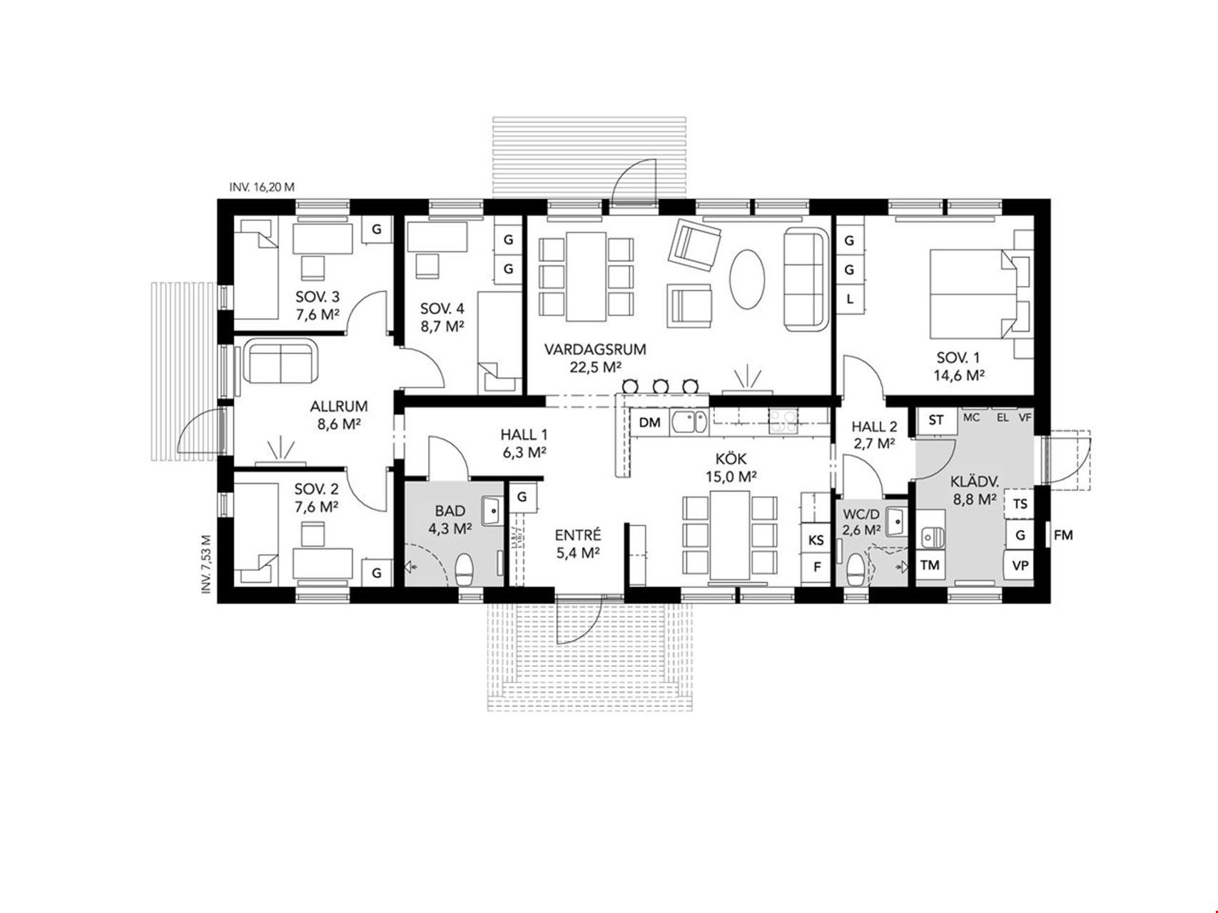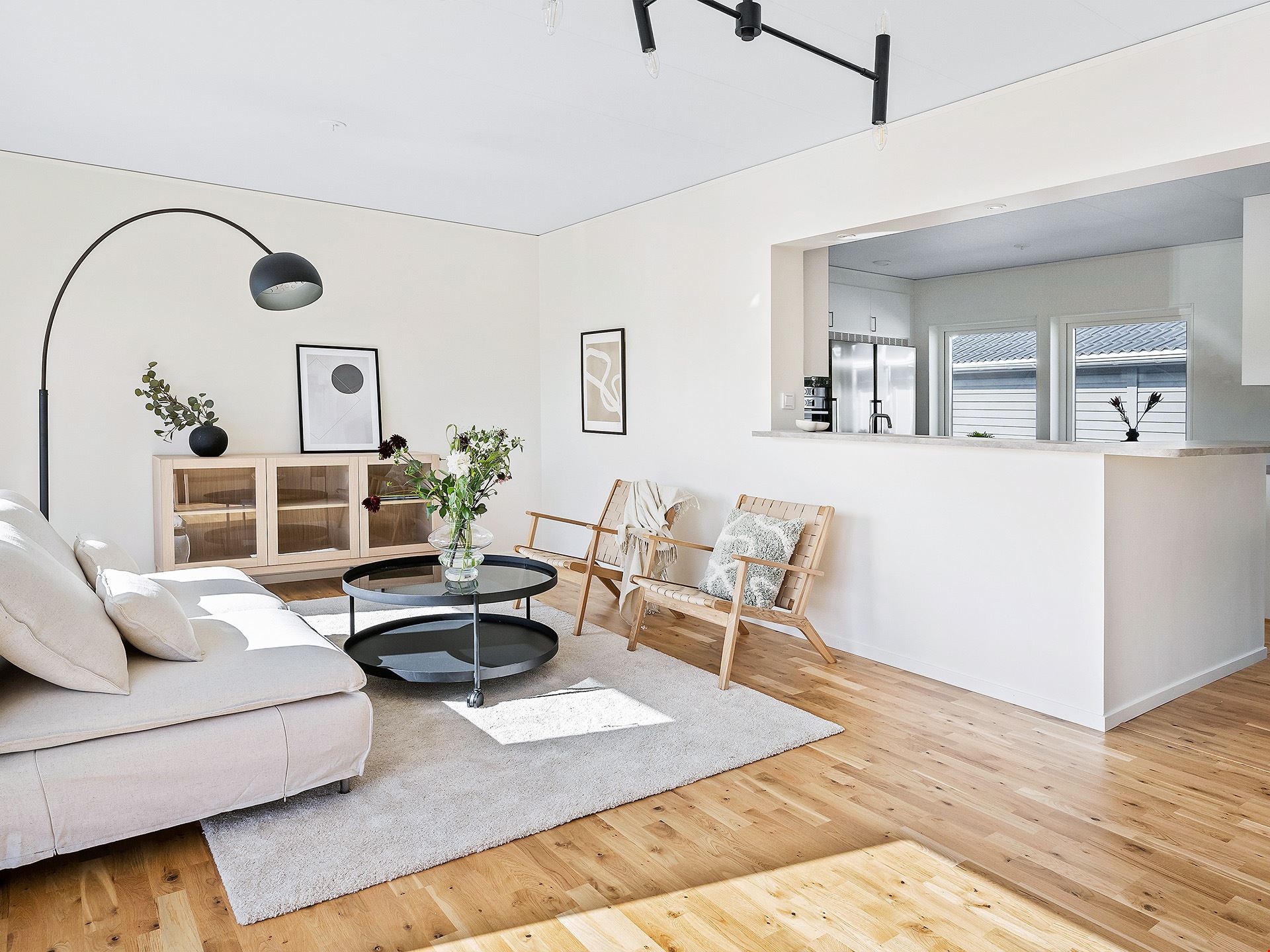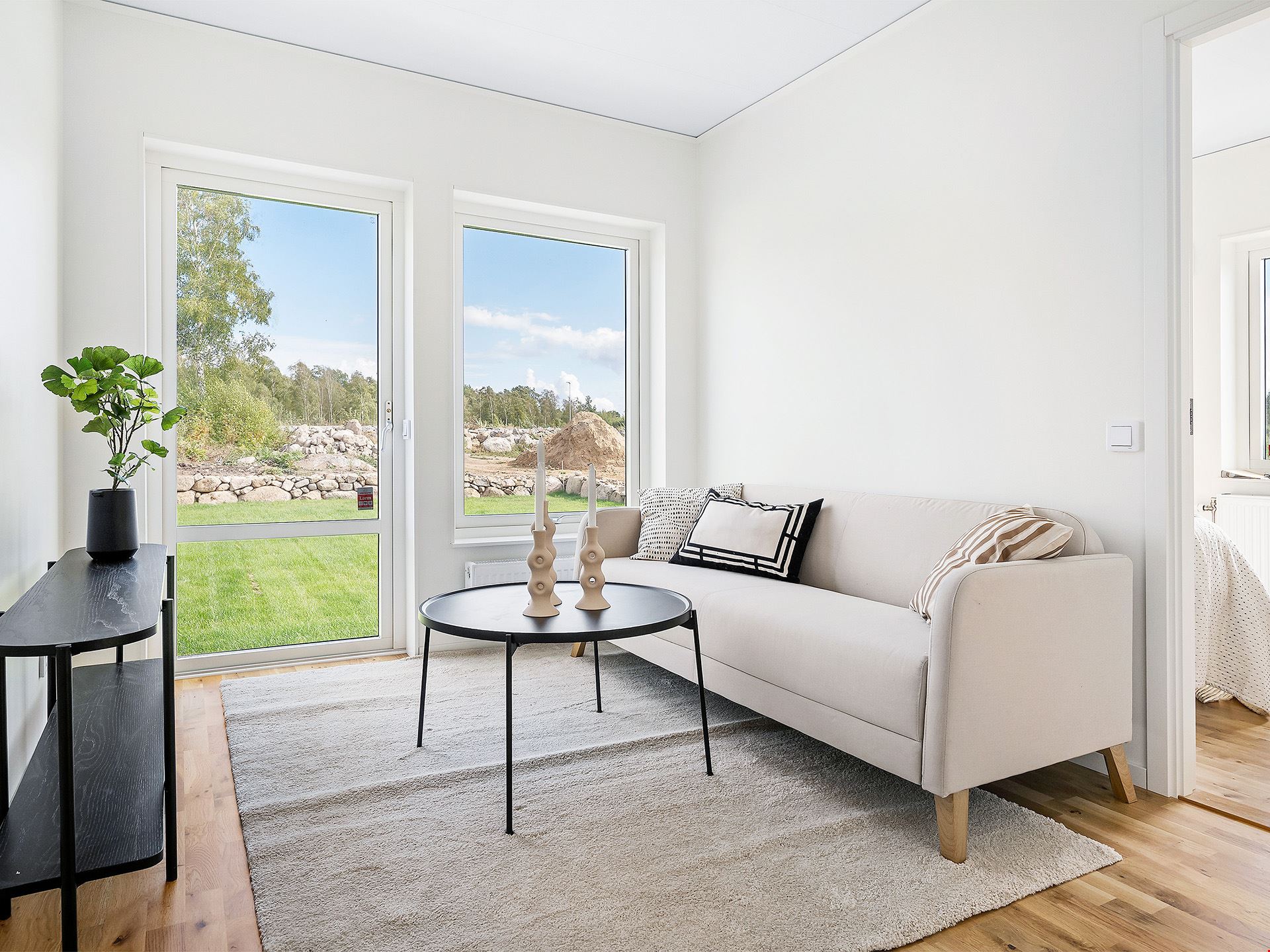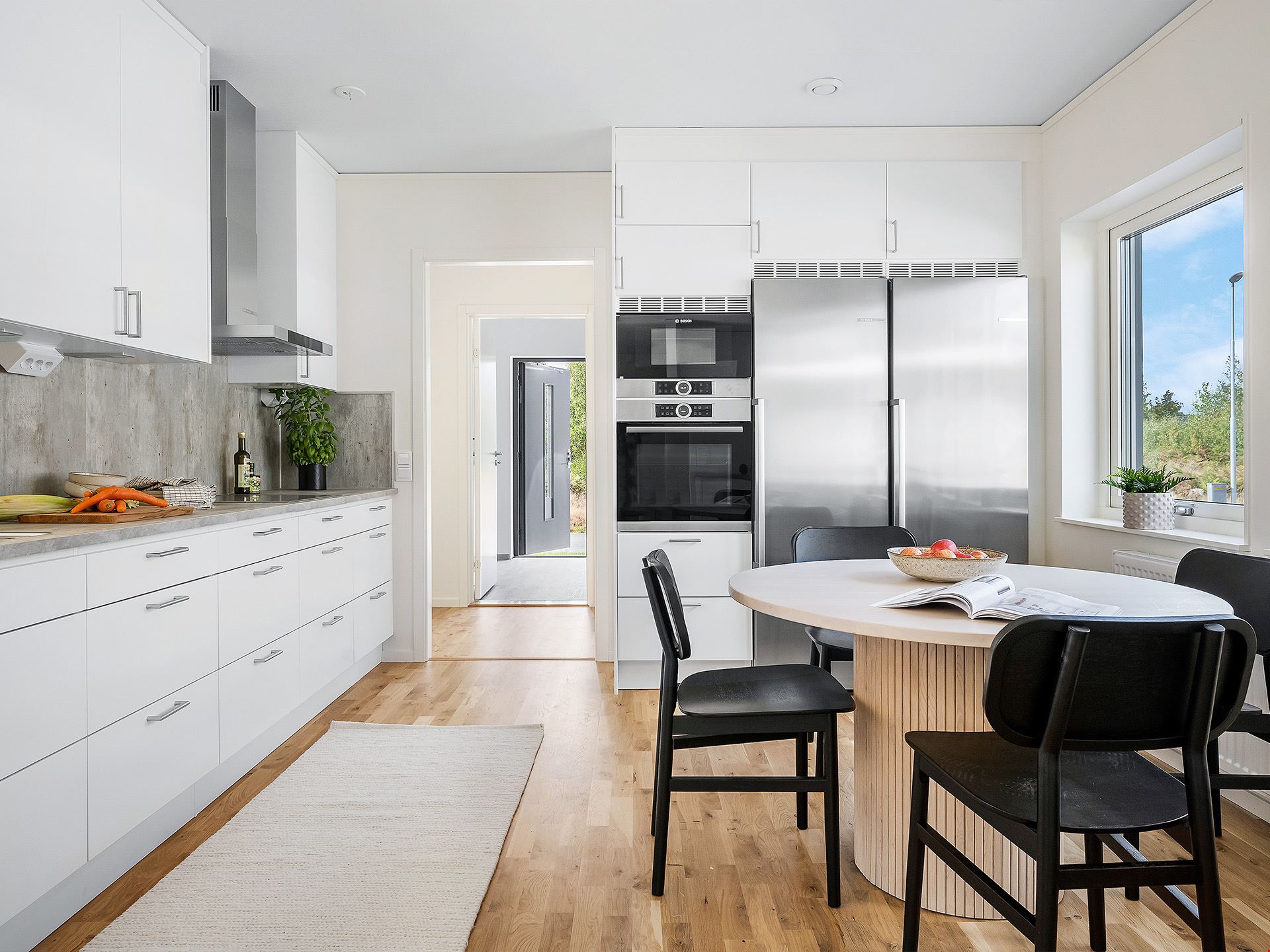 Här kommer vi in i en ljus och rymlig entré. Rakt framför oss väntar det härliga vardagsrummet. Gott om plats för trevliga stunder, helt enkelt. Åt höger har vi hemmets hjärta: köket. Här finns både bra arbetsytor och plats för matbord – och den inbjudande bardisken mot vardagsrummet förstärker den sociala känslan i huset. Från köket når vi husets stora sovrum, husets mindre badrum med WC och dusch samt en rejäl tvättstuga med praktisk groventré, perfekt för leriga stövlar eller tassar…