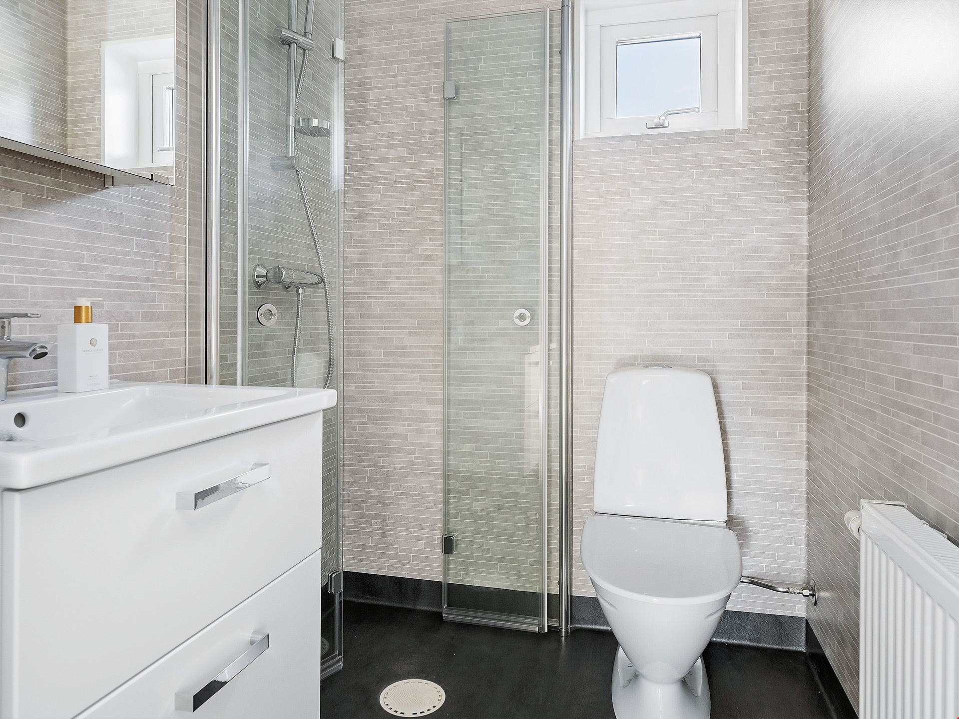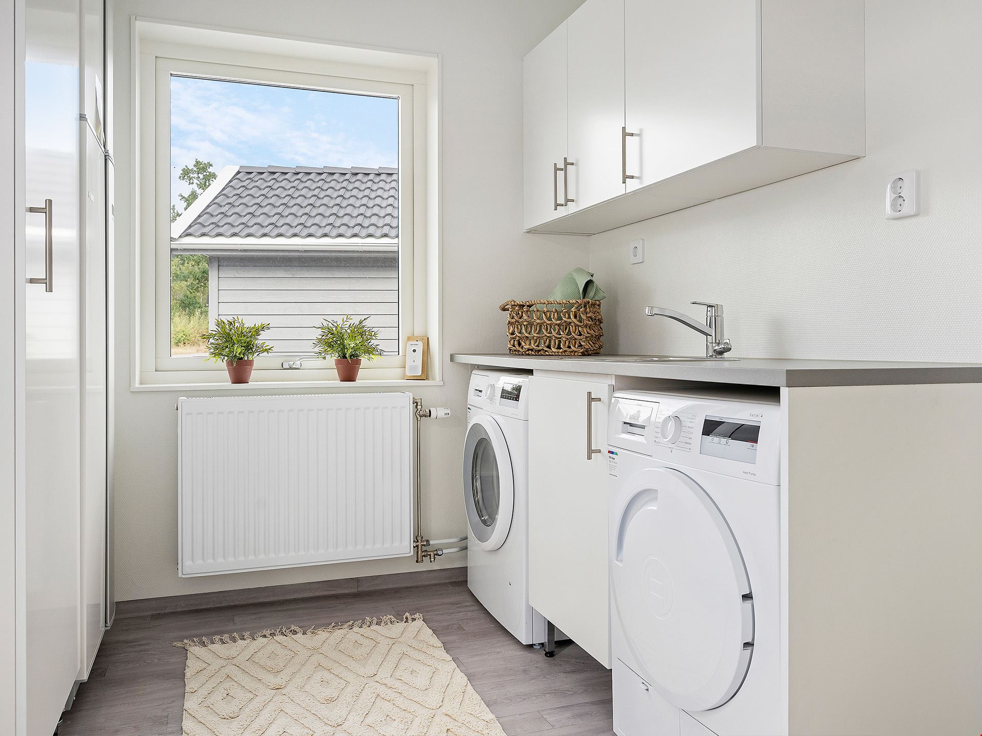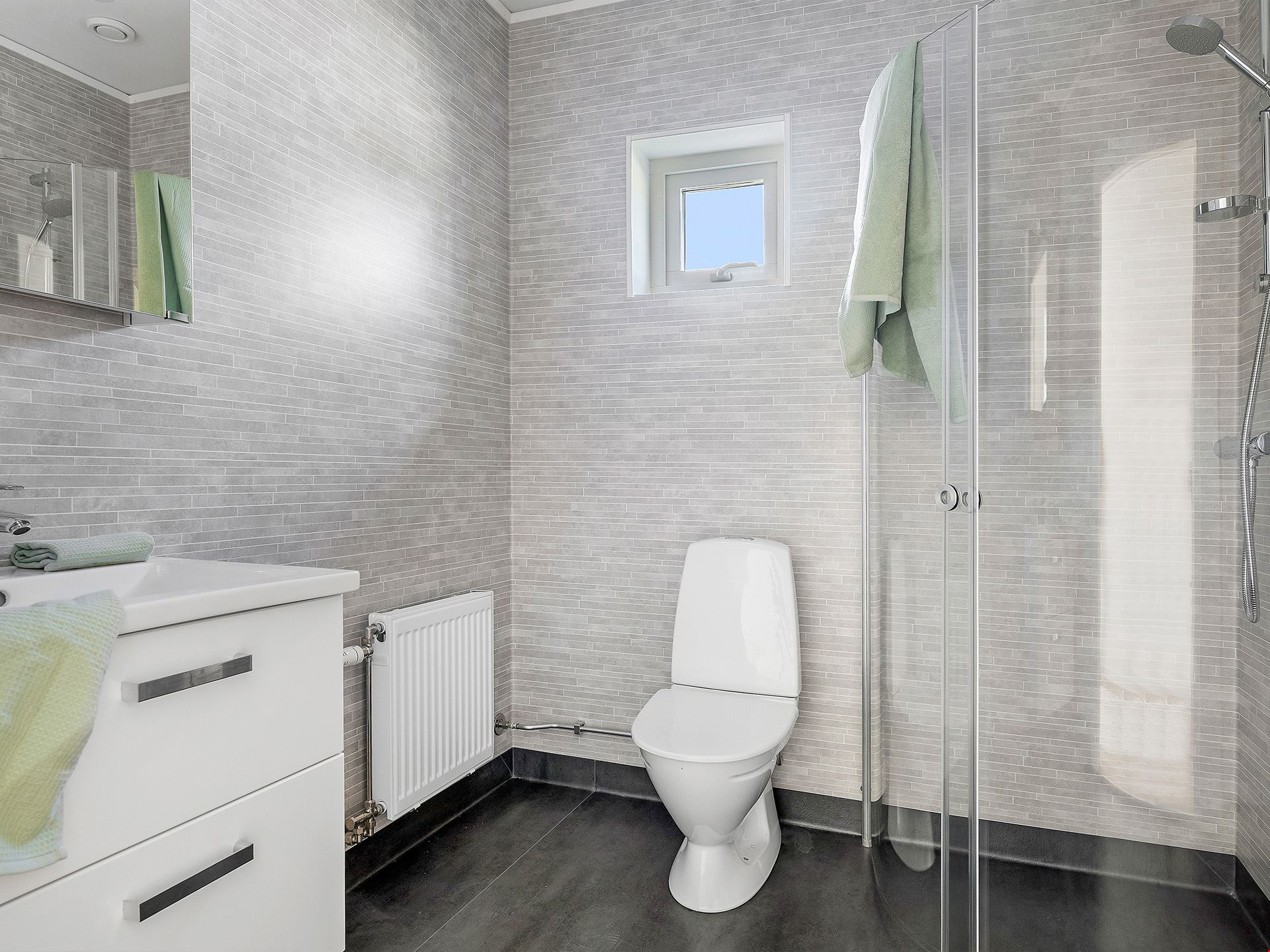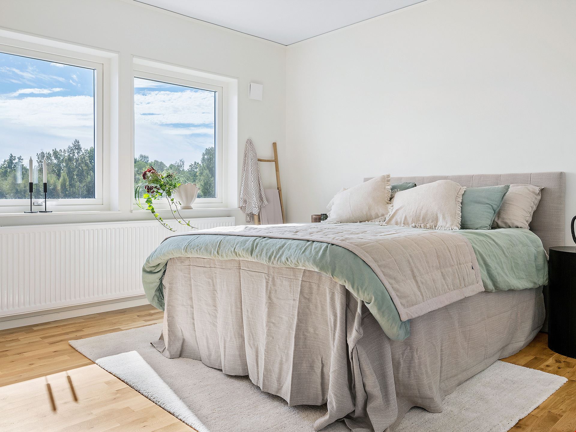 Här kommer vi in i en ljus och rymlig entré. Rakt framför oss väntar det härliga vardagsrummet. Gott om plats för trevliga stunder, helt enkelt. Åt höger har vi hemmets hjärta: köket. Här finns både bra arbetsytor och plats för matbord – och den inbjudande bardisken mot vardagsrummet förstärker den sociala känslan i huset. Från köket når vi husets stora sovrum, husets mindre badrum med WC och dusch samt en rejäl tvättstuga med praktisk groventré, perfekt för leriga stövlar eller tassar…