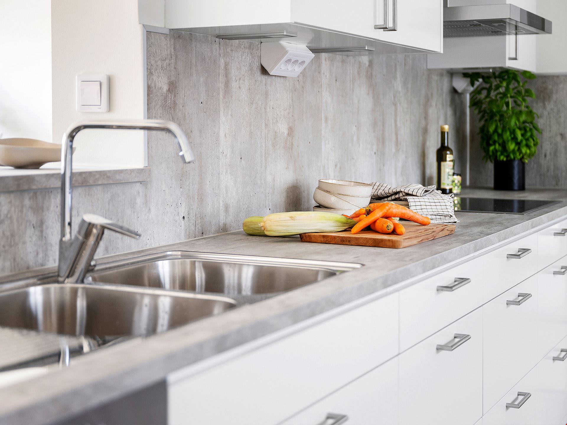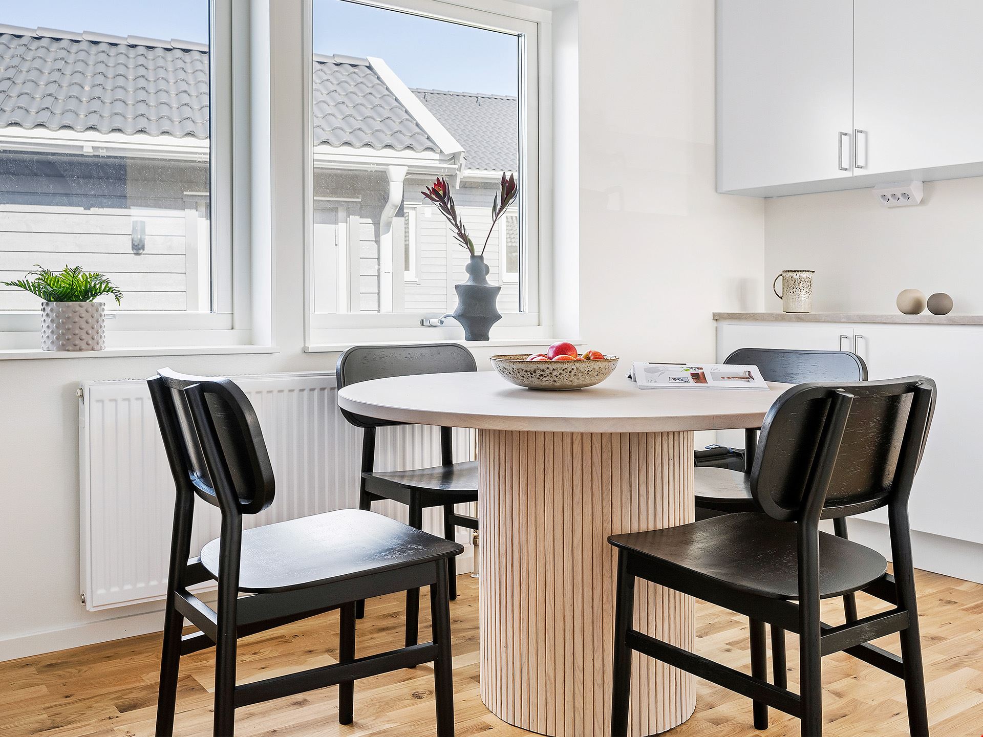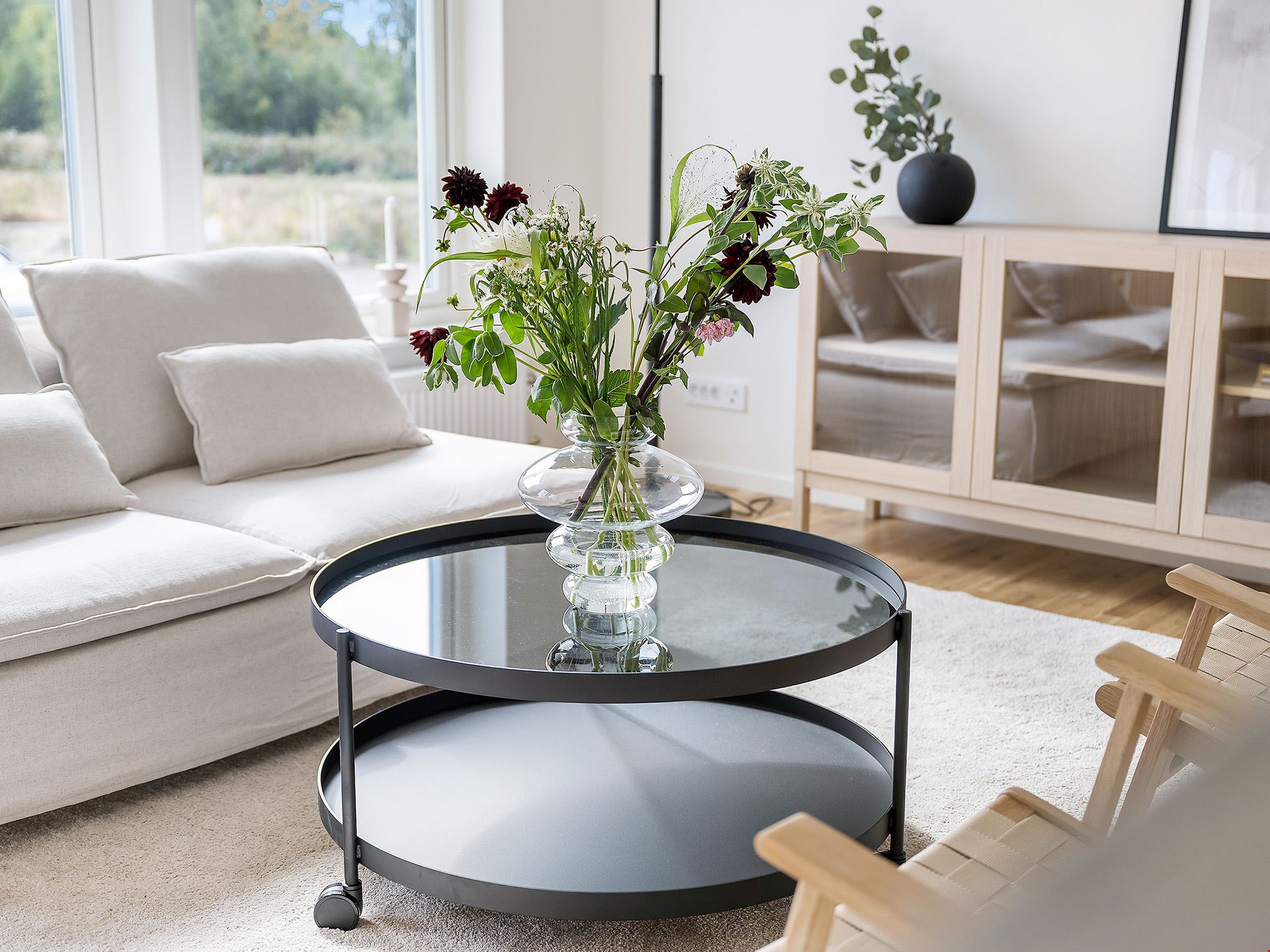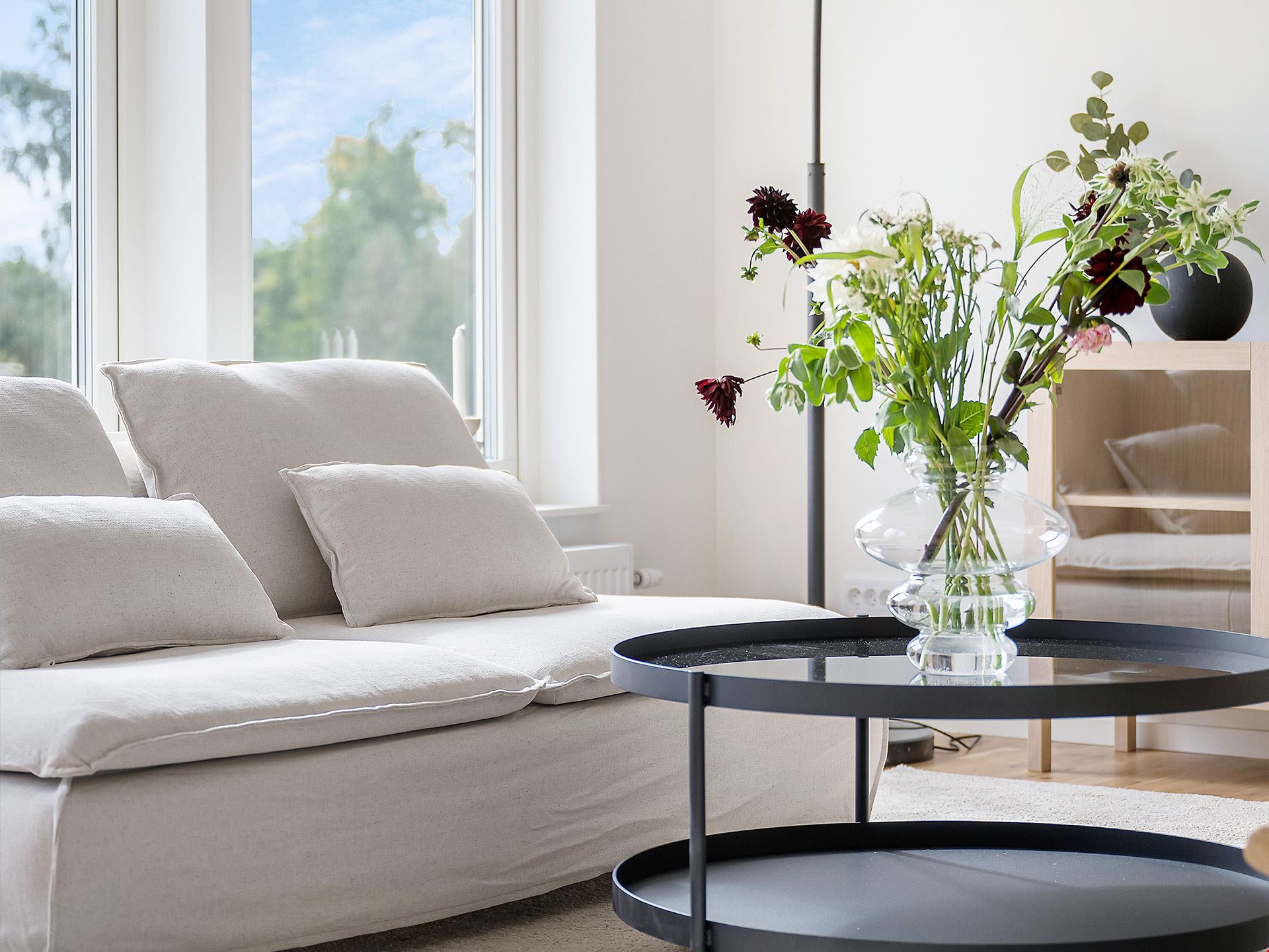 Här kommer vi in i en ljus och rymlig entré. Rakt framför oss väntar det härliga vardagsrummet. Gott om plats för trevliga stunder, helt enkelt. Åt höger har vi hemmets hjärta: köket. Här finns både bra arbetsytor och plats för matbord – och den inbjudande bardisken mot vardagsrummet förstärker den sociala känslan i huset. Från köket når vi husets stora sovrum, husets mindre badrum med WC och dusch samt en rejäl tvättstuga med praktisk groventré, perfekt för leriga stövlar eller tassar…
