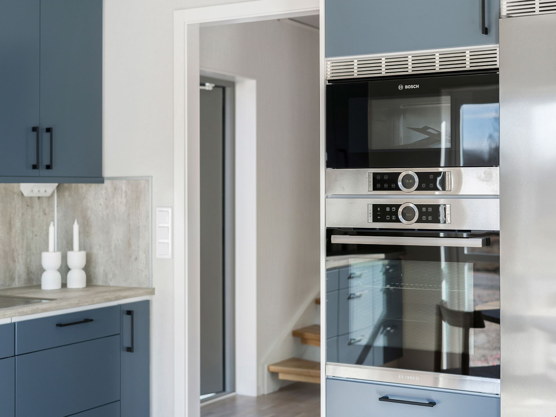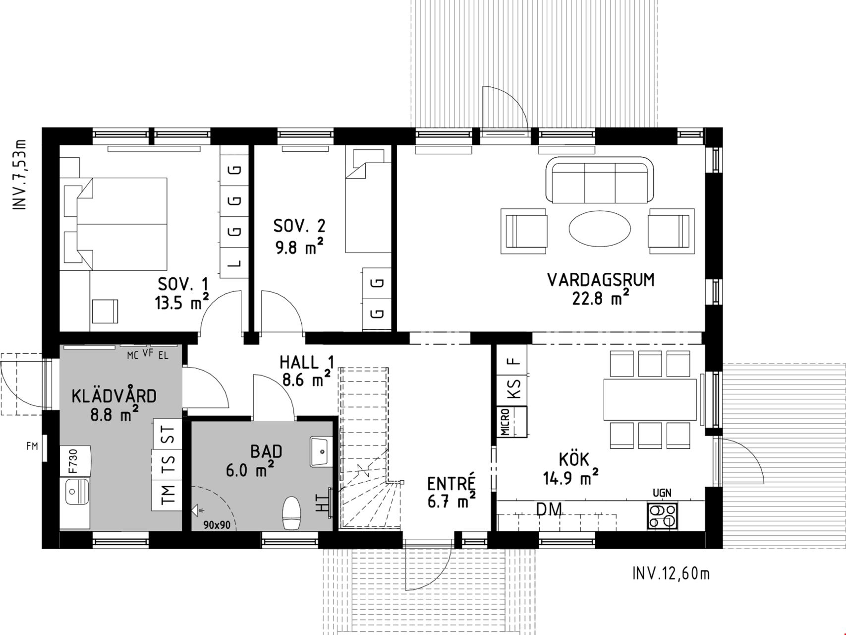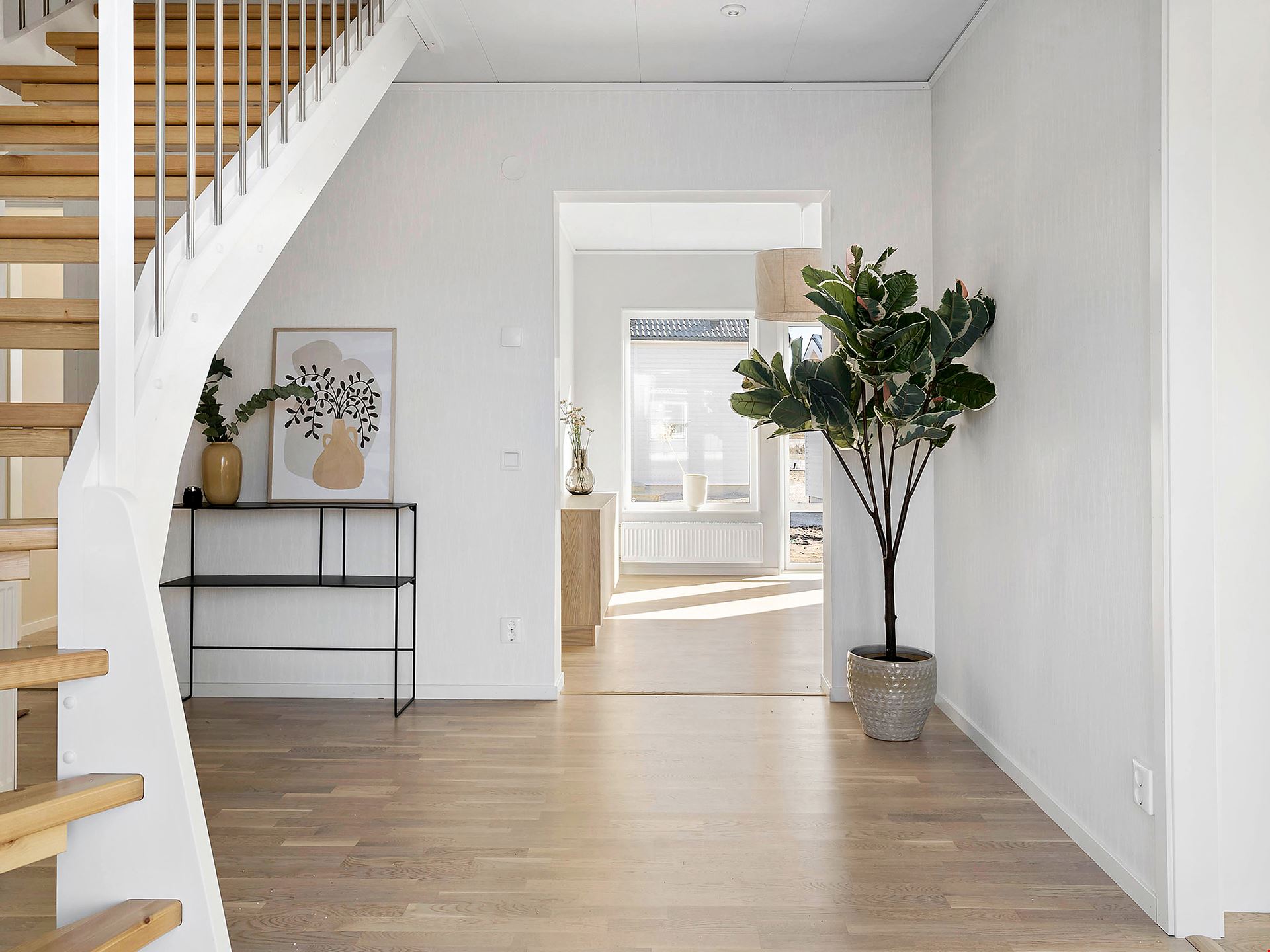 Husets första plan fördelar sig på 95 kvm och består av 3 rum och kök. När du kliver in i det här huset möts du av en rymlig hall med fri genomsikt ut mot trädgården på andra sidan. Från hallen tar du dig vidare in mot köket som ligger i öppen anslutning mot det vardagsrummet som bjuder på ett fantastiskt ljusinsläpp. Köket kommer från Vedum och är utrustat med vårt så kallade ”lyxkök”. Här får du ett kök med höga överskåp, dämpade lådor, mjukstängande luckor, högskåp för inbyggd ugn och micro, diskmaskin, rostfria vitvaror från Bosch, induktionshäll samt rostfri frihängande fläkt. I husets andra ände ligger de två sovrummen samlade intill husets tvättstuga och badrum. Badrummet är inrett med kakel och klinker med golvvärme, svart kommod, duschhörn samt en vattenburen svart handdukstork.