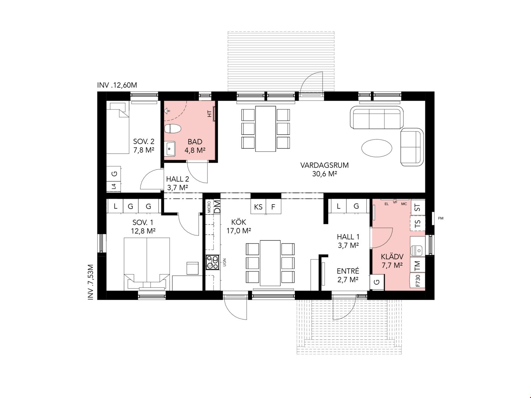 Köket rymmer matbord för 6 personer och glider på ett trivsamt sätt över i vardagsrummet där utgång till altanen väntar. Här möts man i mitten, helt enkelt. På var sin sida väntar sedan både badrum och sovrum, tre till antalet som standard varav två stora sådana. Nöjer ni er med två sovrum kan du välja att ta bort ett till förmån för ett större vardagsrum. Ett annat, ytterst trevligt, alternativ är att använda en liten bit av entrén till en extra toalett – extra smart om din Villa Näsby kommer att jobba som fritidshus framöver. Mycket hus för kvadratmetrarna, helt enkelt