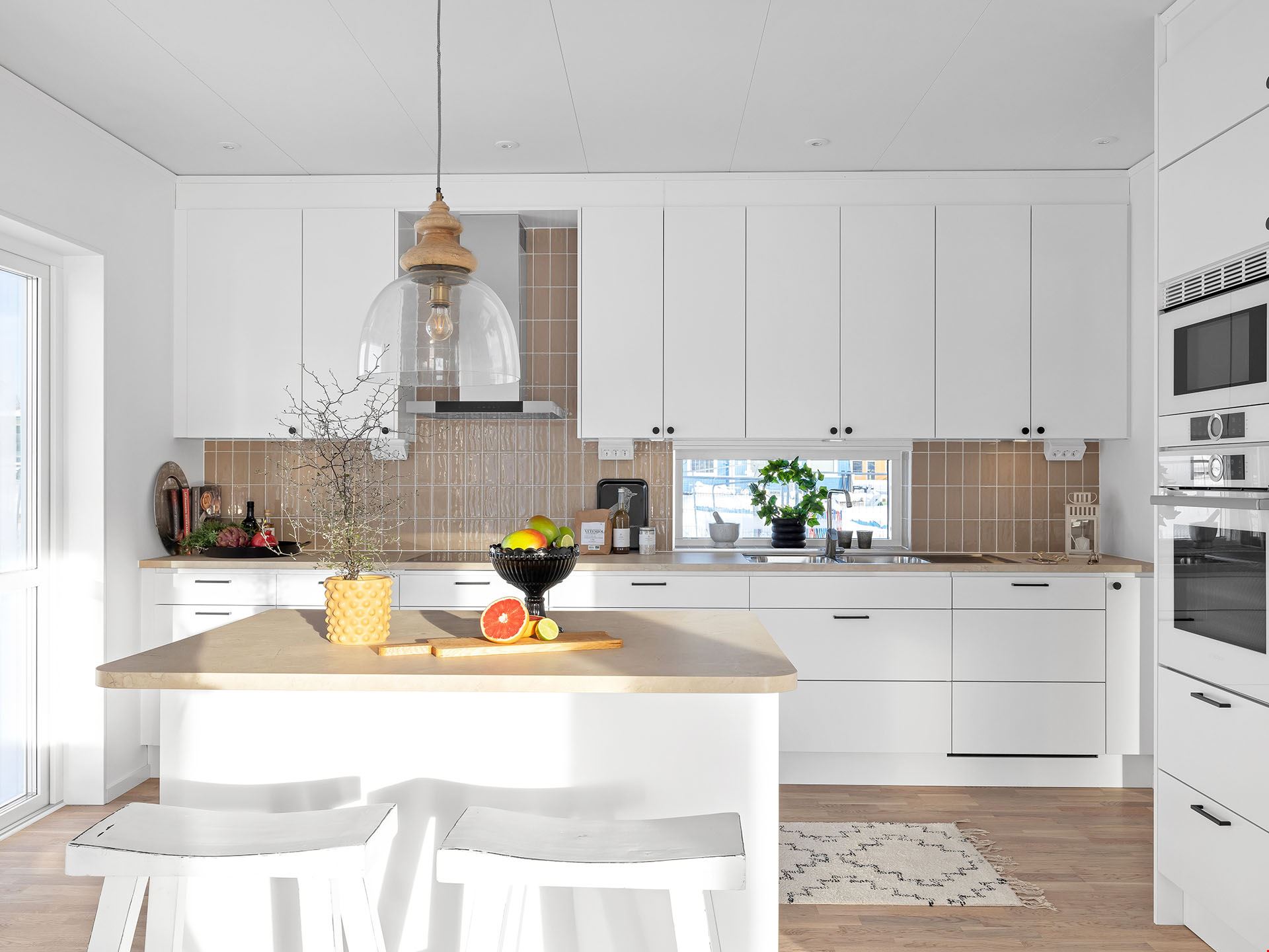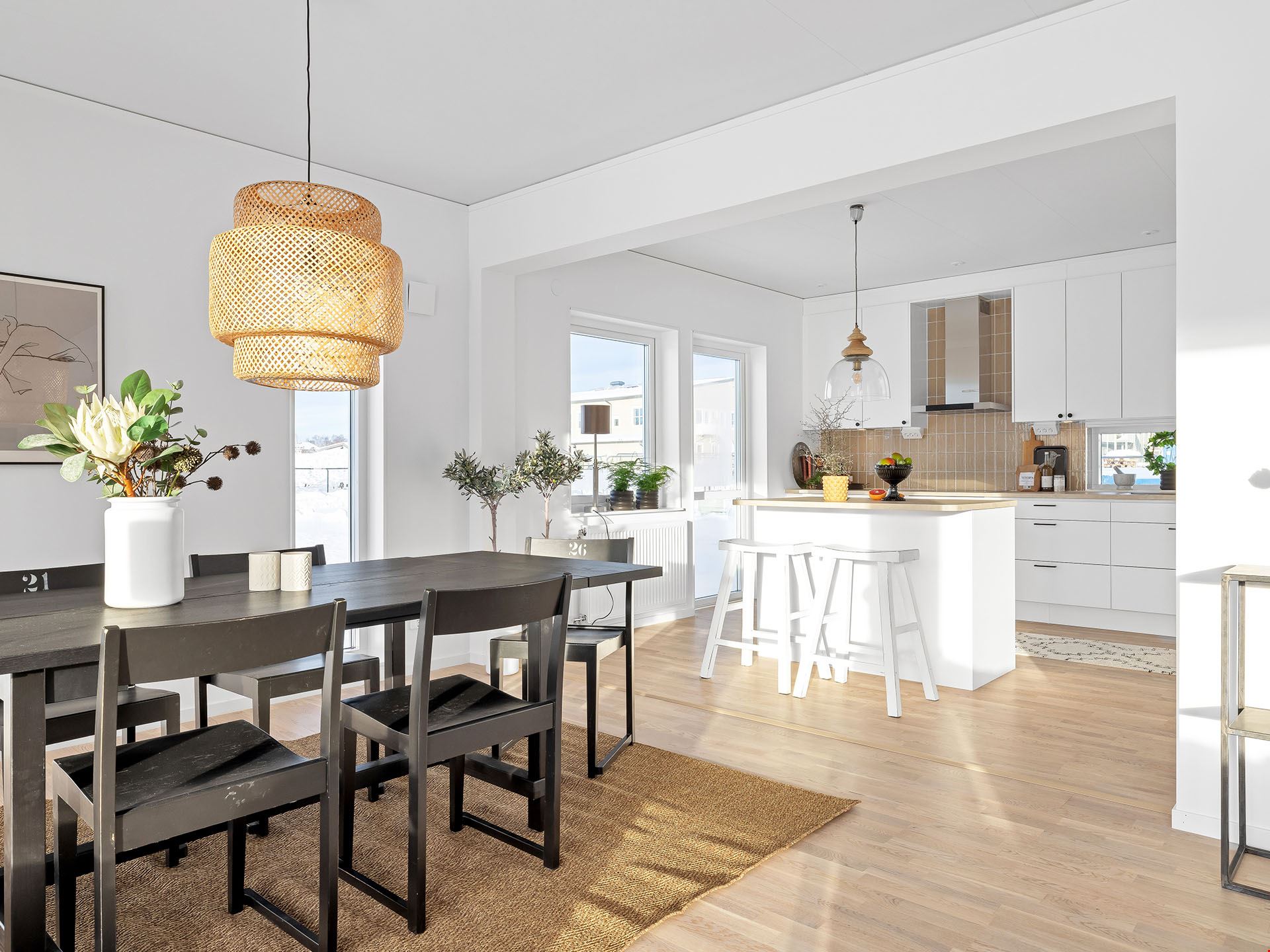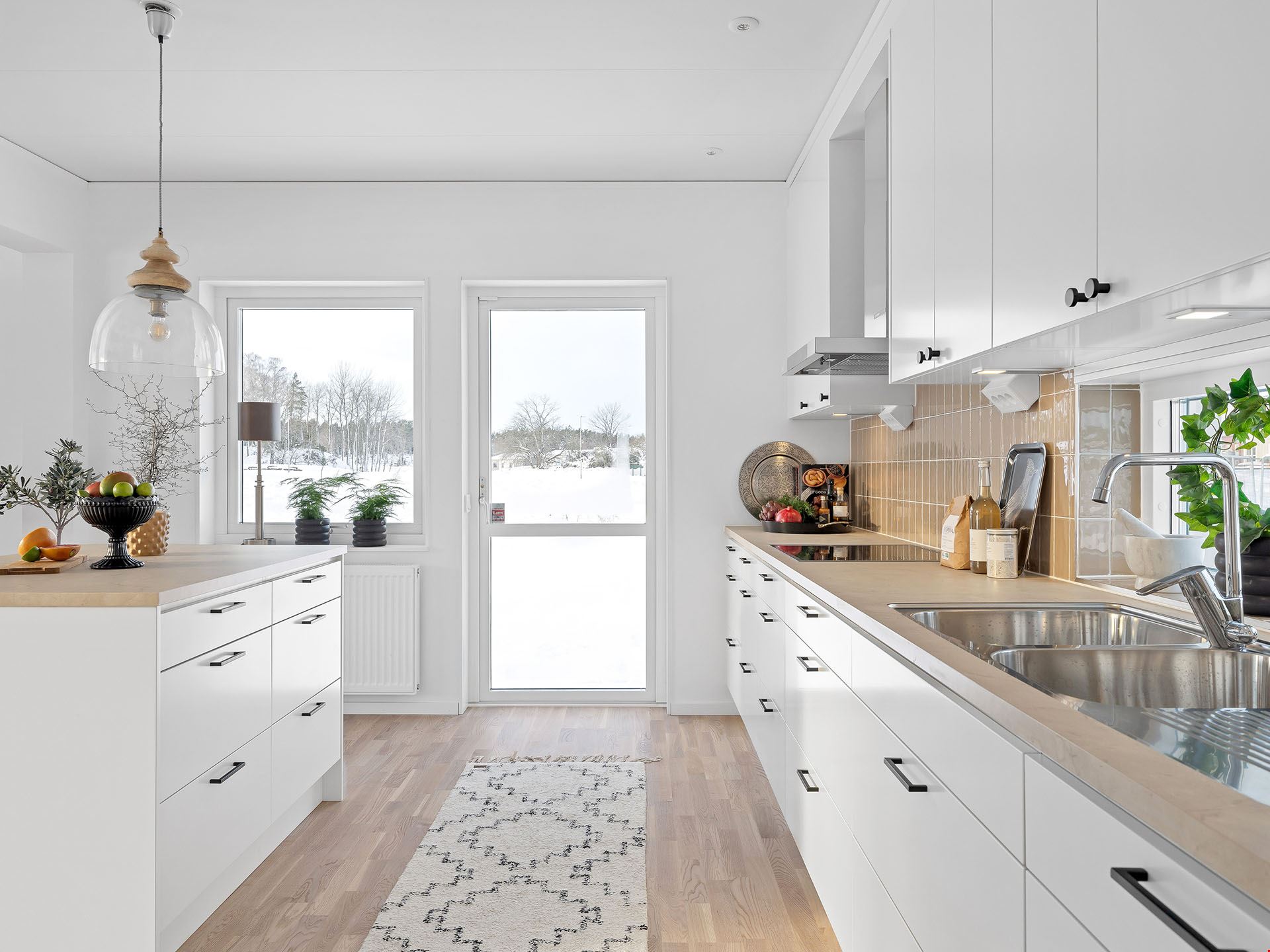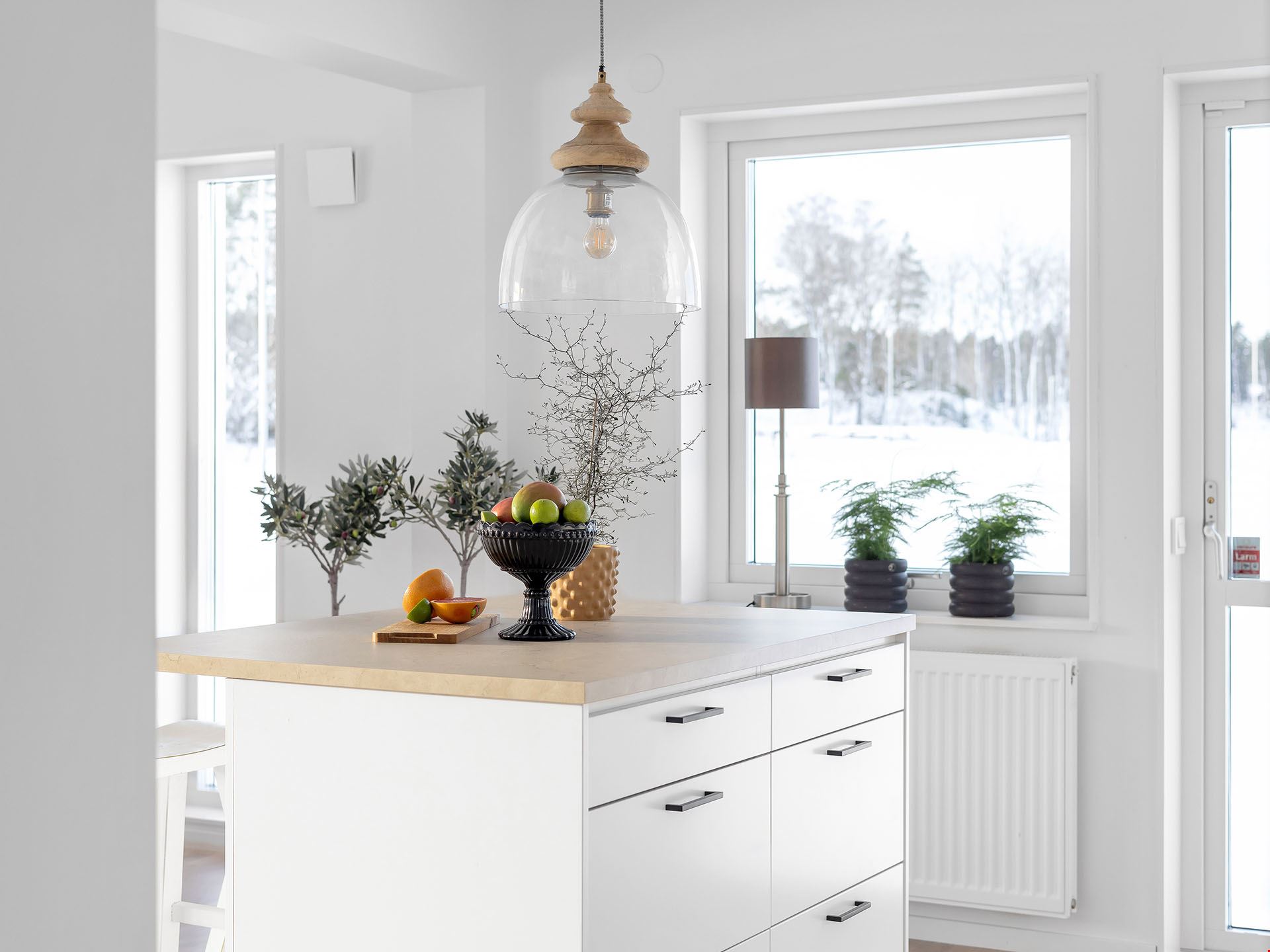 När du kliver in i det här huset möts du av en rymlig hall med fri sikt ut mot trädgården utanför. Vi smiter först in i köket, ett modernt och trivsamt sådant med bra arbetsytor och köksö. Här finns också utgång till en eventuell framtida uteplats.