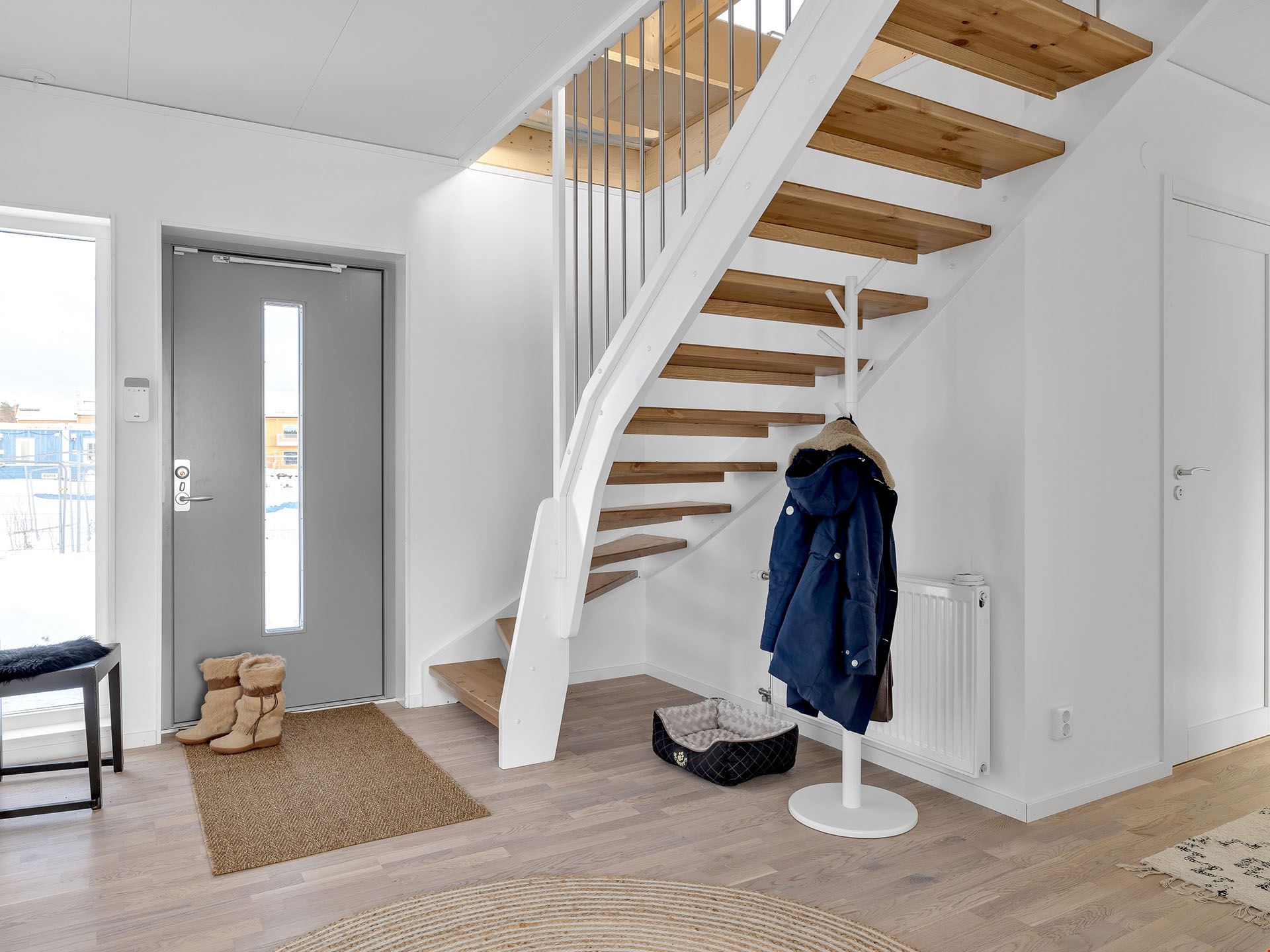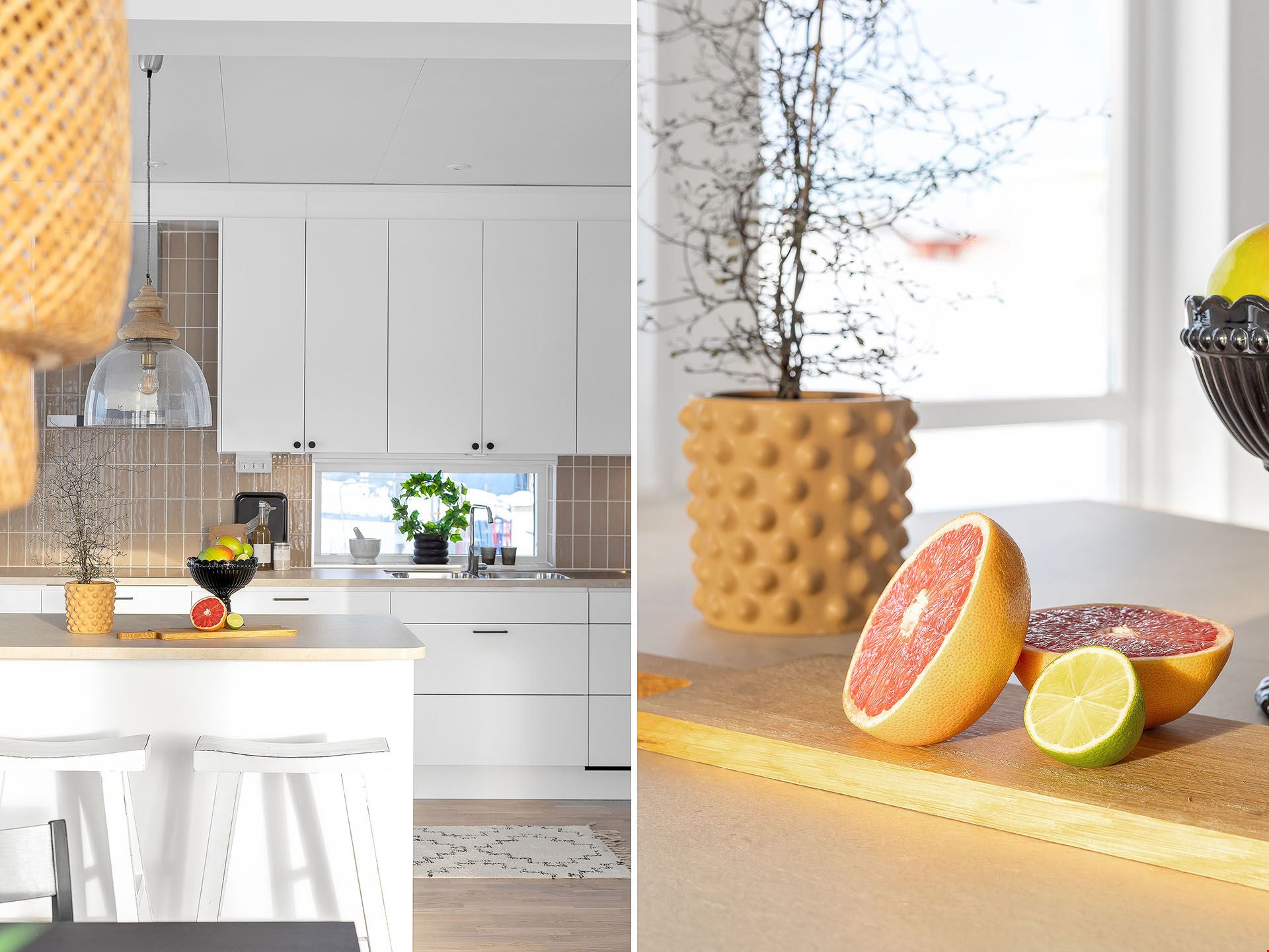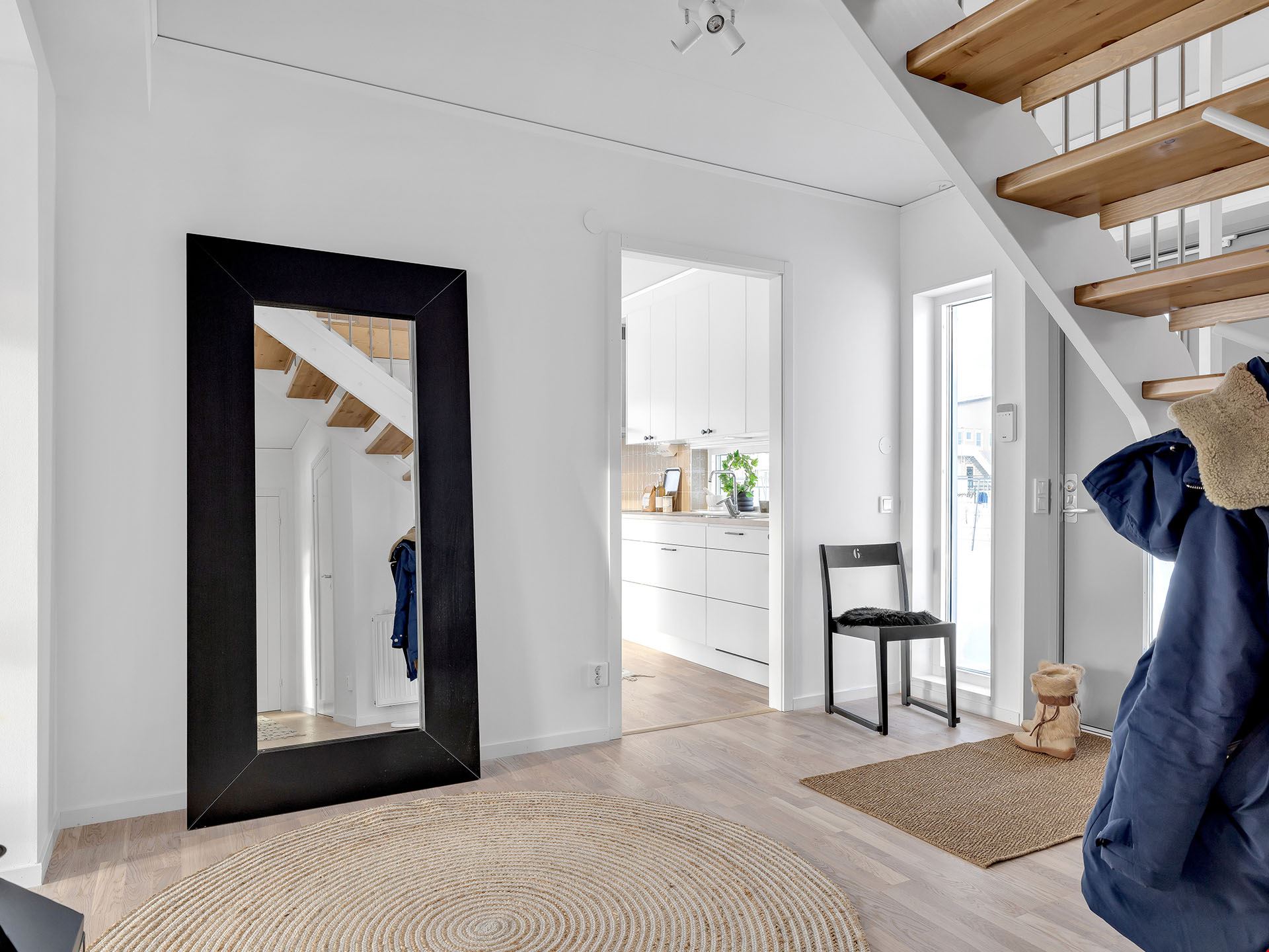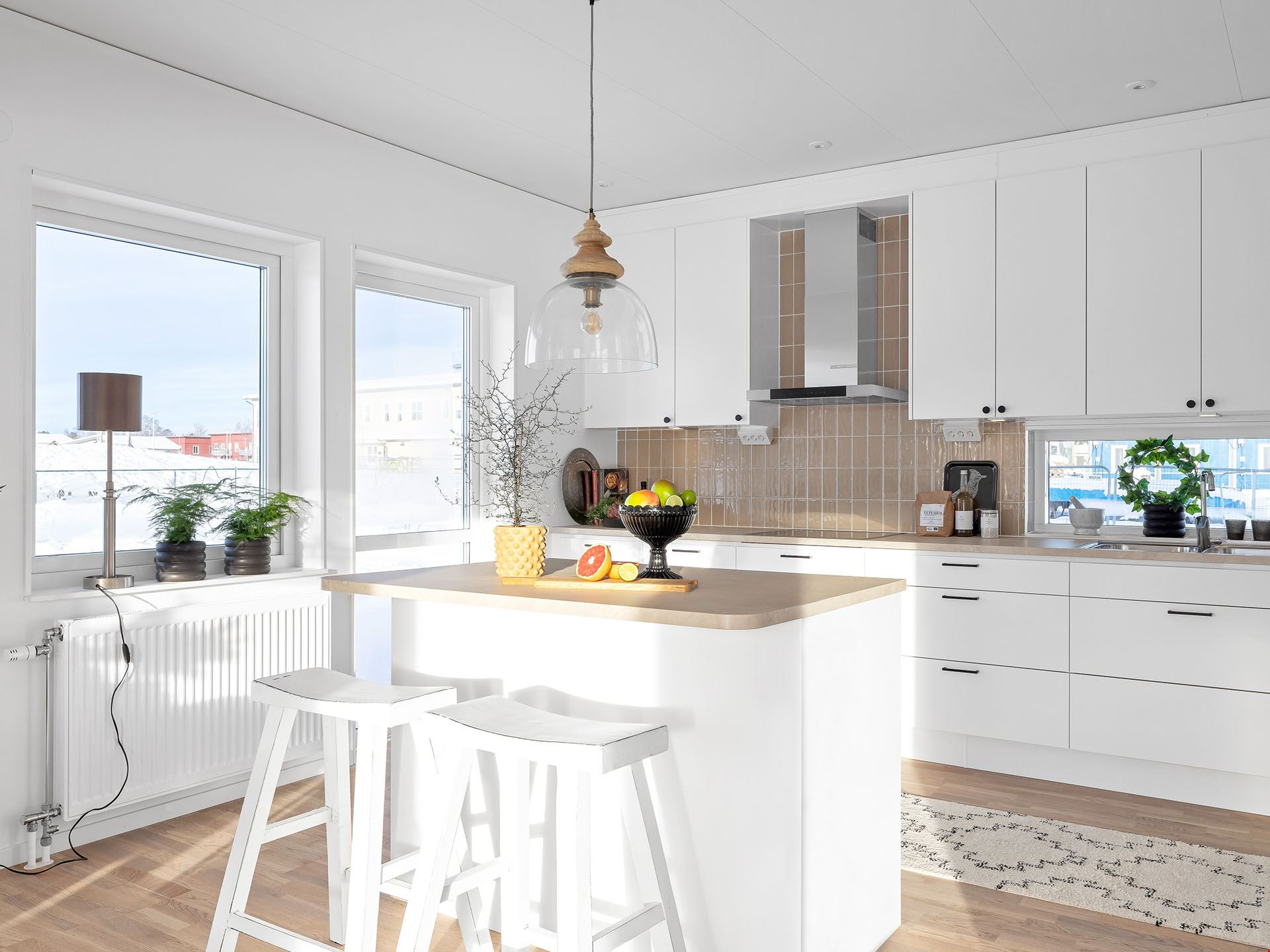 När du kliver in i det här huset möts du av en rymlig hall med fri sikt ut mot trädgården utanför. Vi smiter först in i köket, ett modernt och trivsamt sådant med bra arbetsytor och köksö. Här finns också utgång till en eventuell framtida uteplats.