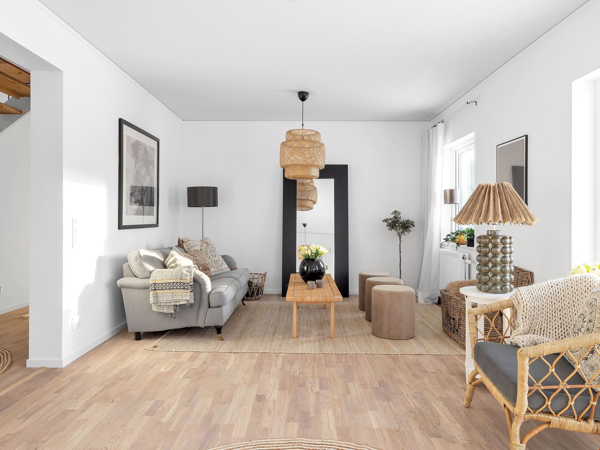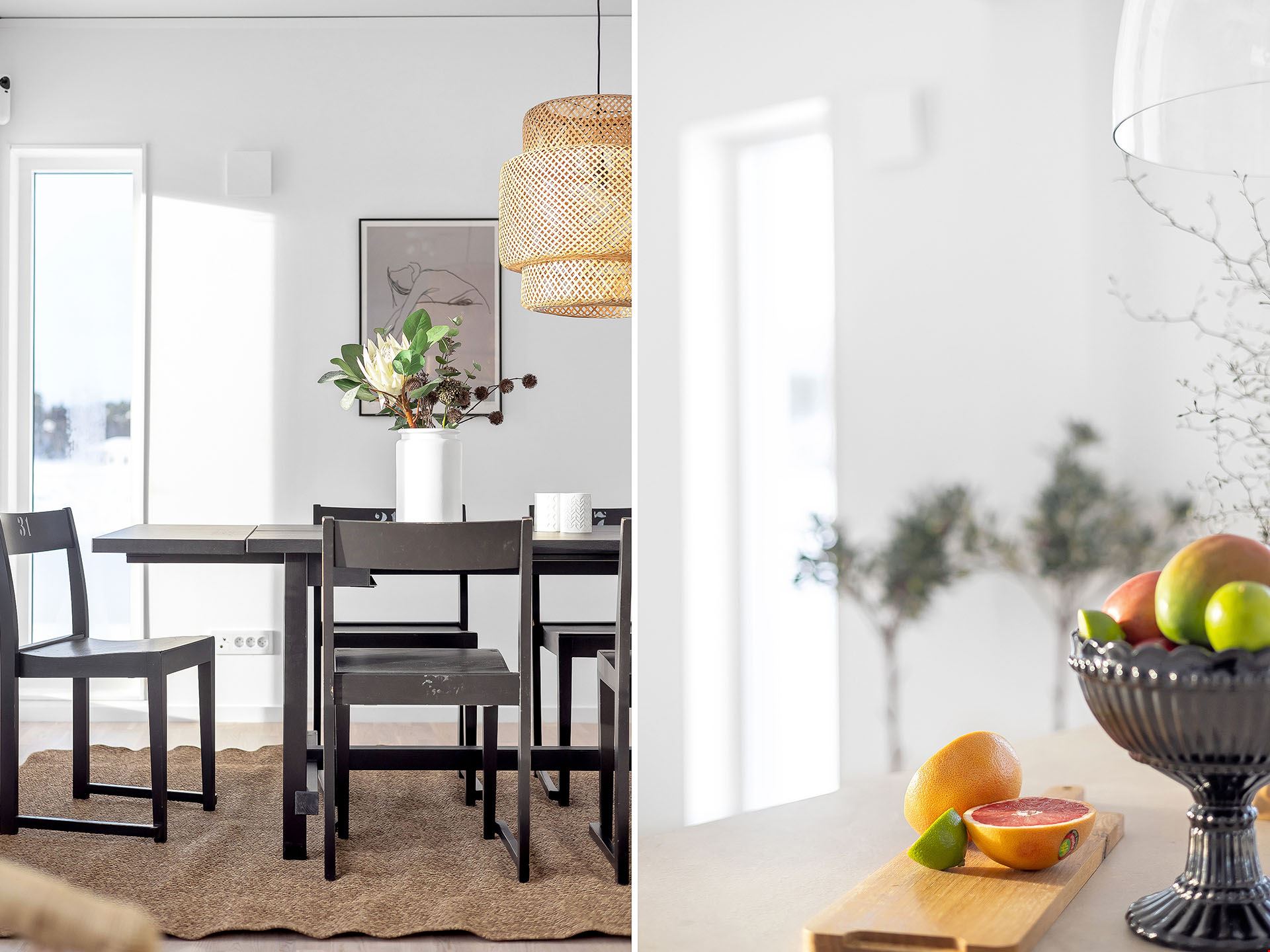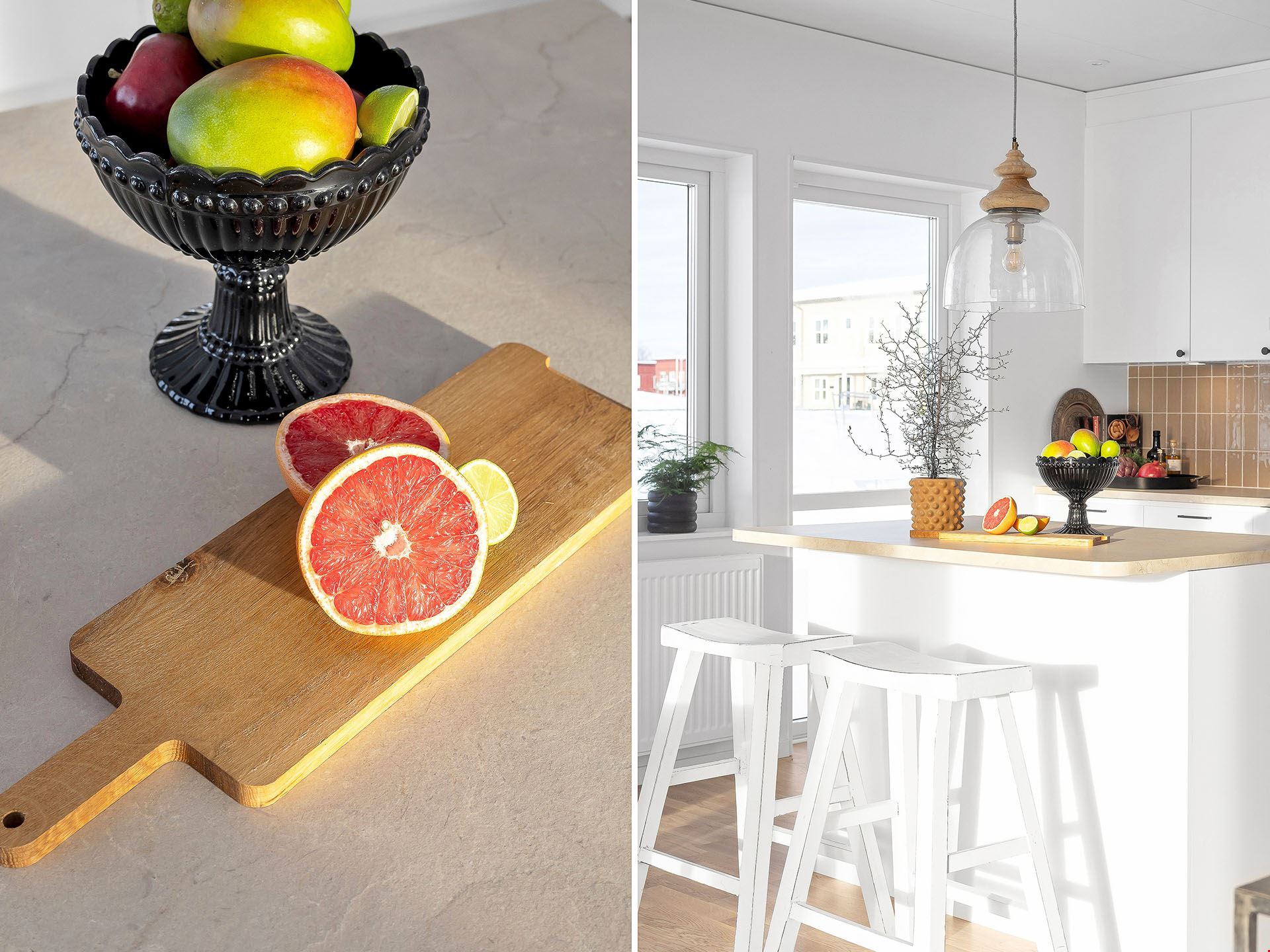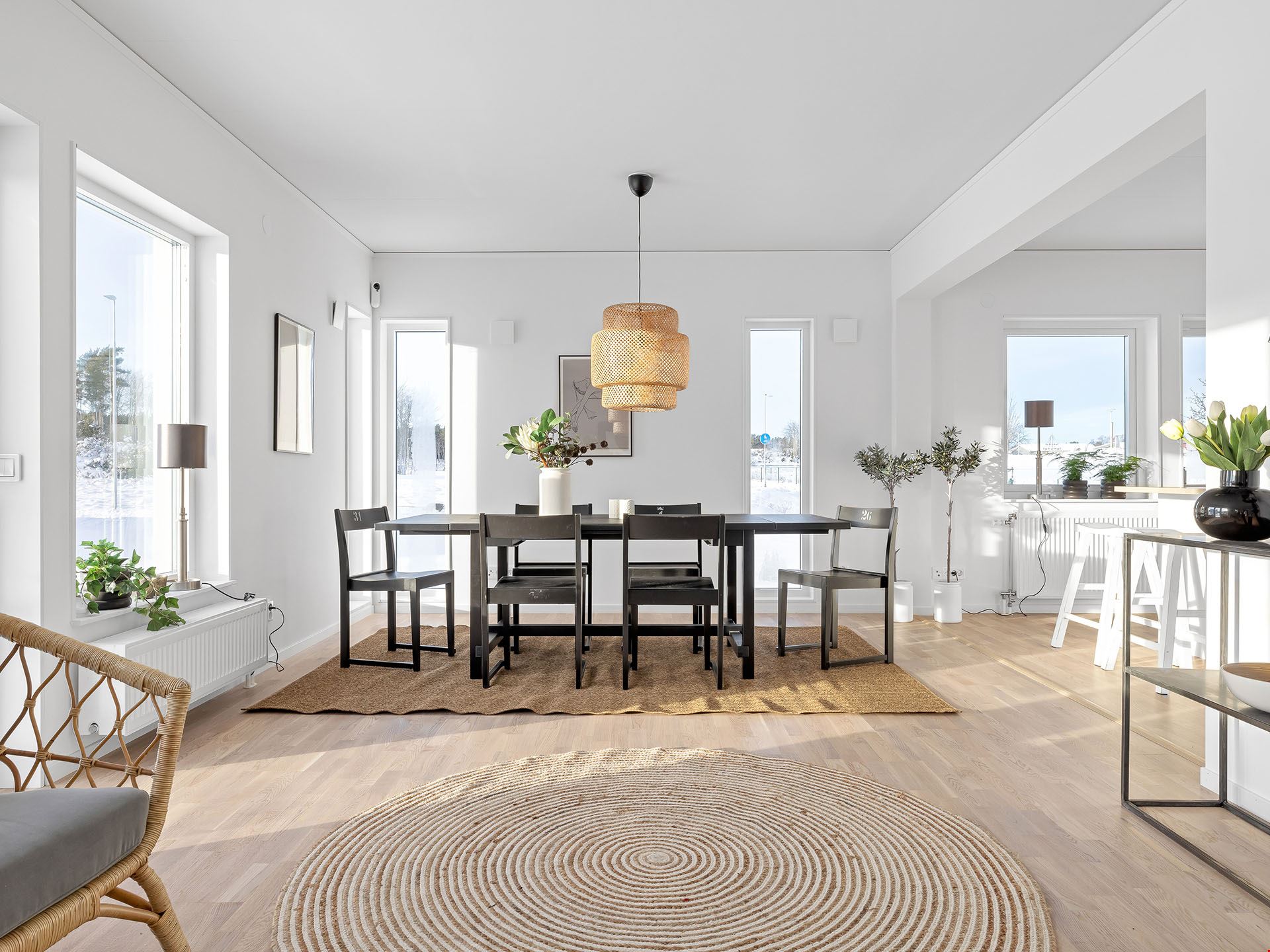 När du kliver in i det här huset möts du av en rymlig hall med fri sikt ut mot trädgården utanför. Vi smiter först in i köket, ett modernt och trivsamt sådant med bra arbetsytor och köksö. Här finns också utgång till en eventuell framtida uteplats.