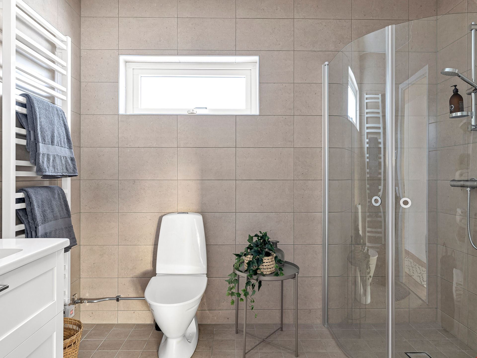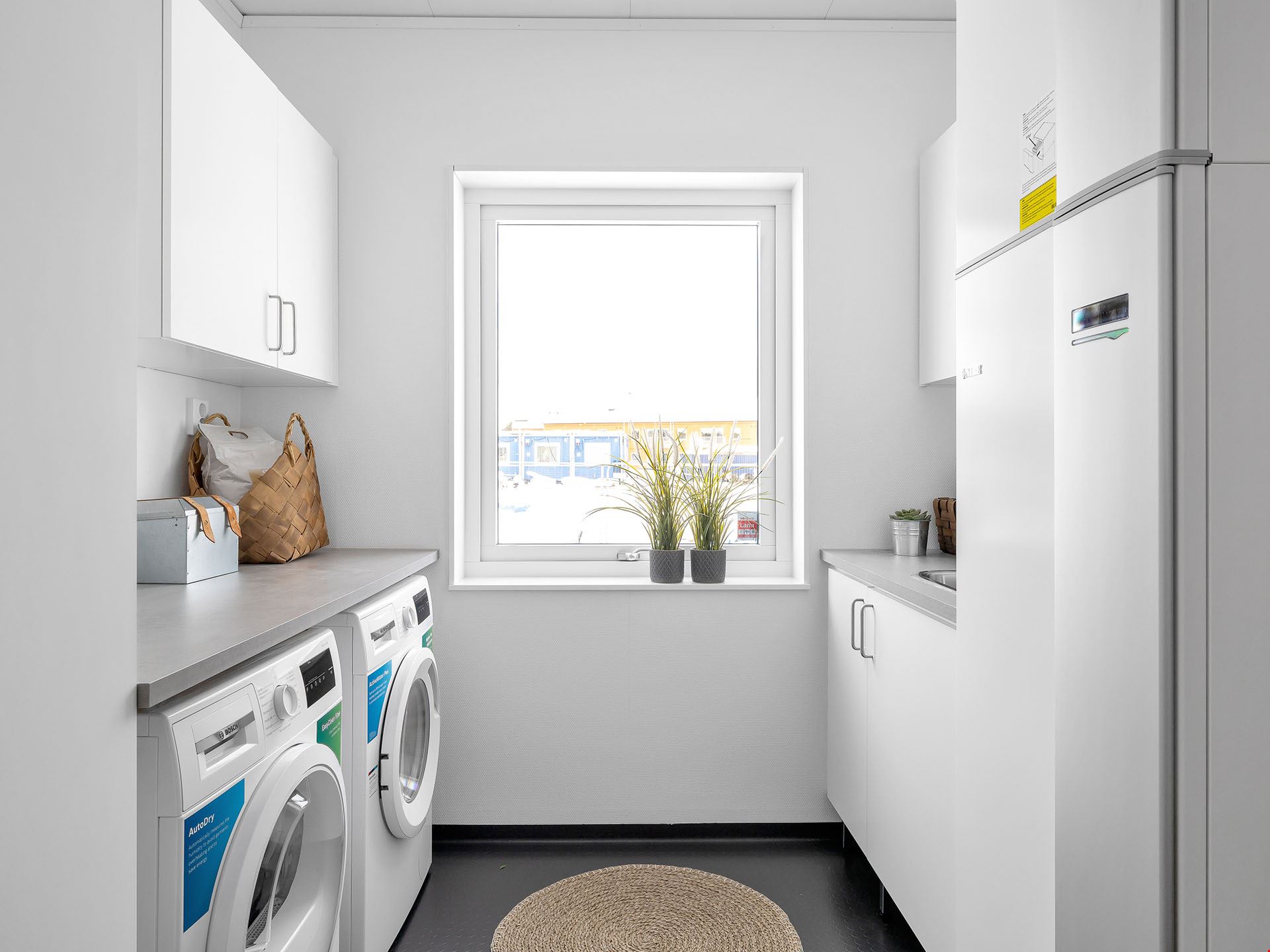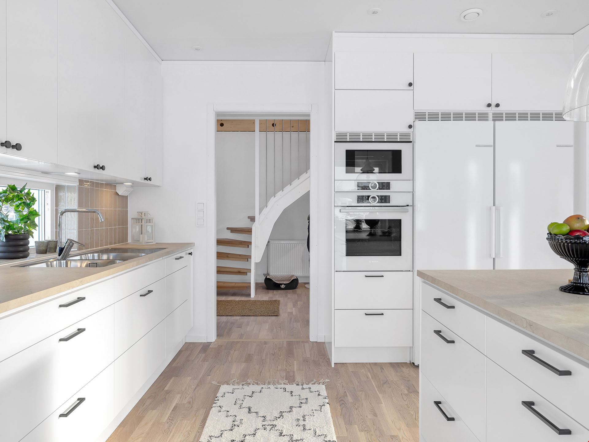 Här behöver du inte krångla med mängder av tillval. Vi har vi valt vårt lyxigaste kök från Vedum, med höga överskåp, dämpade lådor, mjukstängande luckor, inbyggd ugn och mikro i högskåp, integrerad diskmaskin, vita vitvaror och frihängande fläkt. Alla vitvaror kommer från Bosch. Badrummet bjuder på kakel och klinker med komfortgolvvärme, inredning från Vedum och en stilren duschhörna – och i tvättstugan väntar både tvättmaskin och torktumlare på att ta hand om din tvätt.