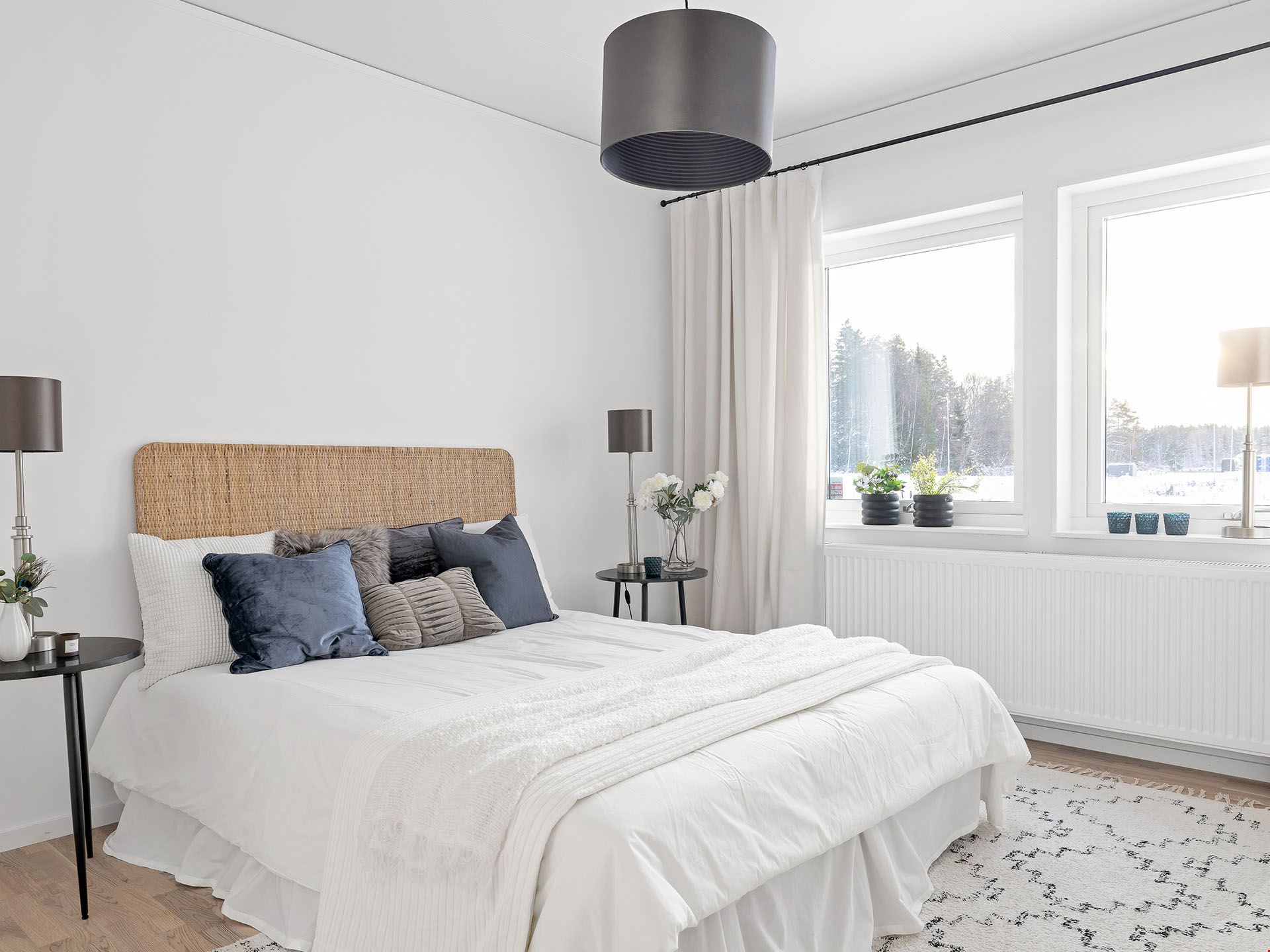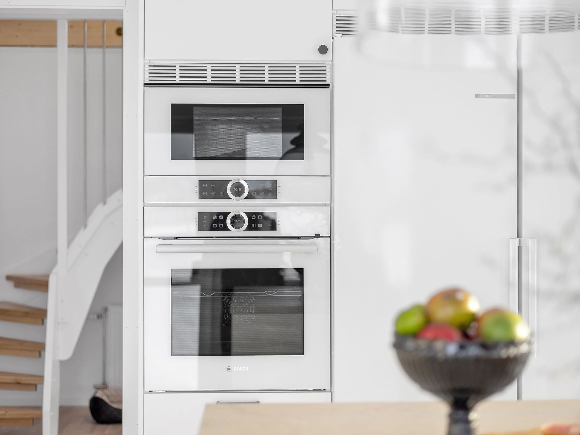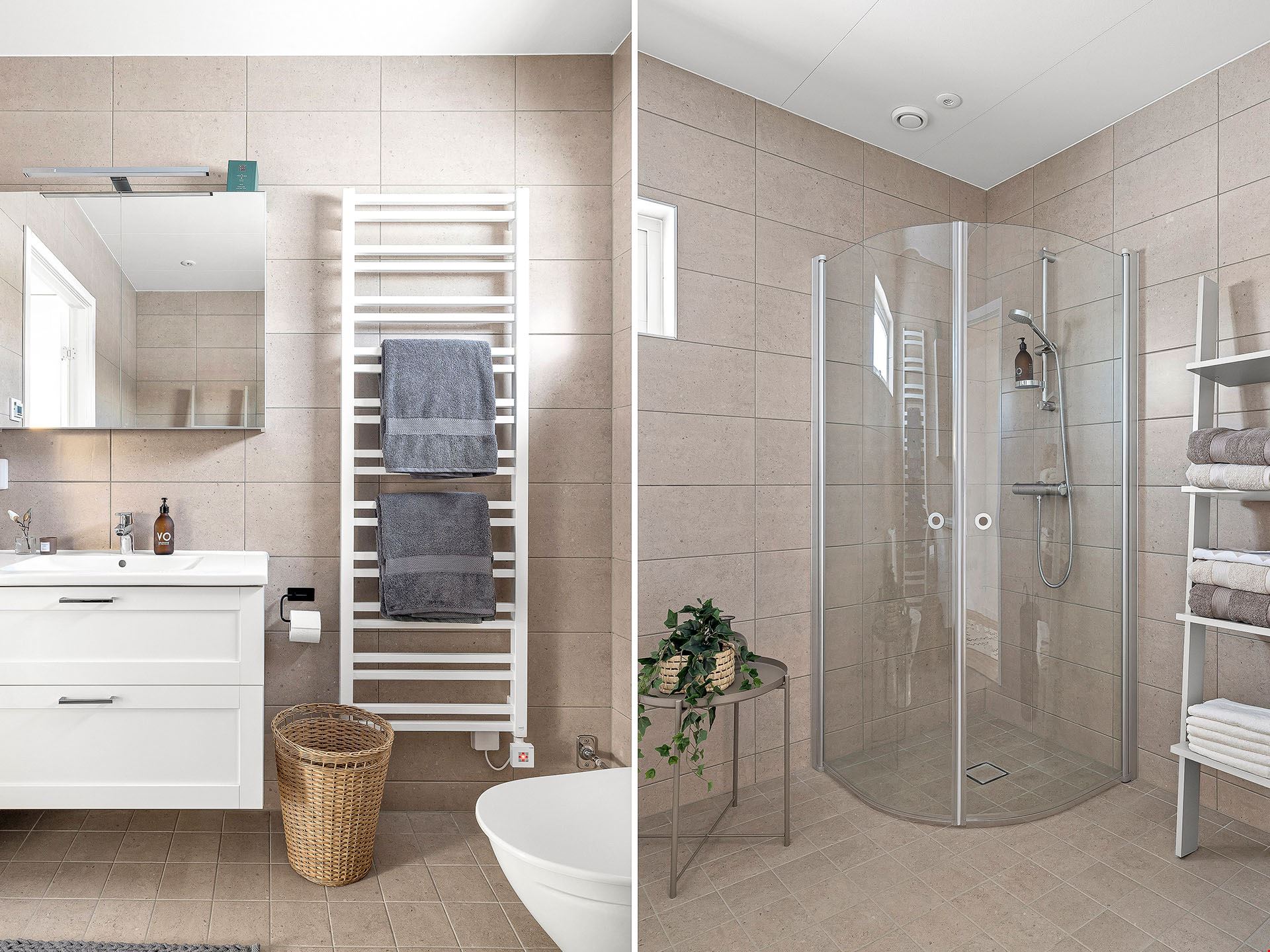 Här behöver du inte krångla med mängder av tillval. Vi har vi valt vårt lyxigaste kök från Vedum, med höga överskåp, dämpade lådor, mjukstängande luckor, inbyggd ugn och mikro i högskåp, integrerad diskmaskin, vita vitvaror och frihängande fläkt. Alla vitvaror kommer från Bosch. Badrummet bjuder på kakel och klinker med komfortgolvvärme, inredning från Vedum och en stilren duschhörna – och i tvättstugan väntar både tvättmaskin och torktumlare på att ta hand om din tvätt.