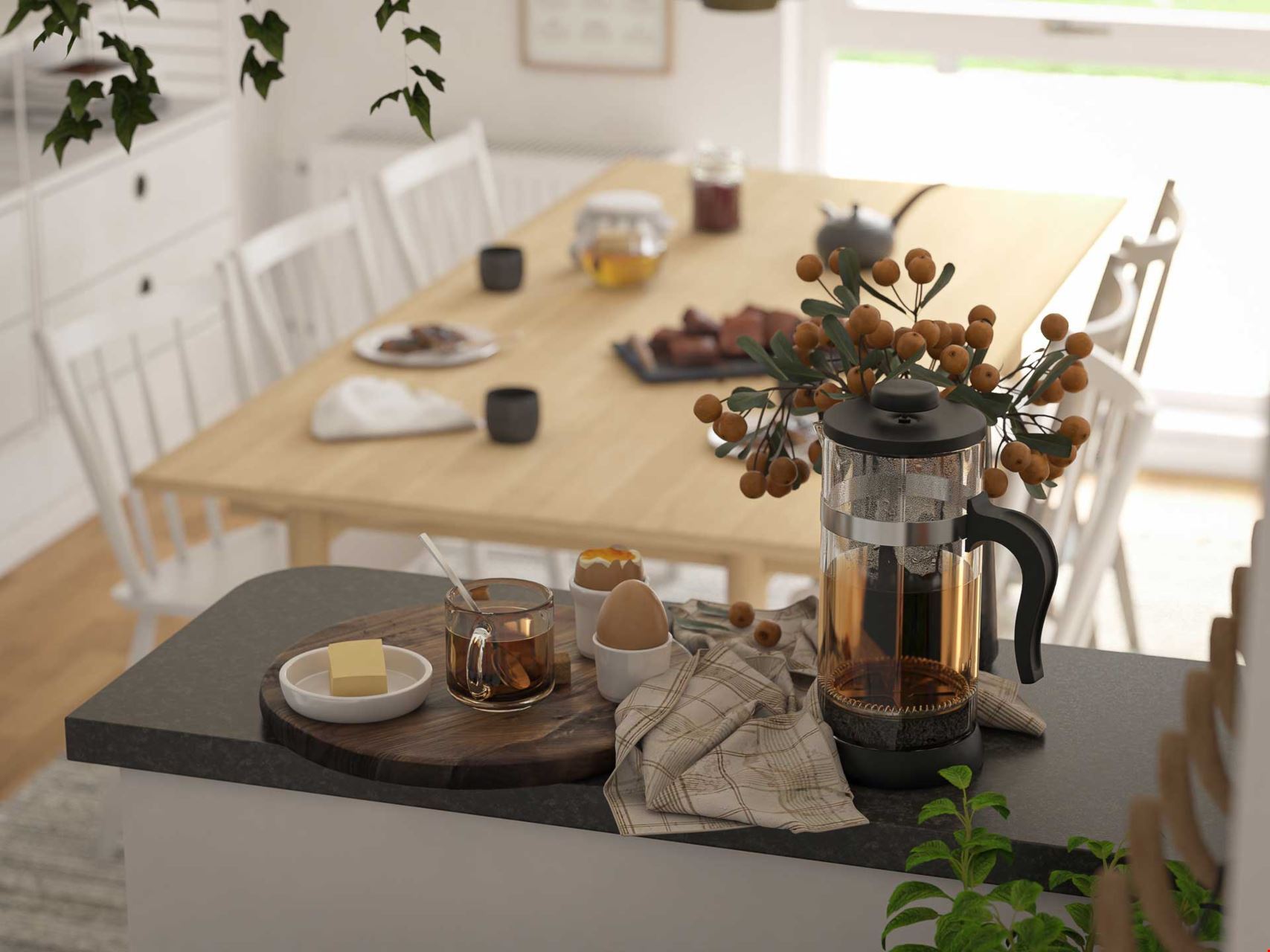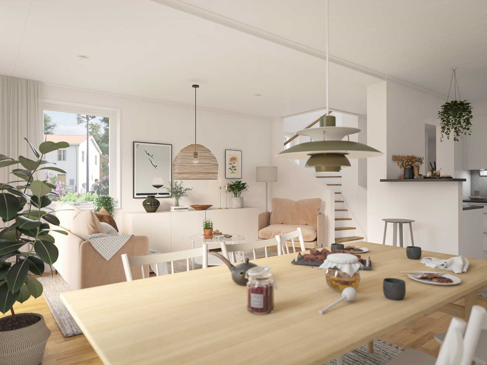 Den luftiga vardagsrumsdelen har gott om plats för ett rejält matbord, utan att försaka soffmyset.  Härifrån kliver du direkt ut på din stora altan med trädäck där det finns plats för alla tänkbara trevligheter: från familjefrukostar till släktkalas och grillkvällar med vännerna. Kanske sträcker sig festligheterna ända ut på gräsmattan nedanför?
