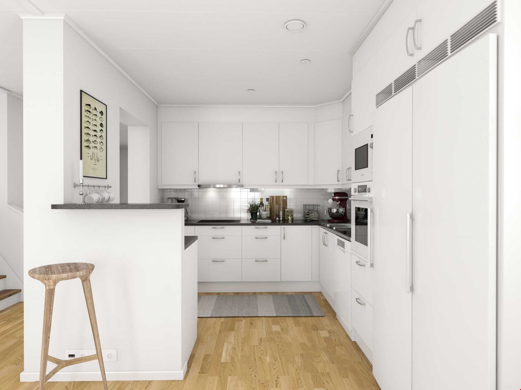 Det moderna köket är utrustat för alla tänkbara matlagningsäventyr. Här finns fullstor kyl och frys, ugn, glaskeramikhäll, mikrovågsugn, diskmaskin och rejäla arbetsytor. Köket är helt öppet mot matplatsen och vardagsrummet, vilket skapar en härlig social yta. Lätt att förbereda middagen samtidigt som du är social med familj eller vänner.