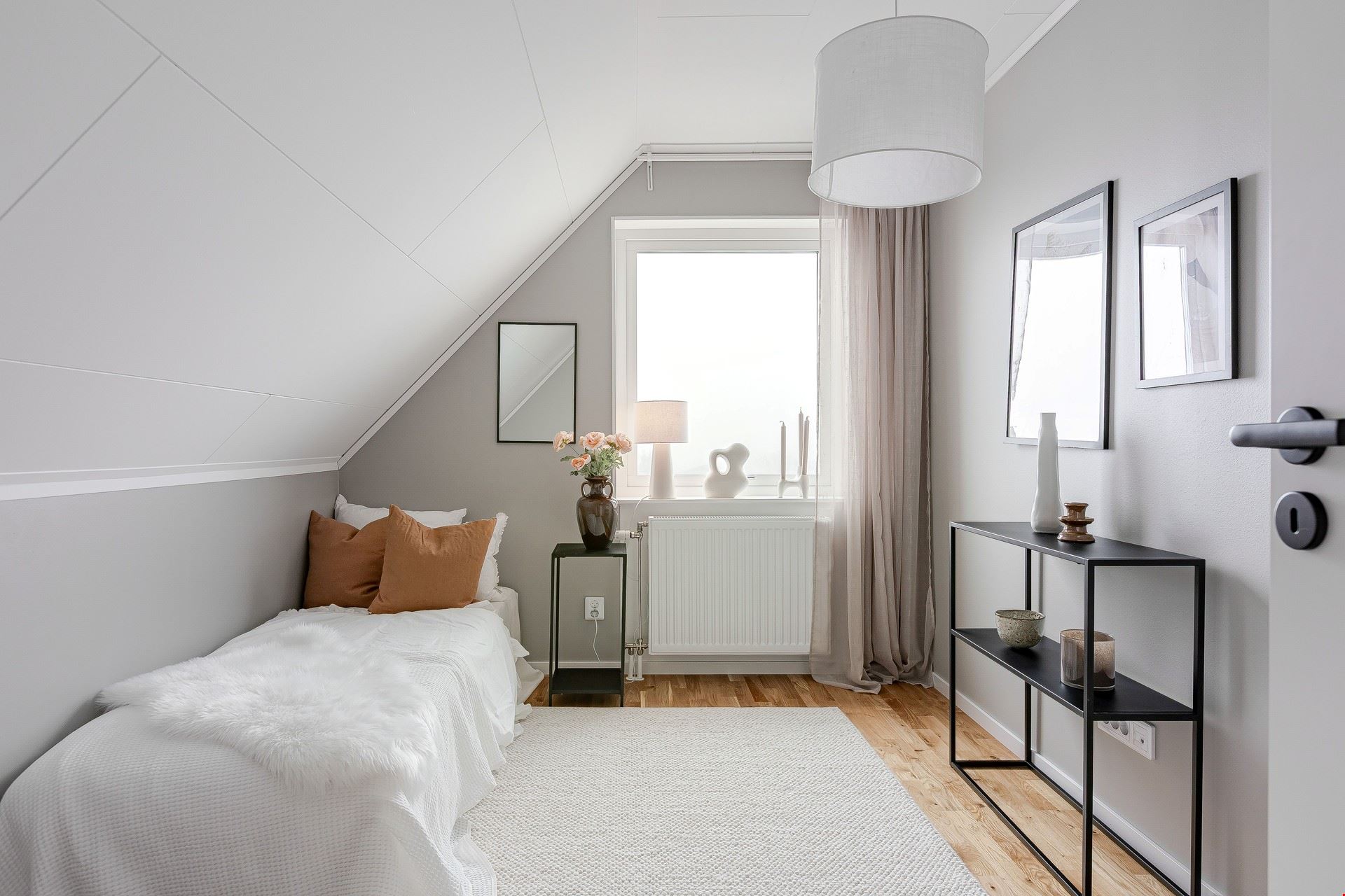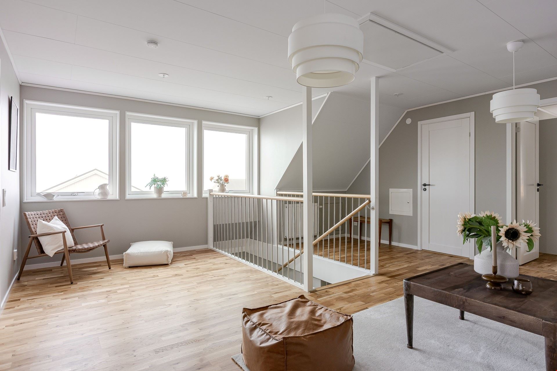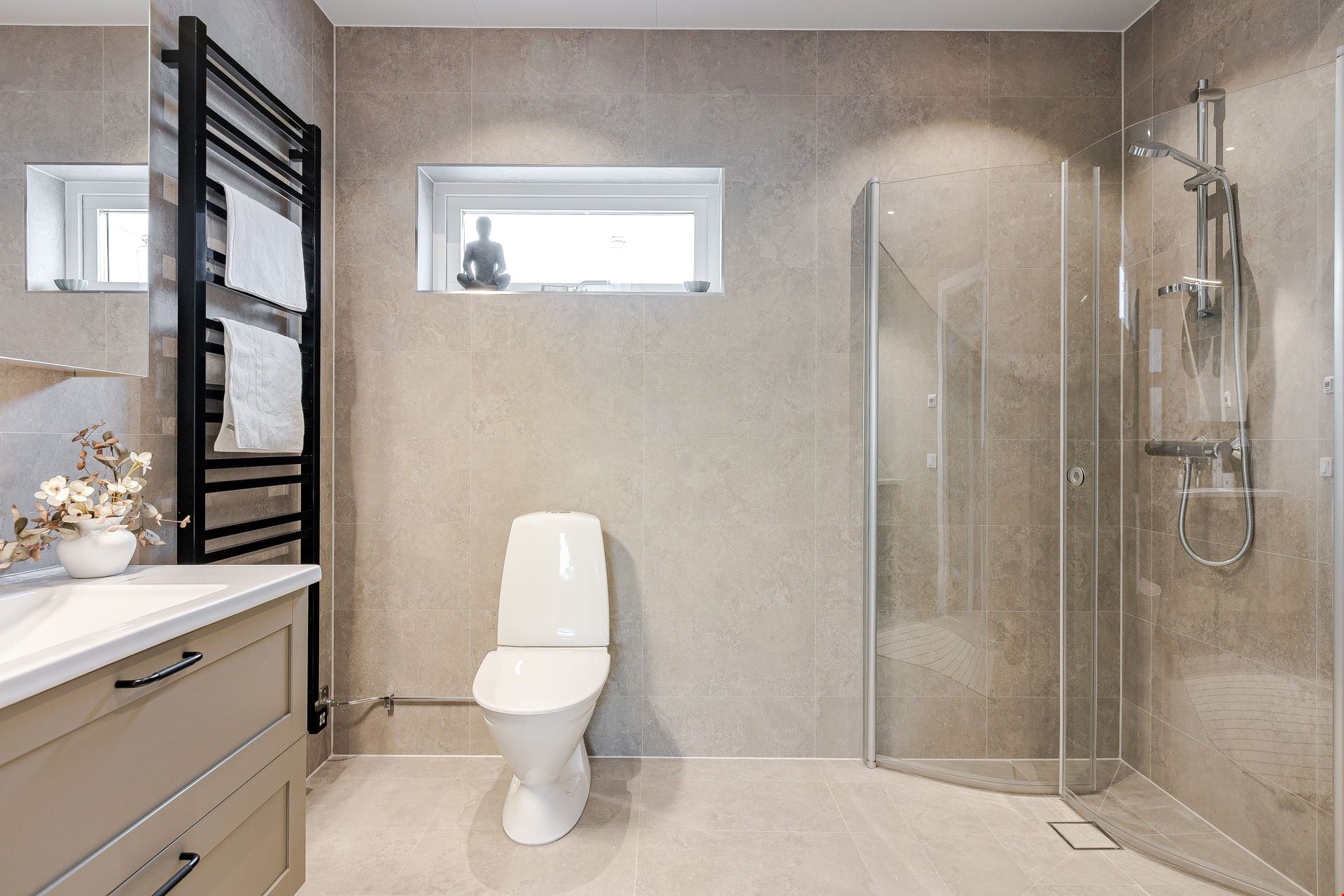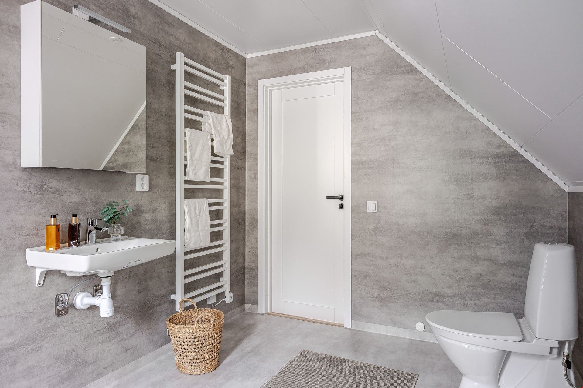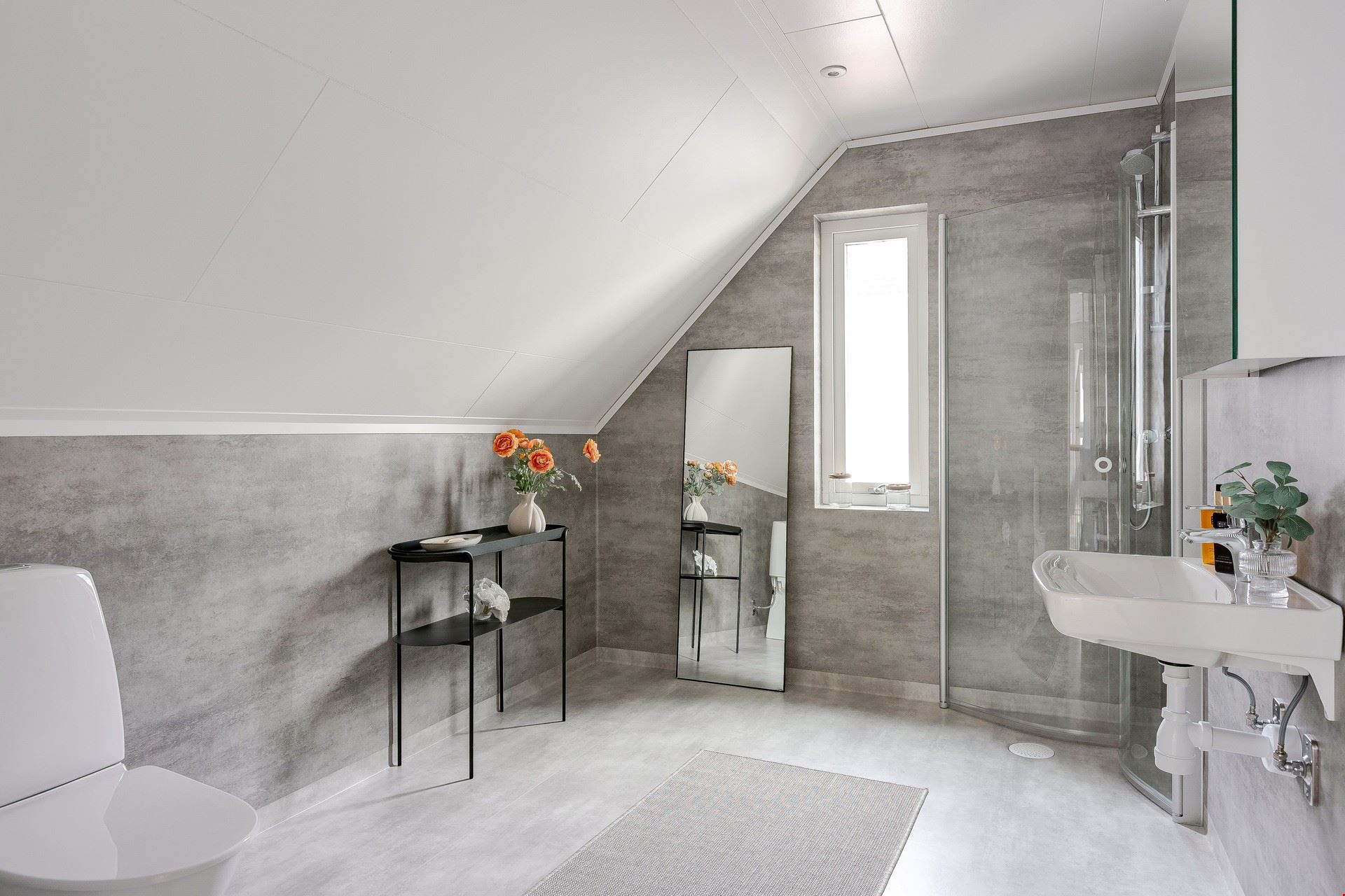 När du kommer in möts du av ett slitstarkt högtrycksgolv i nyansen Blackstone. På entréplan ligger två av husets fem sovrum, tillsammans med ett av de två badrummen som är helkaklat i York greige med komfortvärme, duschhörna, kommod och handdukstork. Övervåningen bjuder på ytterligare tre sovrum, ett badrum med dagsljusinsläpp samt ett allrum med takkupa – perfekt som lekrum, filmhörna eller hemmakontor.