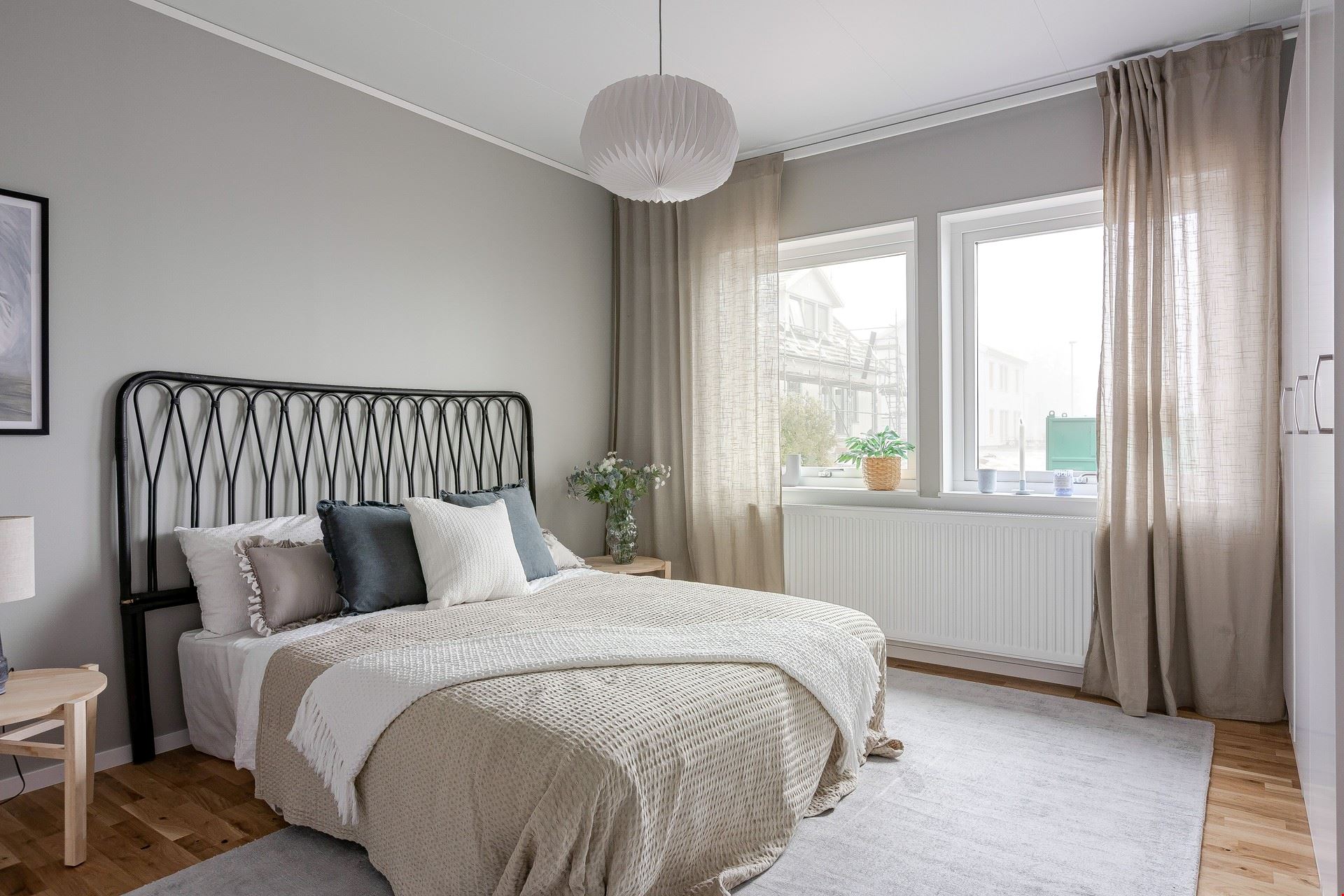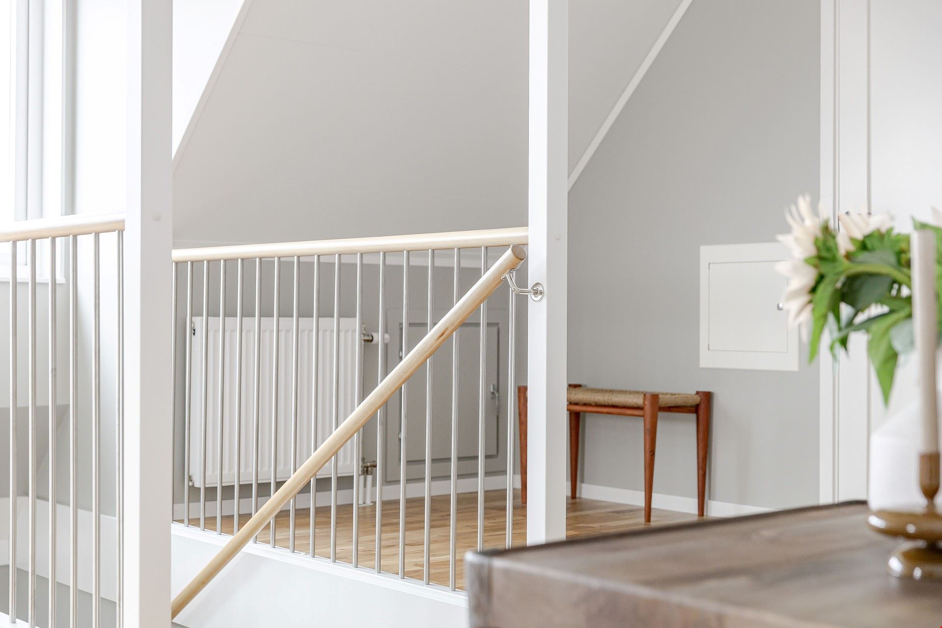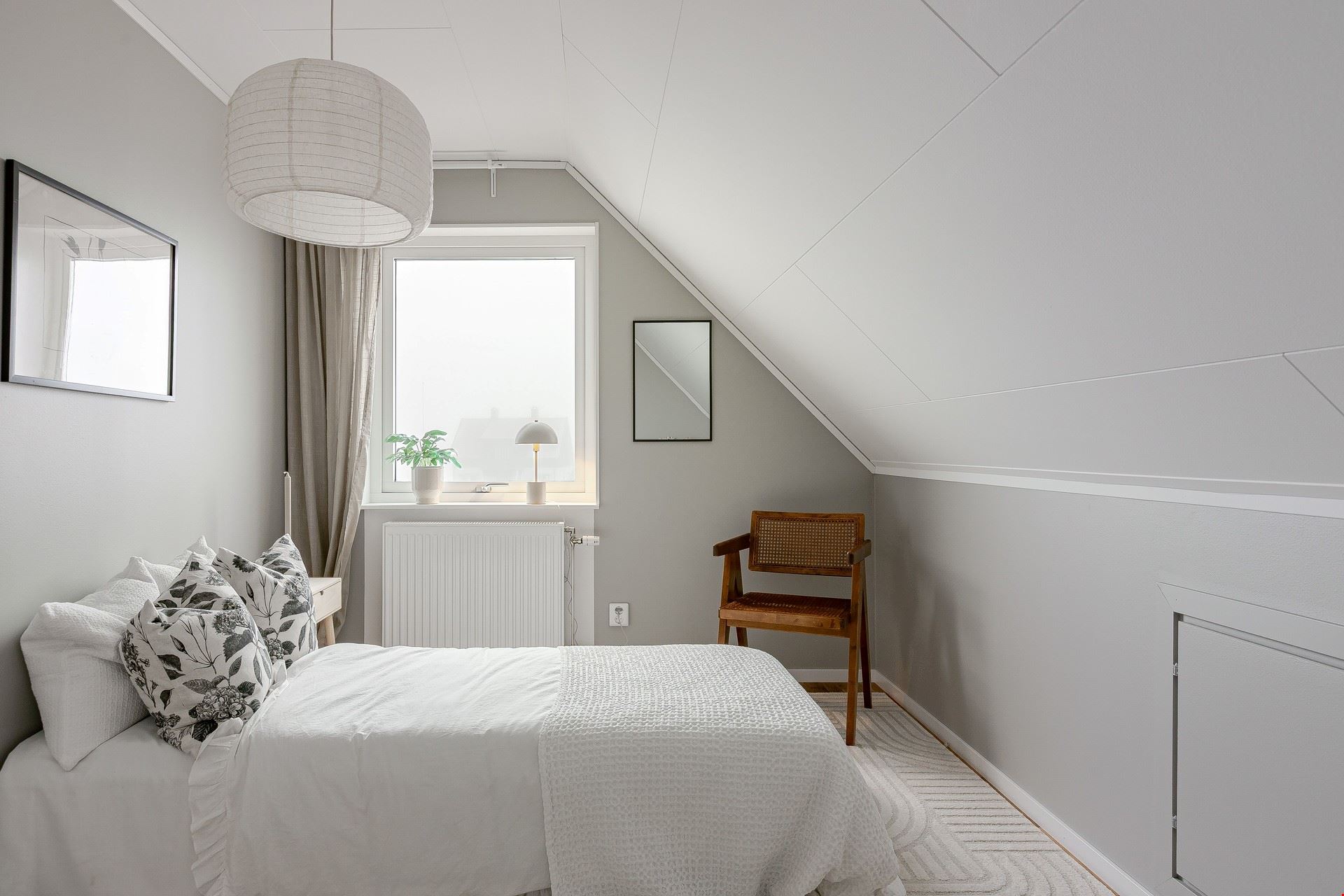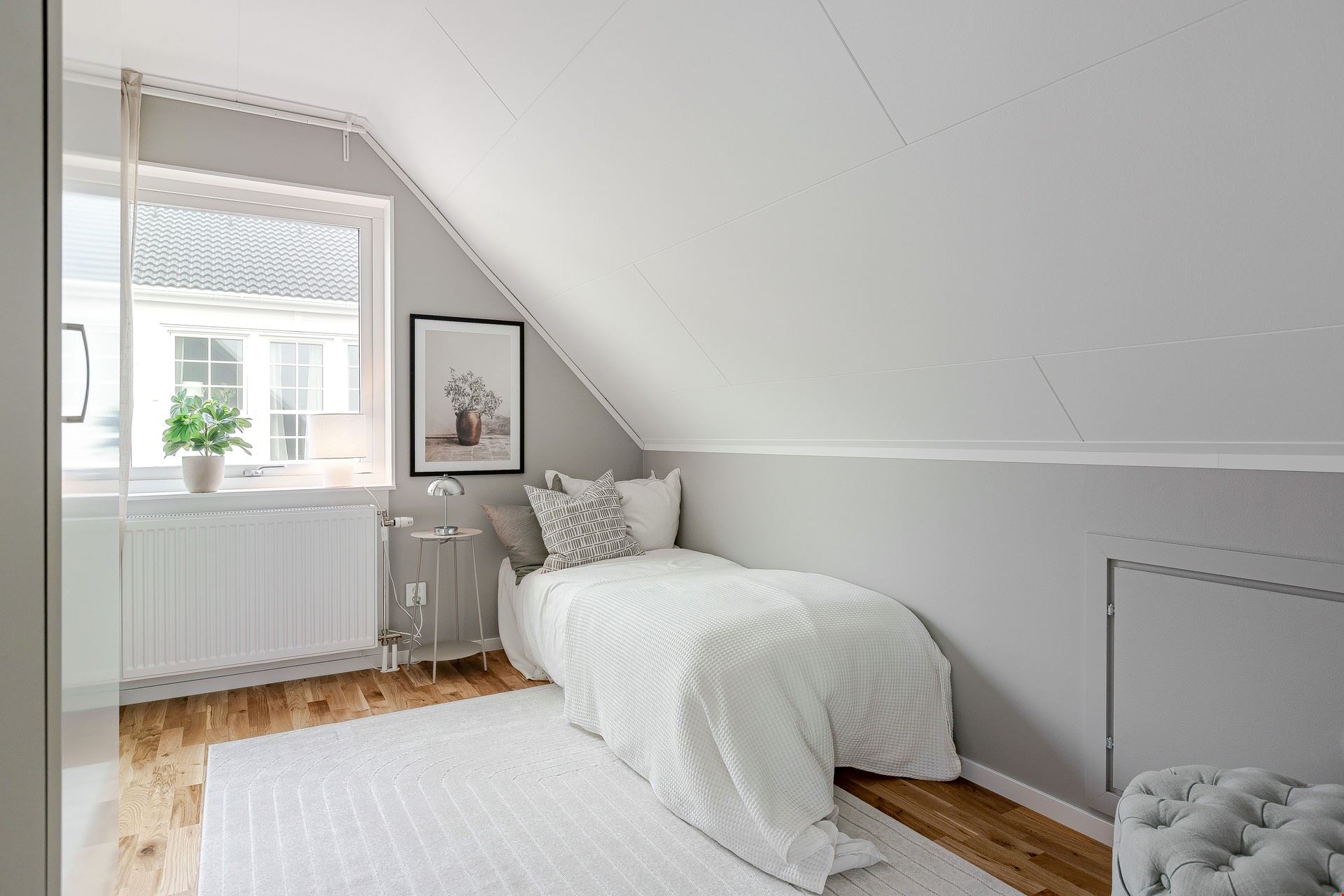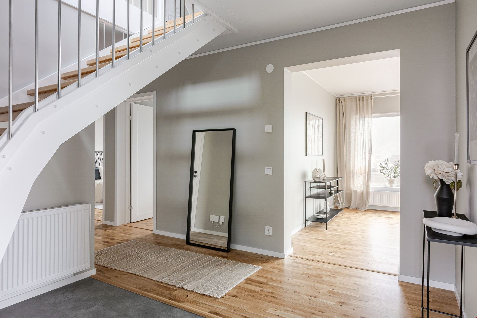 När du kommer in möts du av ett slitstarkt högtrycksgolv i nyansen Blackstone. På entréplan ligger två av husets fem sovrum, tillsammans med ett av de två badrummen som är helkaklat i York greige med komfortvärme, duschhörna, kommod och handdukstork. Övervåningen bjuder på ytterligare tre sovrum, ett badrum med dagsljusinsläpp samt ett allrum med takkupa – perfekt som lekrum, filmhörna eller hemmakontor.