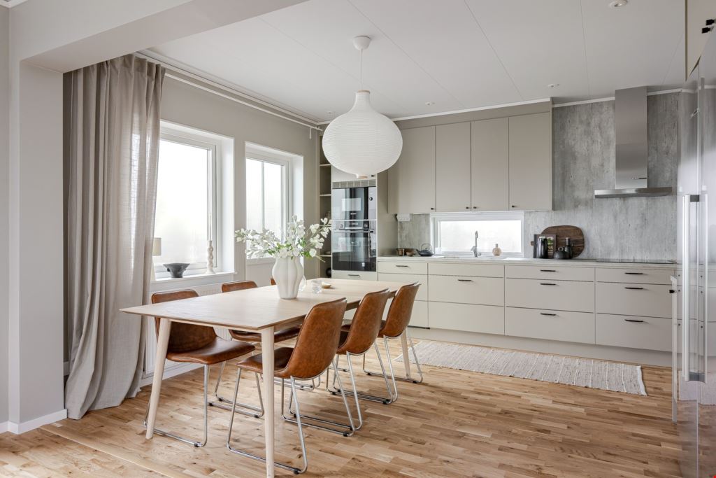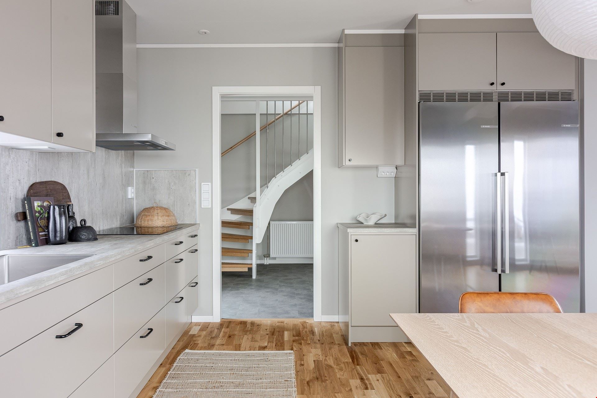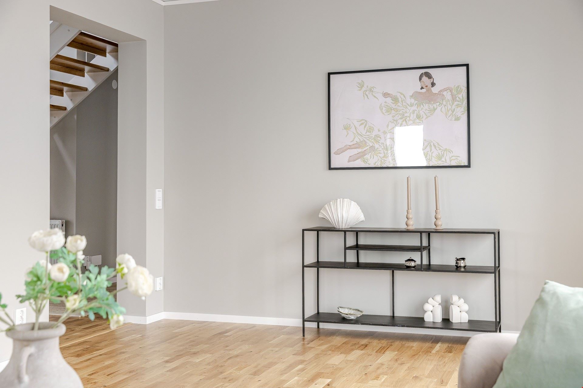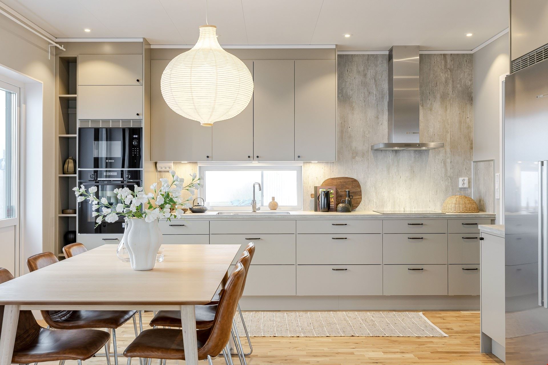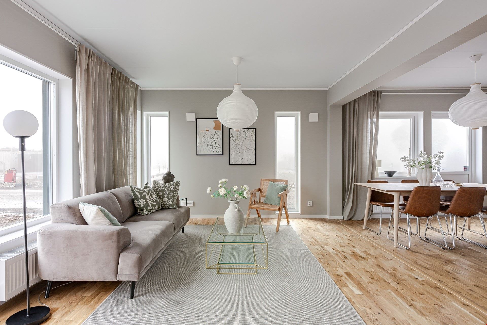 Huset är smakfullt färdigställt och bjuder på 160 smart planerade kvadratmeter. Här finns hela fem sovrum, två badrum, ett mysigt allrum på övre plan samt ett ljust vardagsrum med direkt utgång till tomten. Köket är från Vedum och inrett med vita ´luckor och rostfria handtag, Cento-bänkskiva och vita vitvaror från Bosch – allt nytt och klart. Groventrén är praktiskt utrustad med tvättmaskin, tvättho och frånluftsvärmepump, och ansluter direkt till tvättstugan.