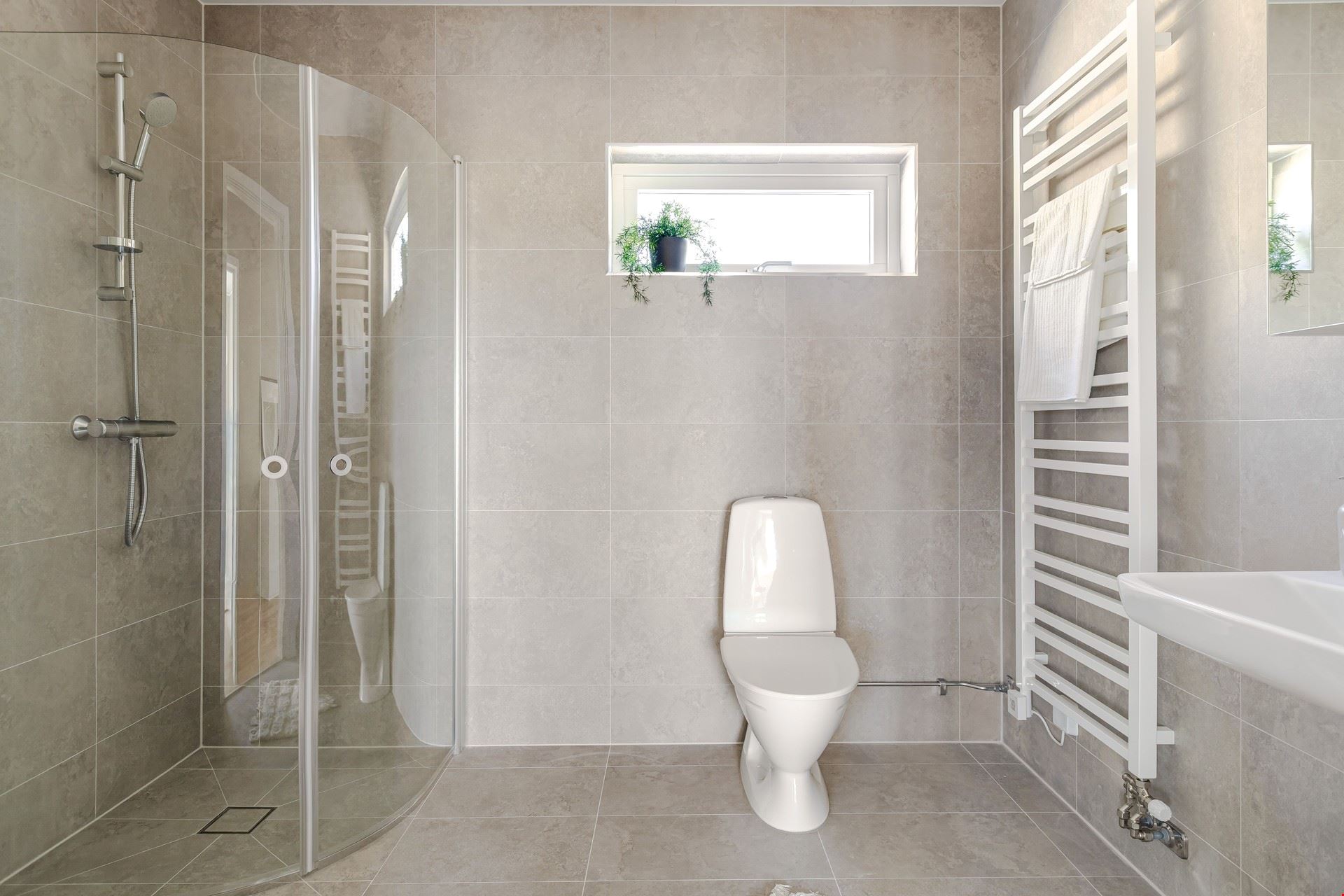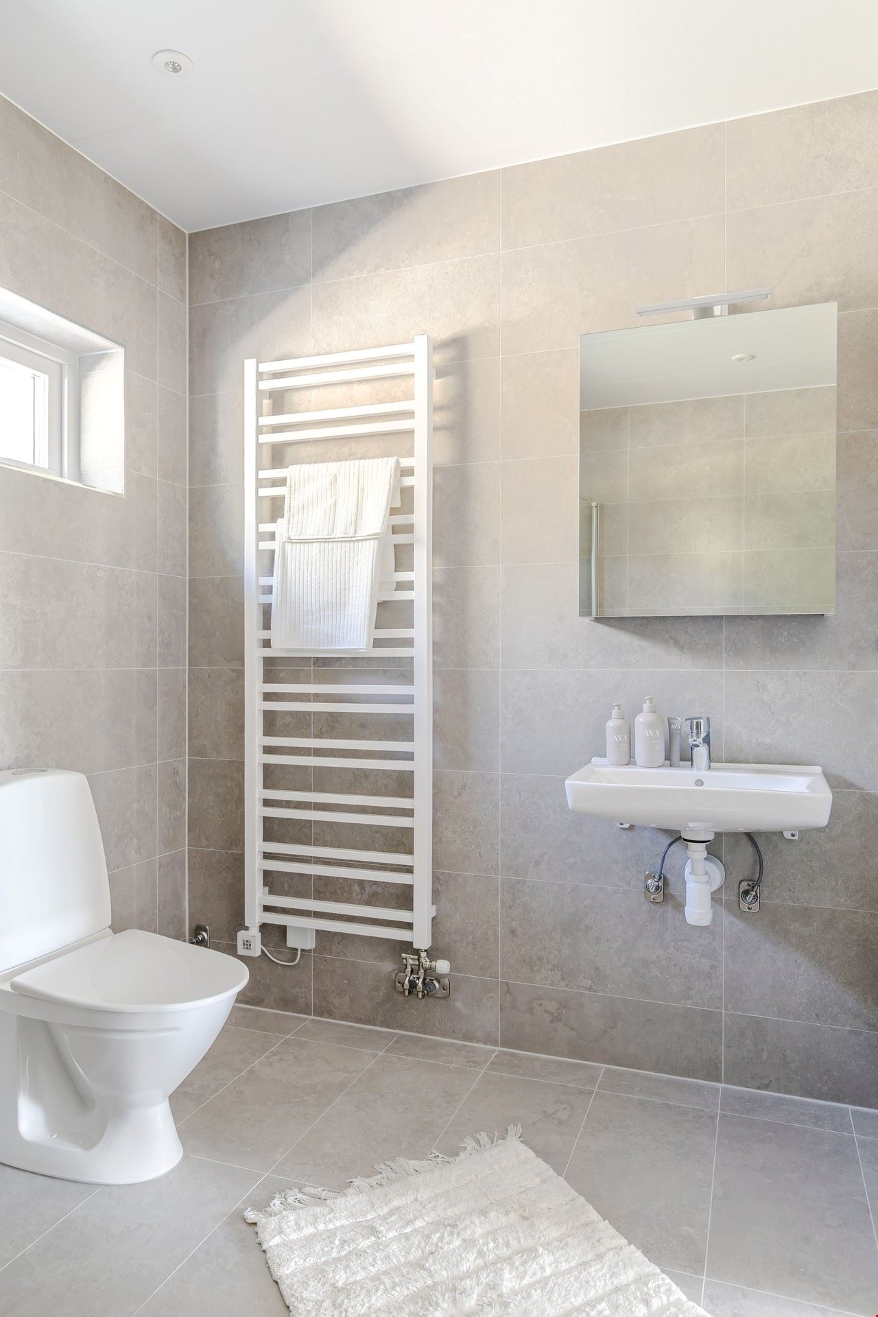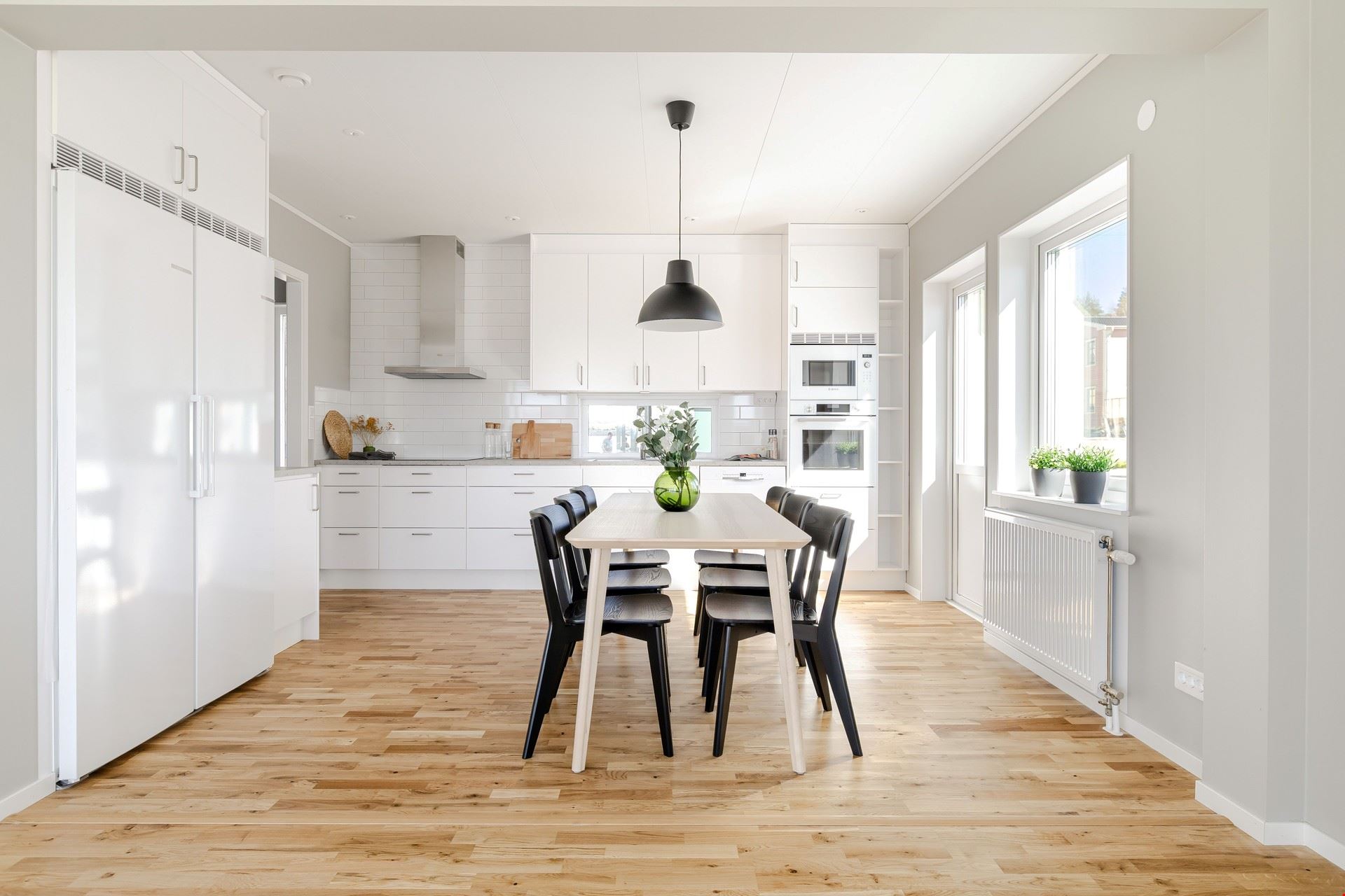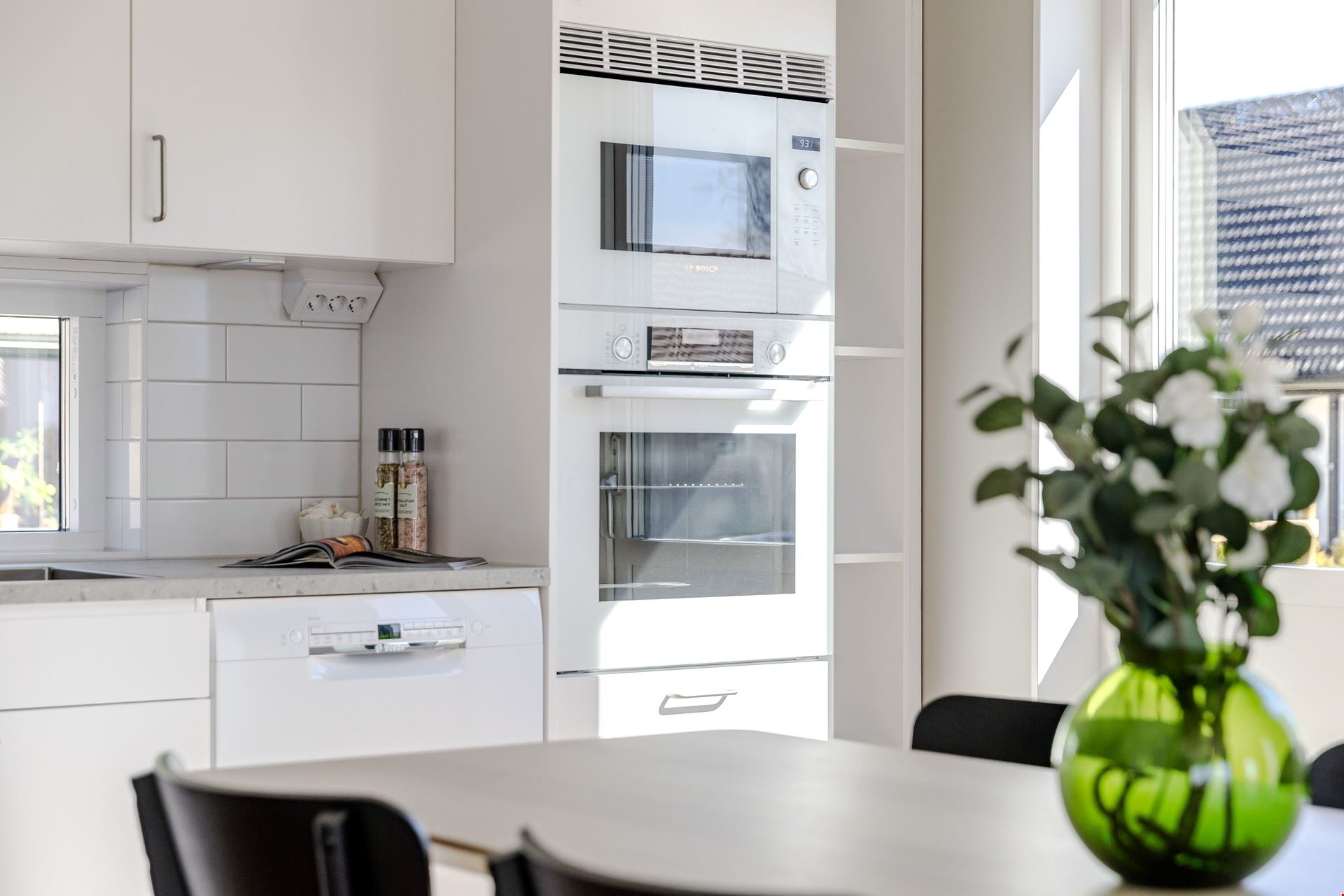 Köket kommer från Vedum med vita luckor, rostfria handtag och Cento-bänkskiva. Vitvaror från Bosch är redan på plats. Badrummet på entréplan är helkaklat i York greige och utrustat med komfortvärme, duschhörna, kommod och handdukstork.