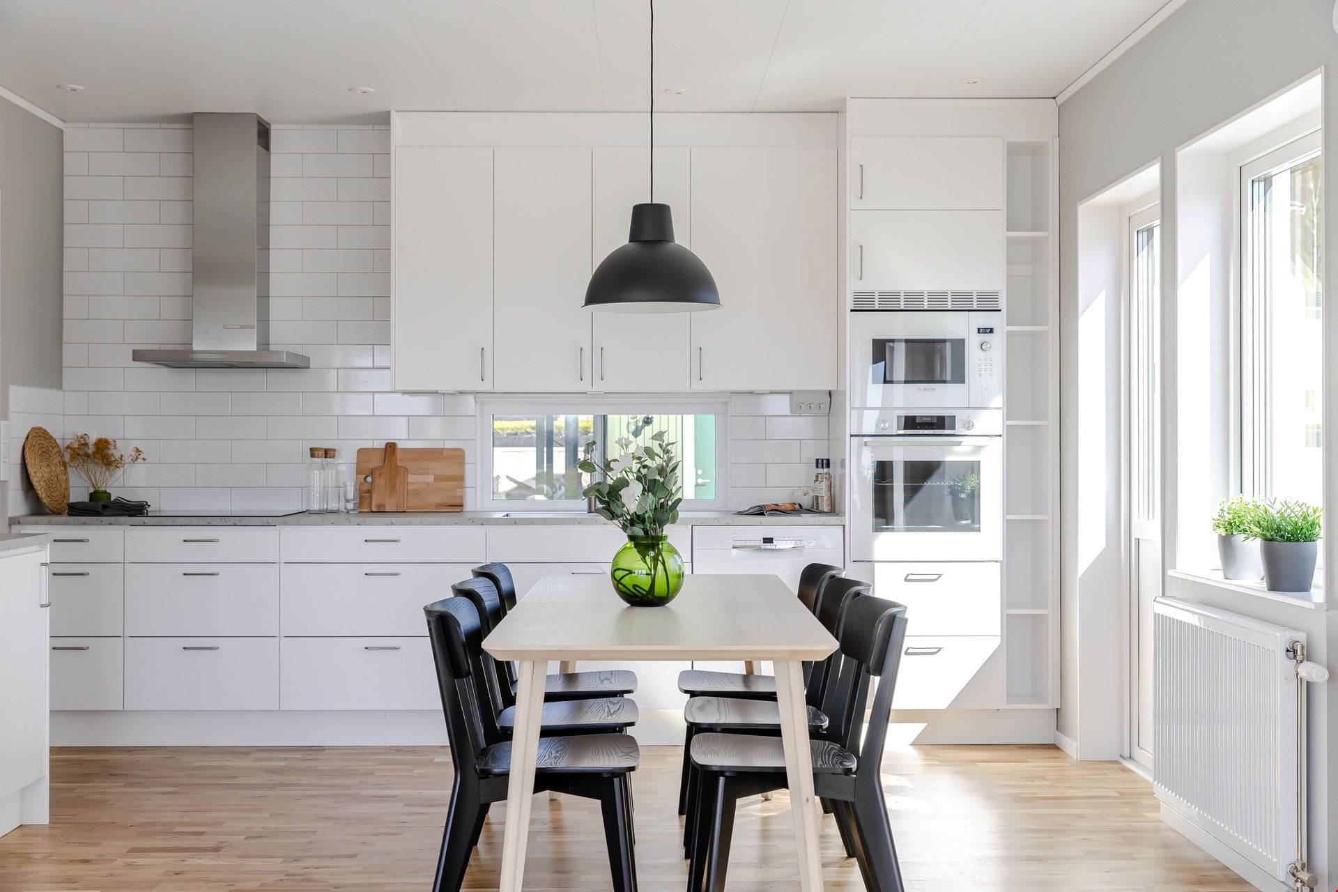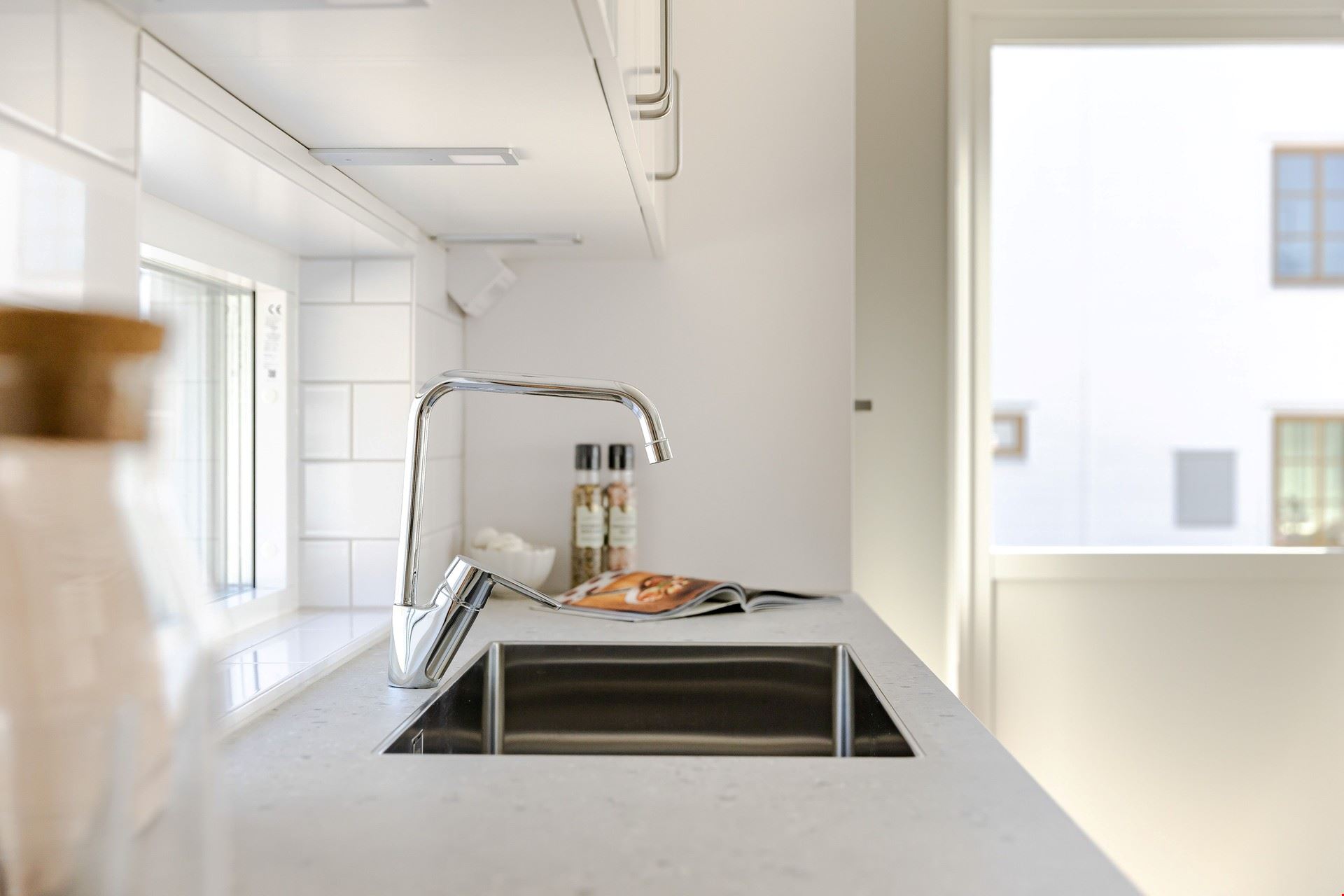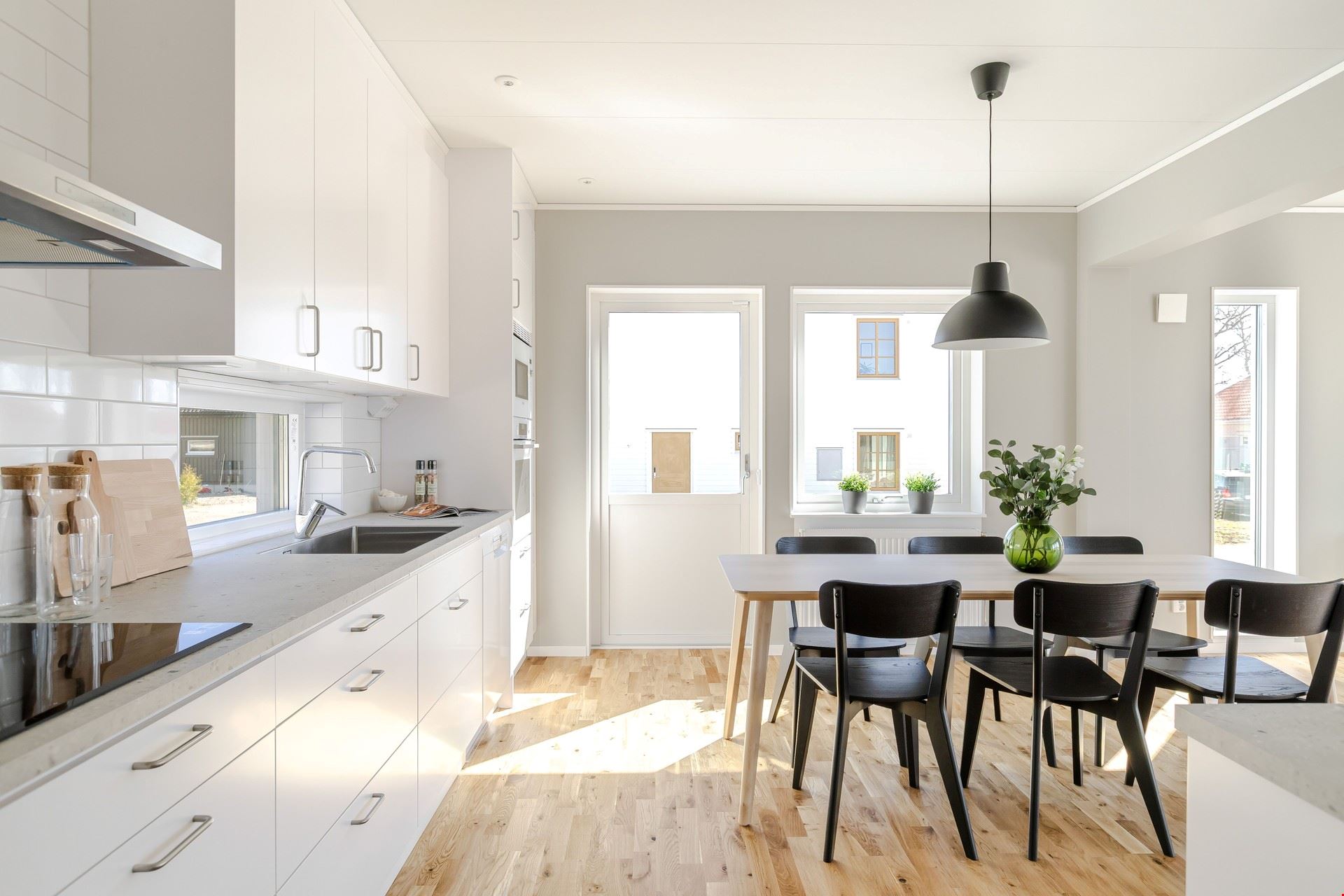 Köket kommer från Vedum med vita luckor, rostfria handtag och Cento-bänkskiva. Vitvaror från Bosch är redan på plats. Badrummet på entréplan är helkaklat i York greige och utrustat med komfortvärme, duschhörna, kommod och handdukstork.